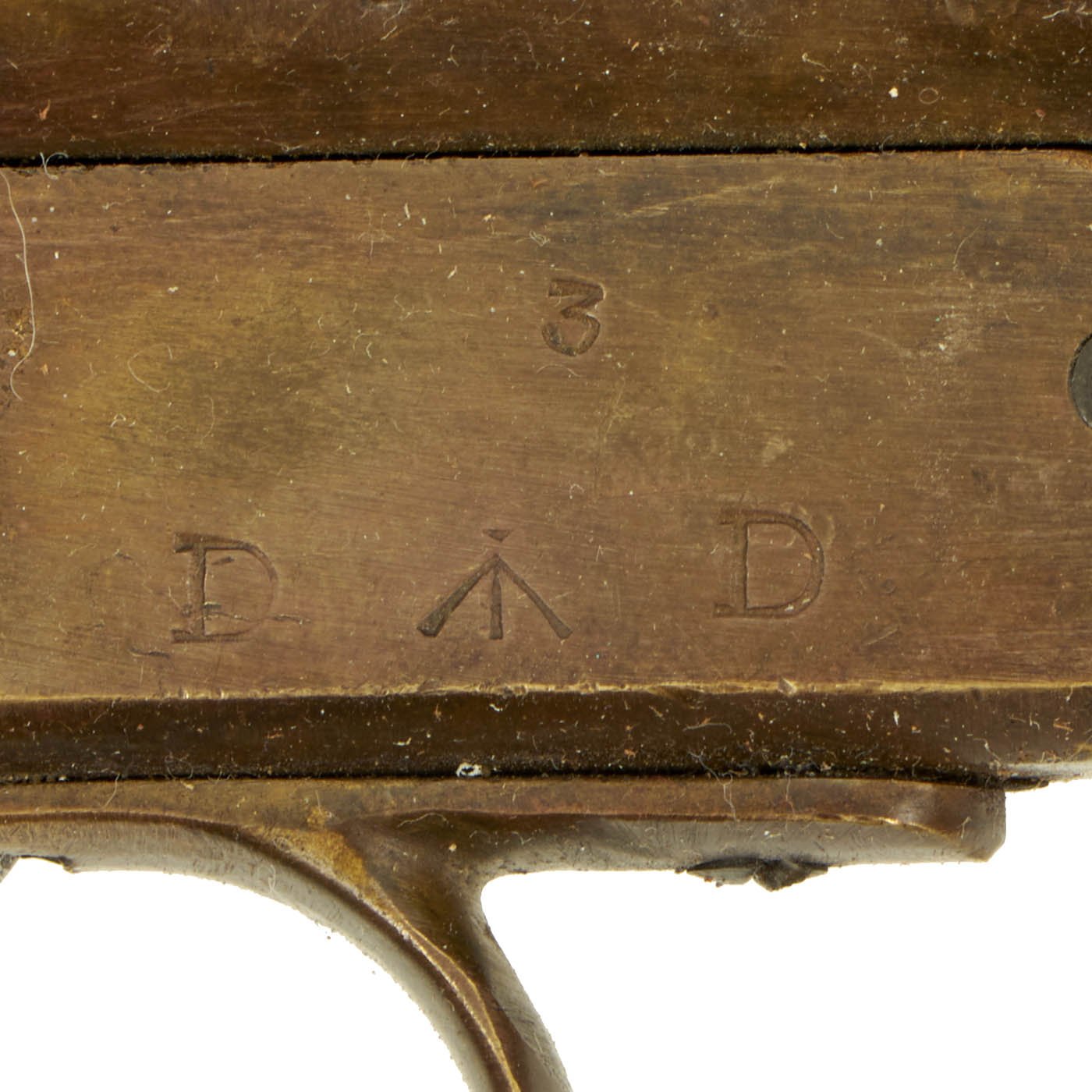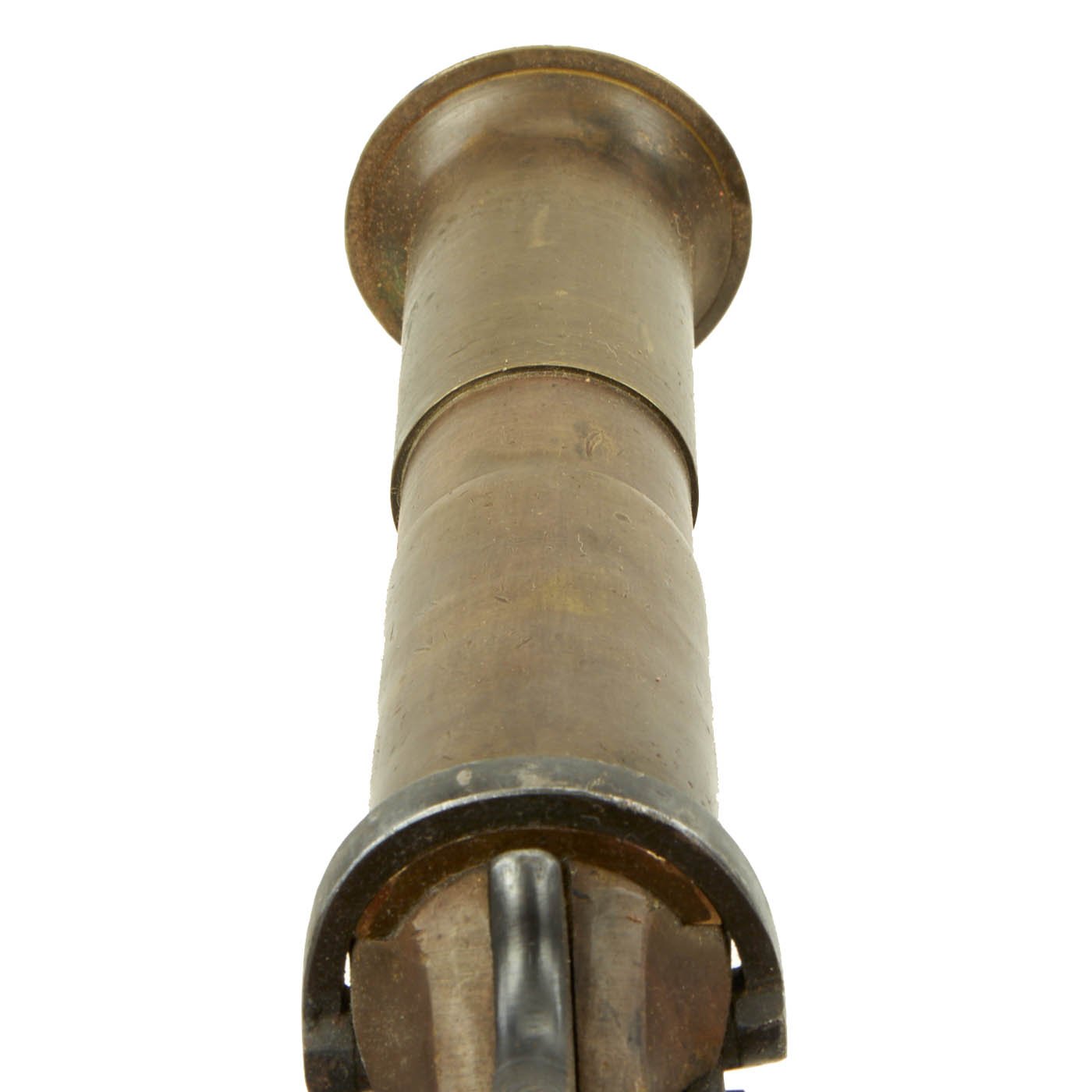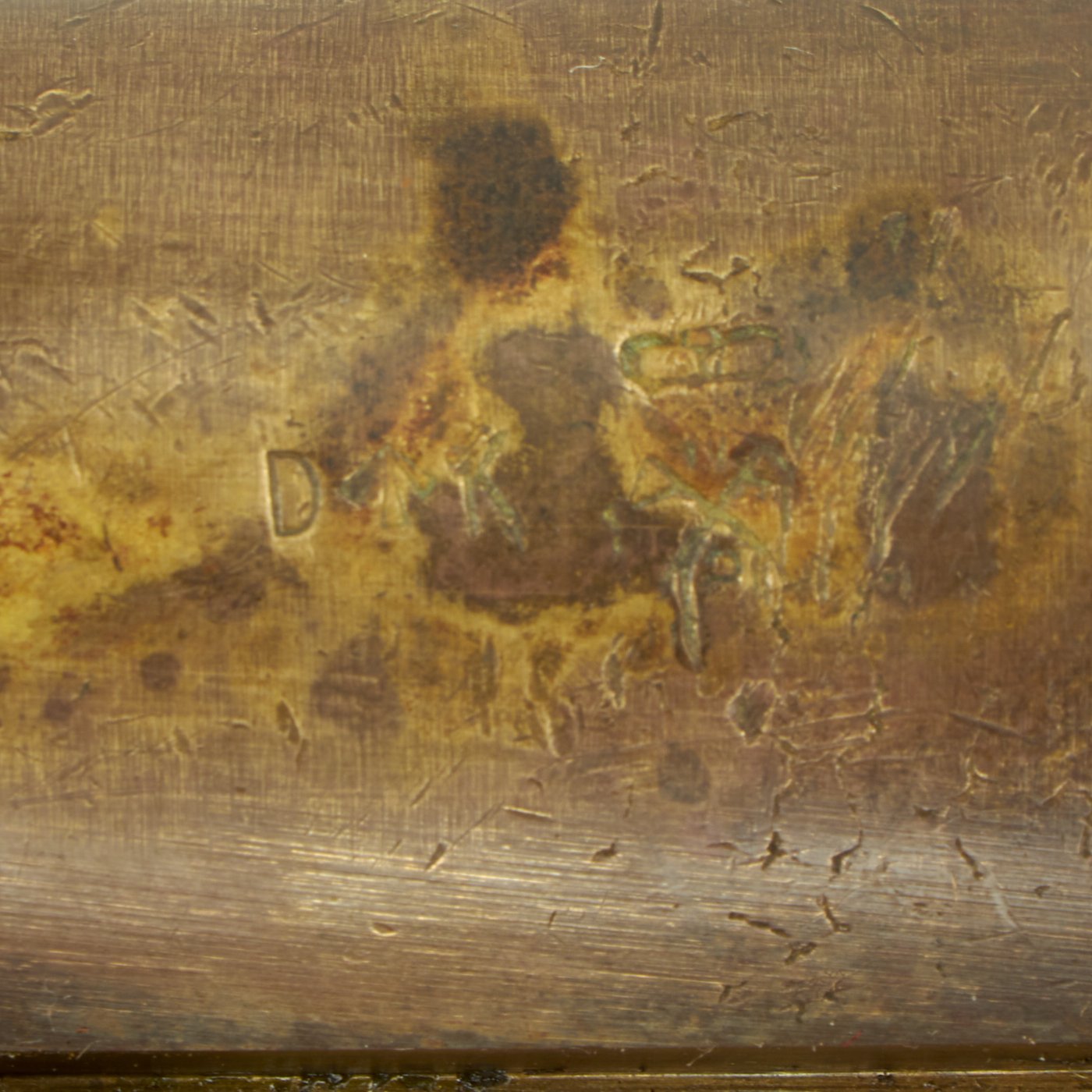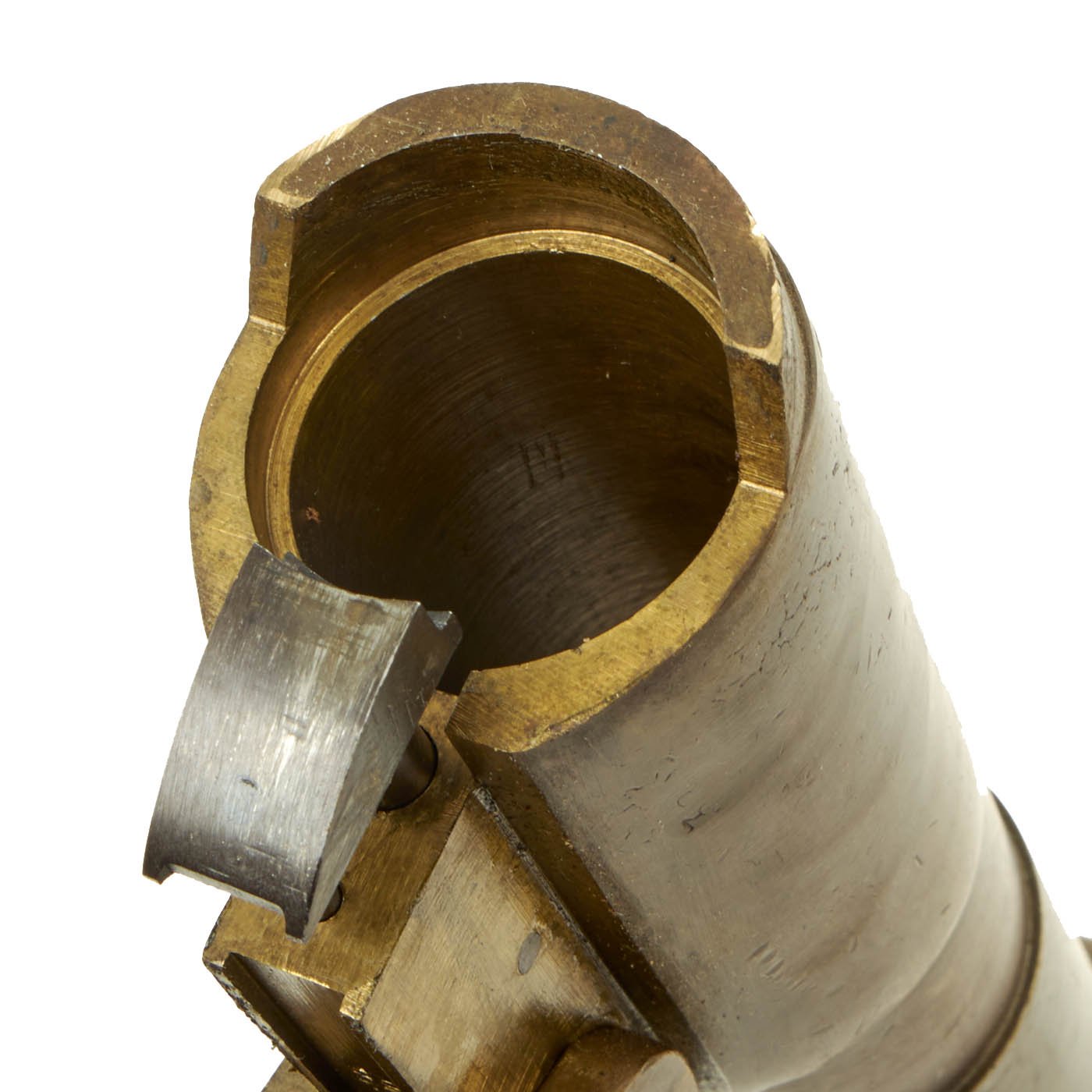 The signal pistol is in very good used condition. All of the markings on the frame and barrel remain crisp and clear. The brass frame components have a nice used look, with some mustard patina around the muzzle. The steel components do not show any rust or pitting, and the trigger and hammer have almost all of the original bluing present.