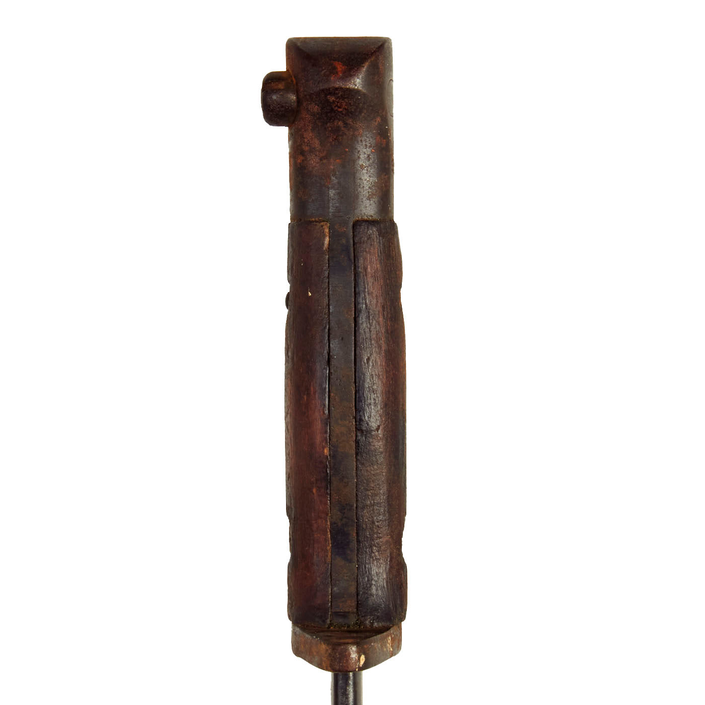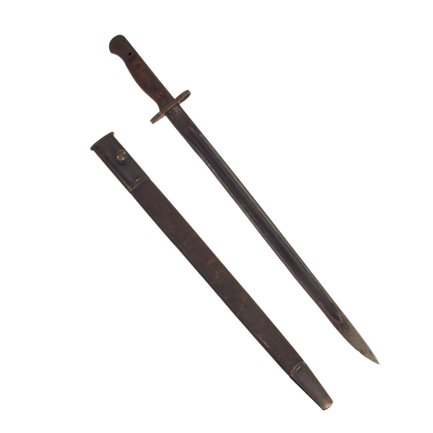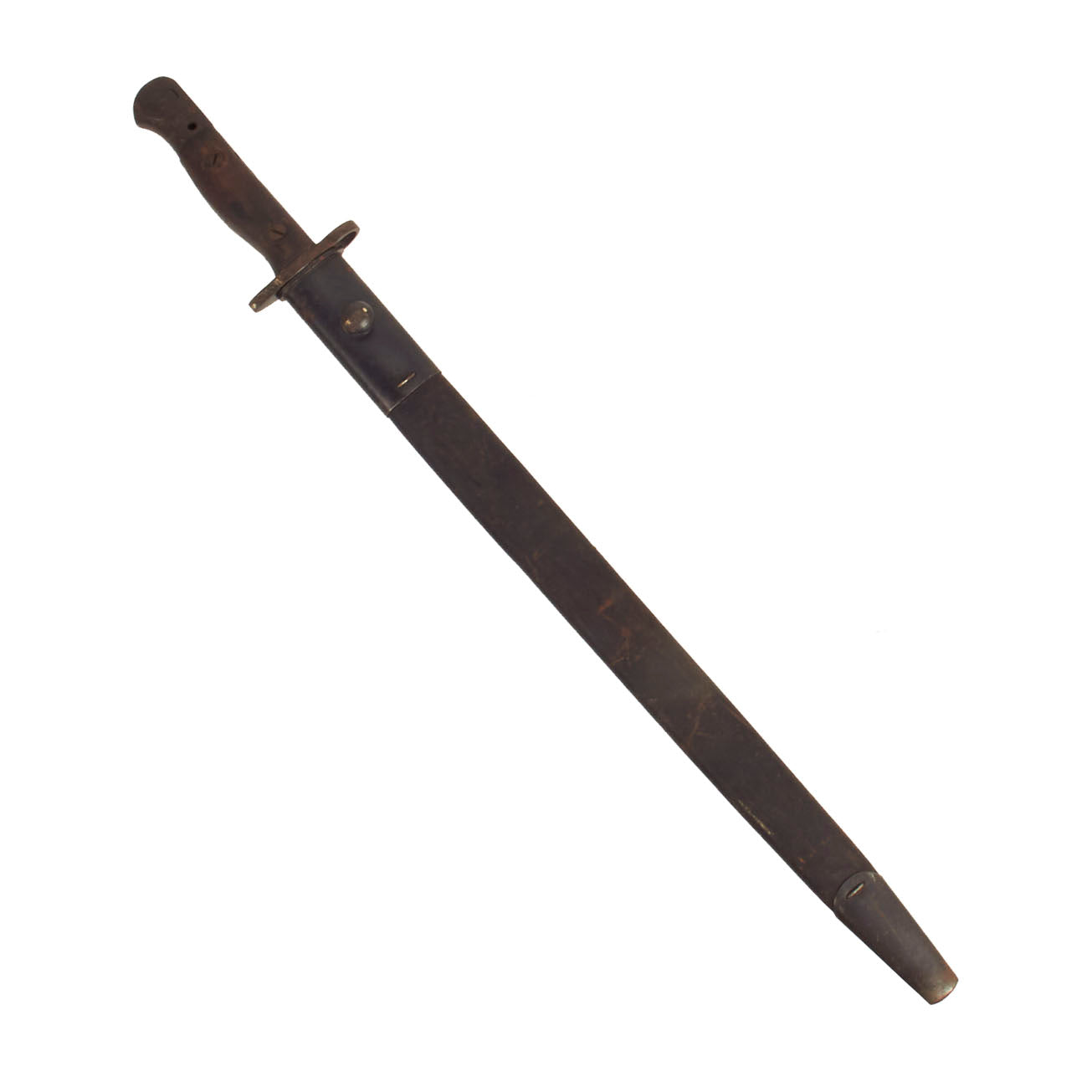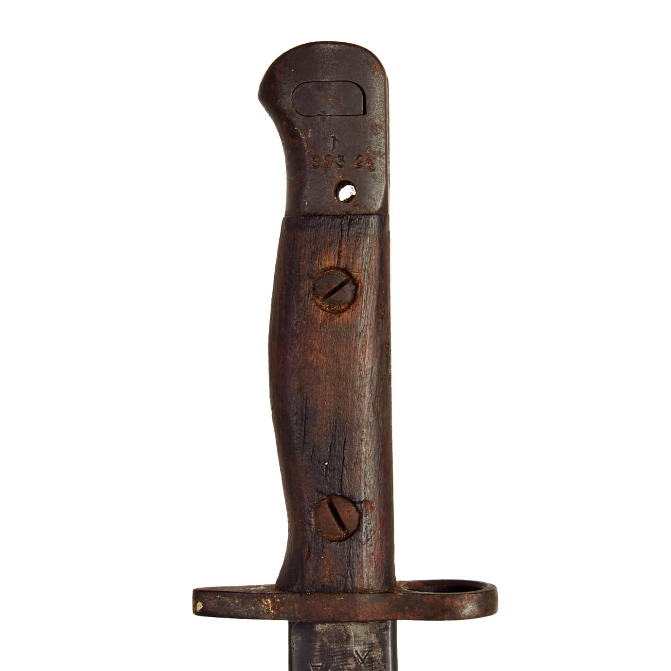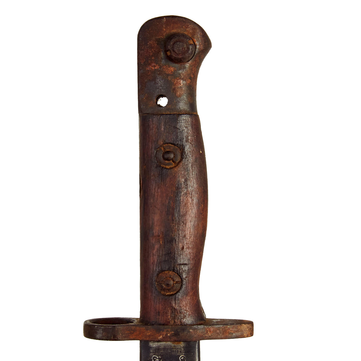 Original Item: Only One Available. Recently purchased at a military auction, this is an interesting Australian manufactured P-1907 Bayonet for the No.1 MkIII Enfield rifle, often called the SHT.LE, SMLE, S.M.L.E., "Smelly" etc. This example was produced in Australia during WWII, with an original blade length of 17 inches. The Japanese forces in the Pacific still used longer bayonets, so the British, like the U.S. forces, kept the longer bayonets.