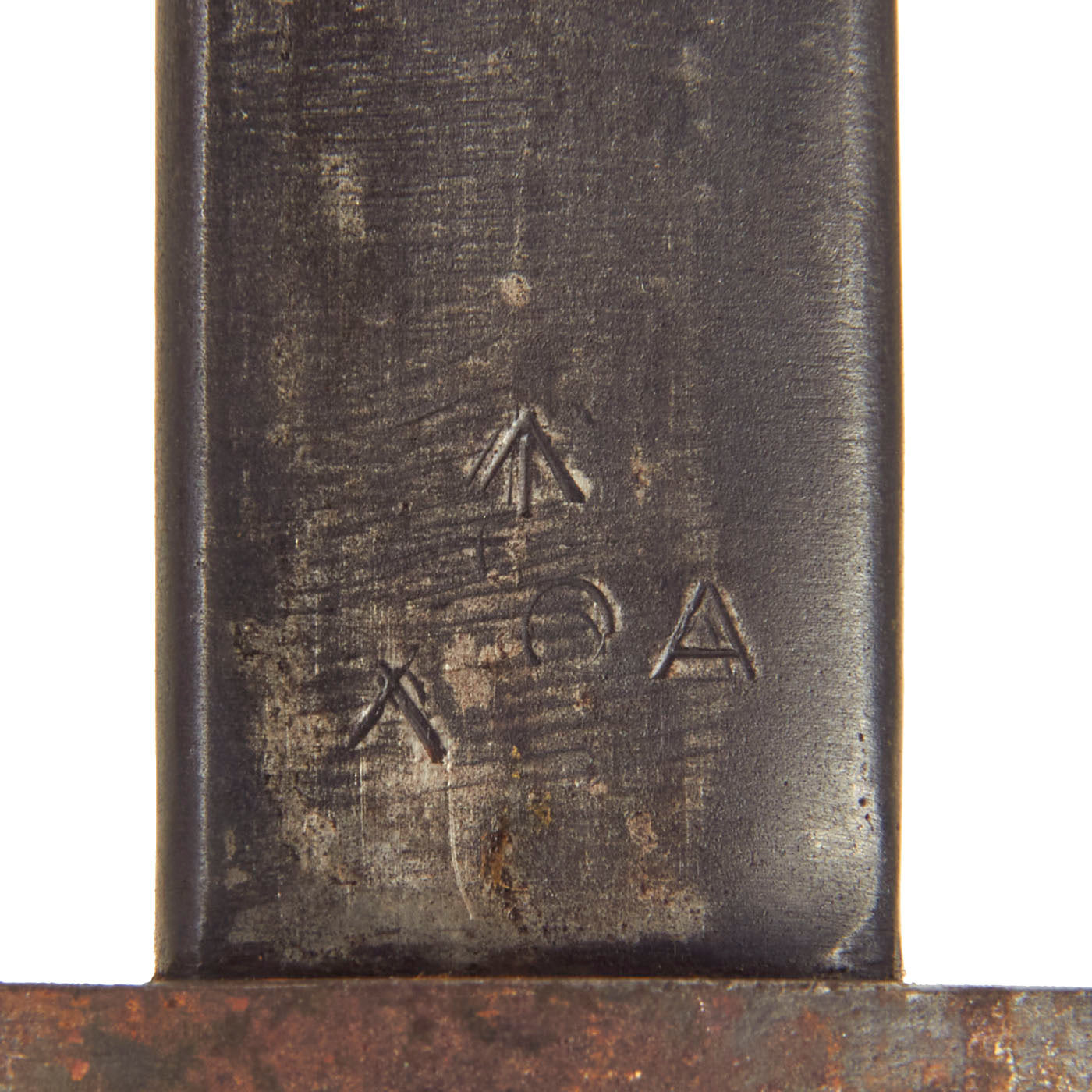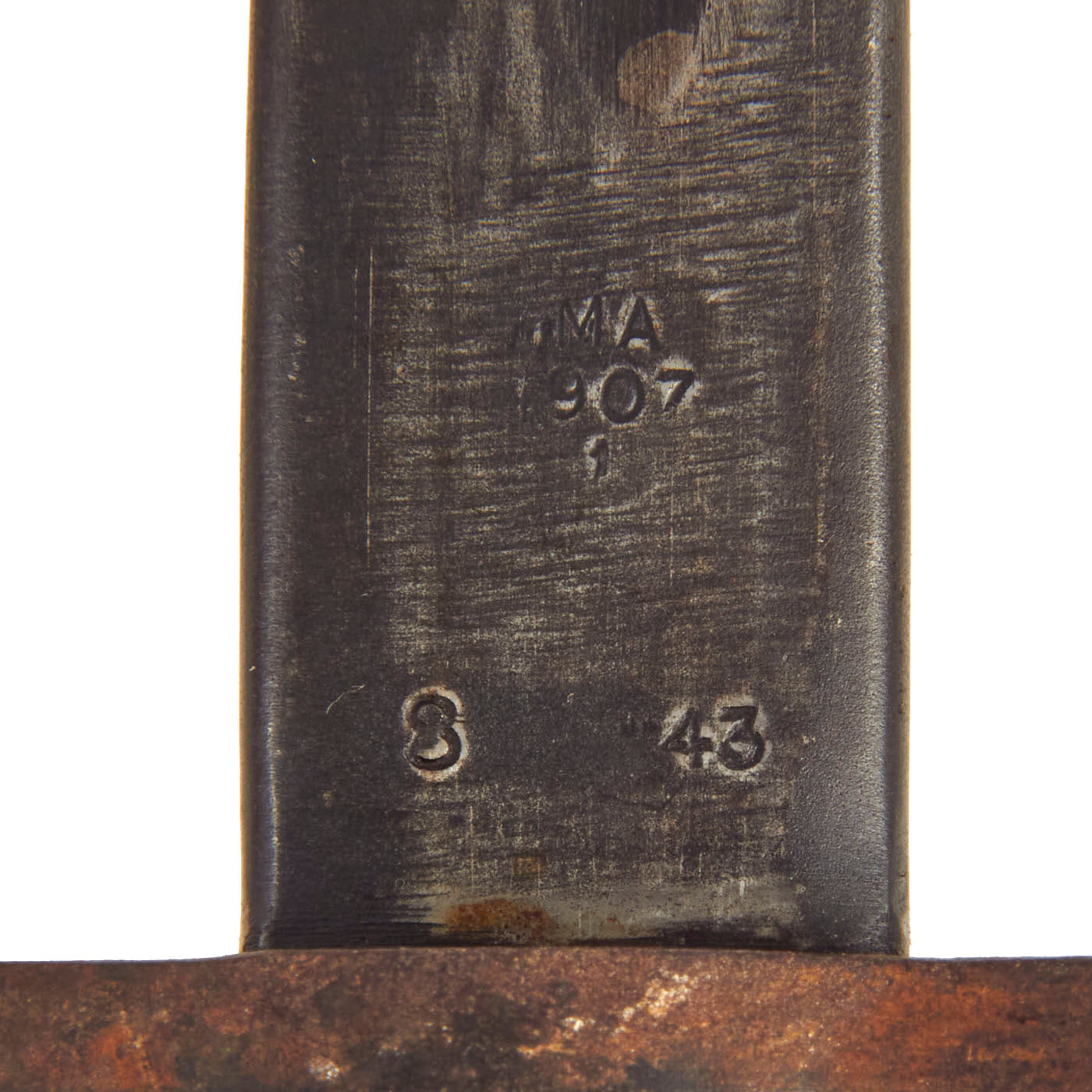 The blade markings on this example are still mostly visible, with MA / 1907 / I above a 8 ' 43 date on the ricasso. "MA" is the code for the Lithgow Armory in Australia, and the bayonet was made in August 1943. The other side is marked with the British "Broad Arrow" proof over a large X blade bending mark next to O.