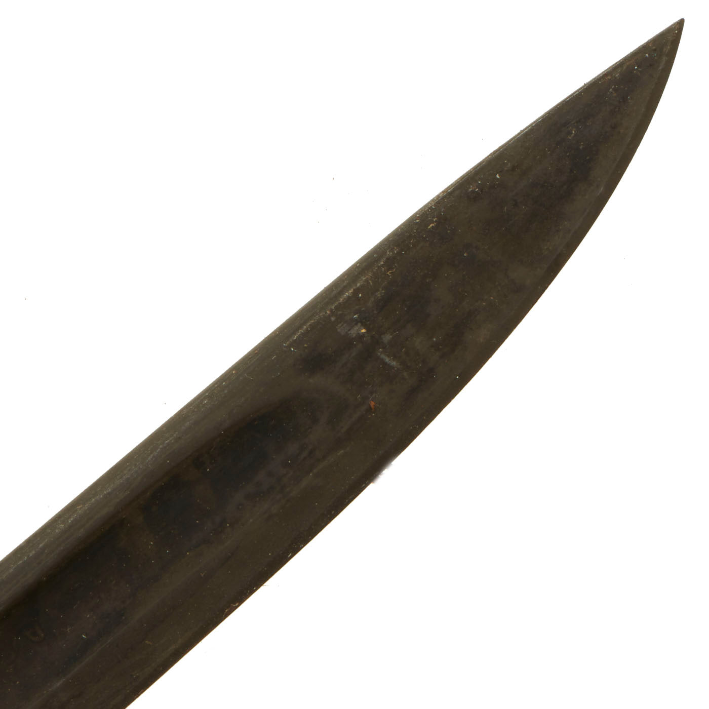 The blade markings on this example are still mostly visible, with MA / 1907 / I above a 3 ' 43 date on the ricasso. "MA" is the maker mark for Mangrovite Arsenal in Australia, and the bayonet was made in April 1943. The other side is marked with the British "Broad Arrow" proof over a large X blade bending mark next to O.