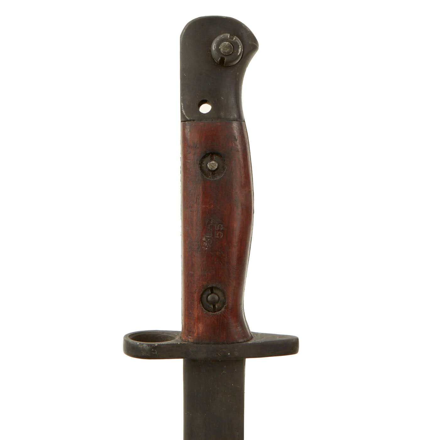 The pommel of this bayonet shows it was matched to a rifle and is marked D/30503. There is an "R" on the hilt spine of this example, so it does appear to have been refurbished for use in the 1950s. Blade condition is good, almost unissued condition. The grips are in very good condition, with a nice color and are stamped SLAZ/55 for being produced in 1955.