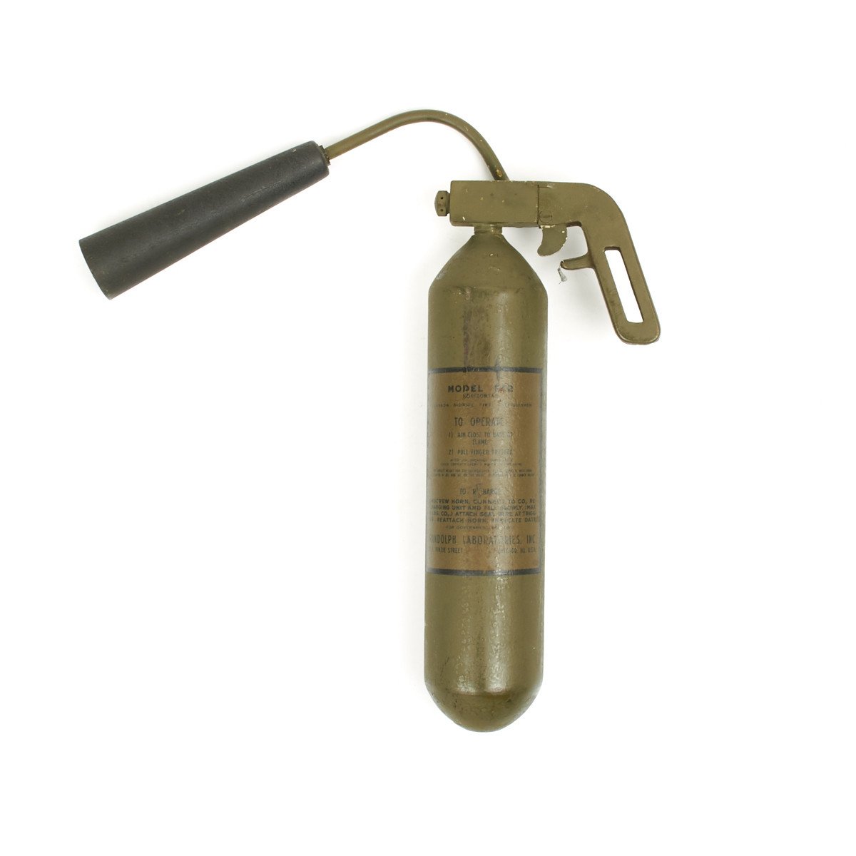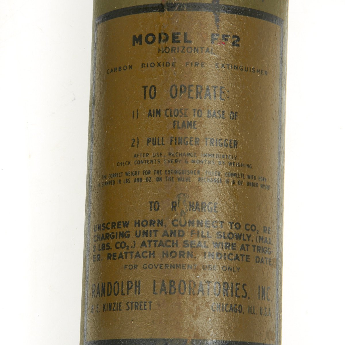 Original Item: Only One Available. This is a totally original late WW2 issue Model FF2 Fire-extinguisher manufactured by Randolph Laboratories of Chicago, Illinois. It is of steel construction and stands 16 tall with a circumference of 14 inches. The label is 90% intact and reads:
