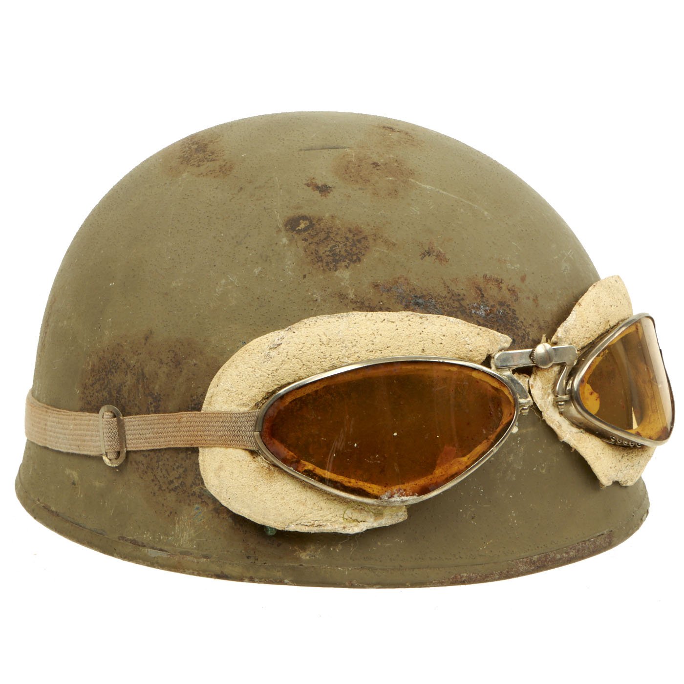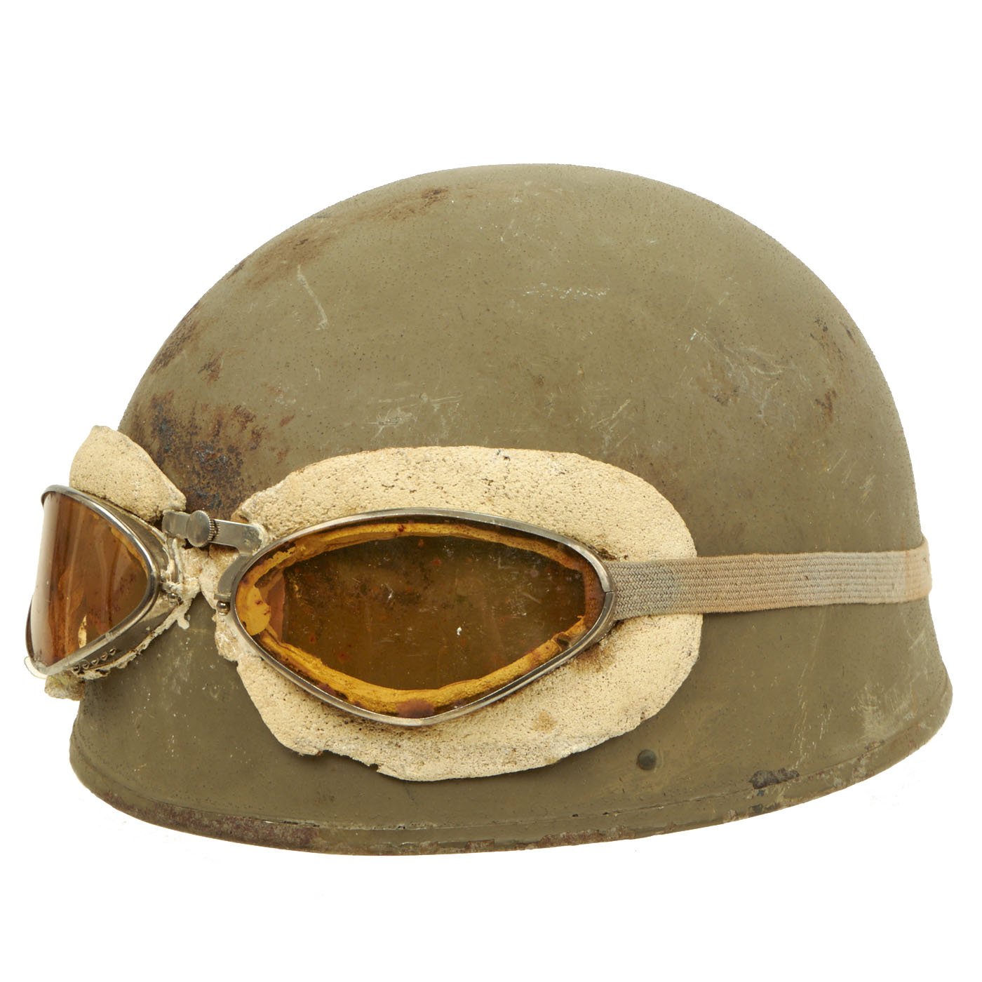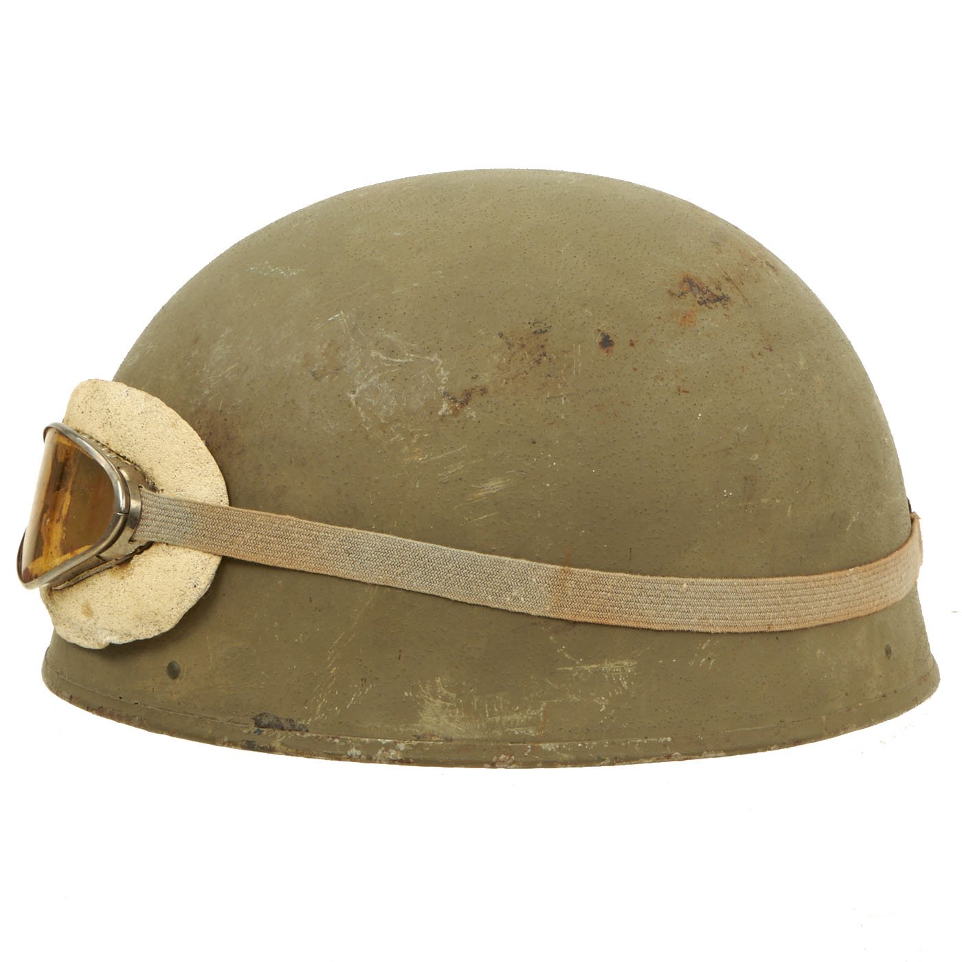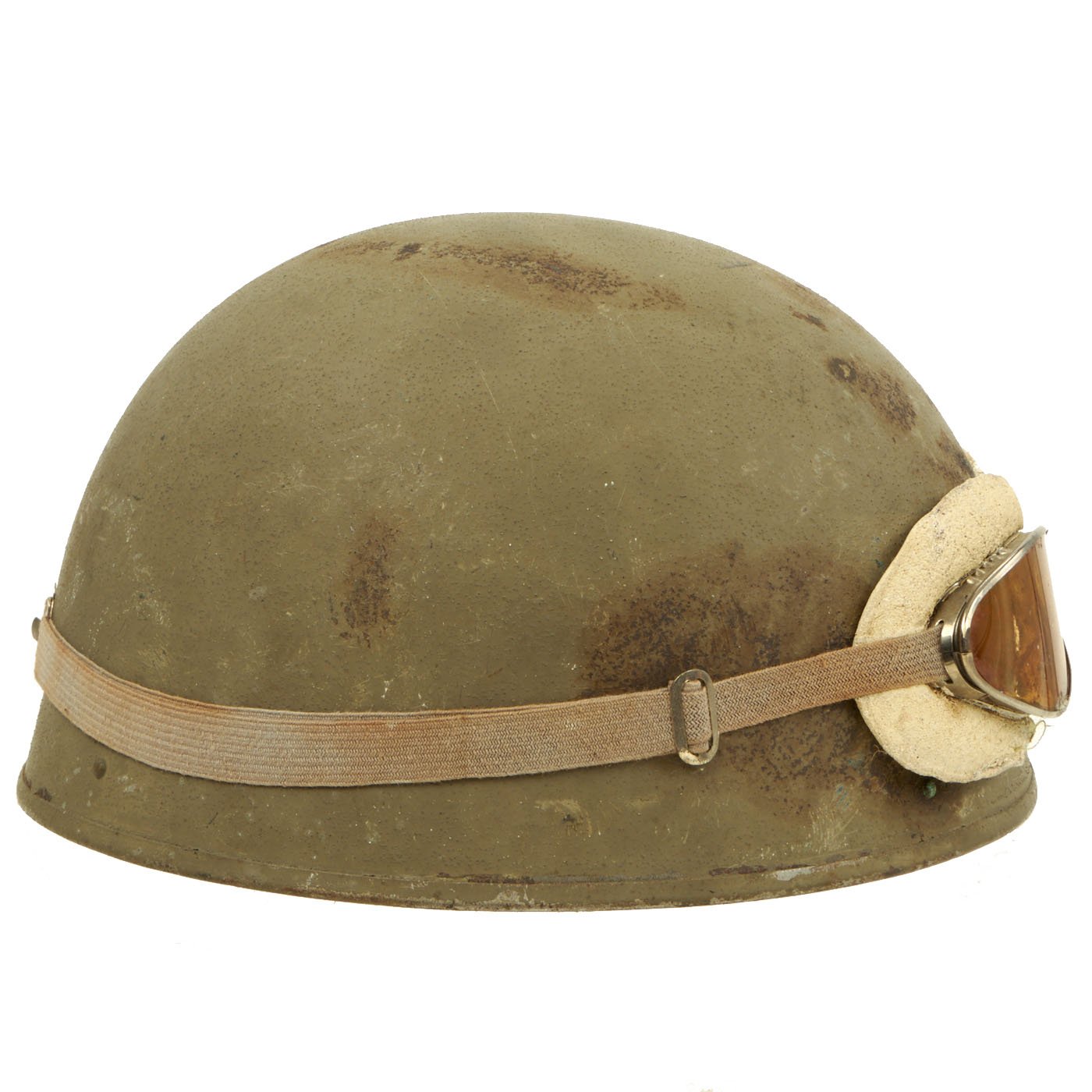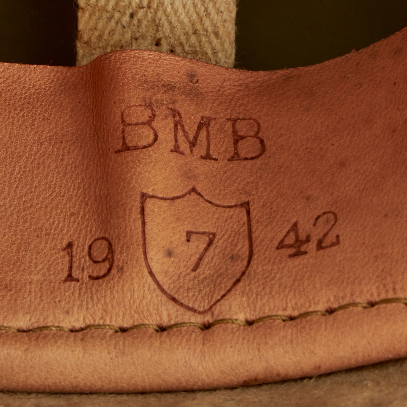 Original Item: Only One Available. This is a very good condition original WWII British MK I Dispatch Rider helmet. Shell has original paint with no major dents or dings that we can see, just a bit of scuffing and flaking, with a few scratches on the top. Leather liner and ear flaps are soft and supple, though there is a bit of oxidation around the buttons, eyelets and buckle. The leather liner is nicely marked with BMB and dated 1942, and is marked with size 7 inside a shield. BMB is the marking for Briggs Motor Bodies Ltd., who also made Brodie and other helmets for the British war effort. The wool felt ear padding is still partly present, which is rare, as it degrades easily. The chin strap snap still works, as does the buckle, and the rear lacing is intact. Also included are a pair of wartime German driving and flying goggles in fair condition, these were known SCHUTZBRILLEN FUR FLIEGER.