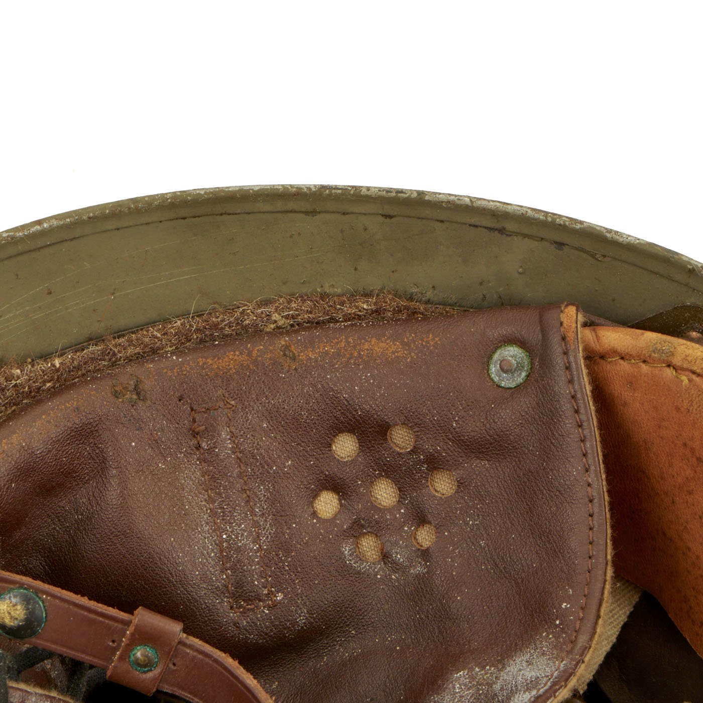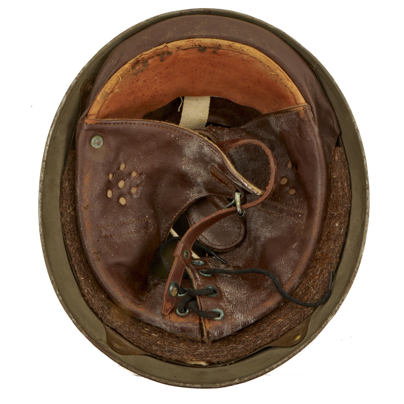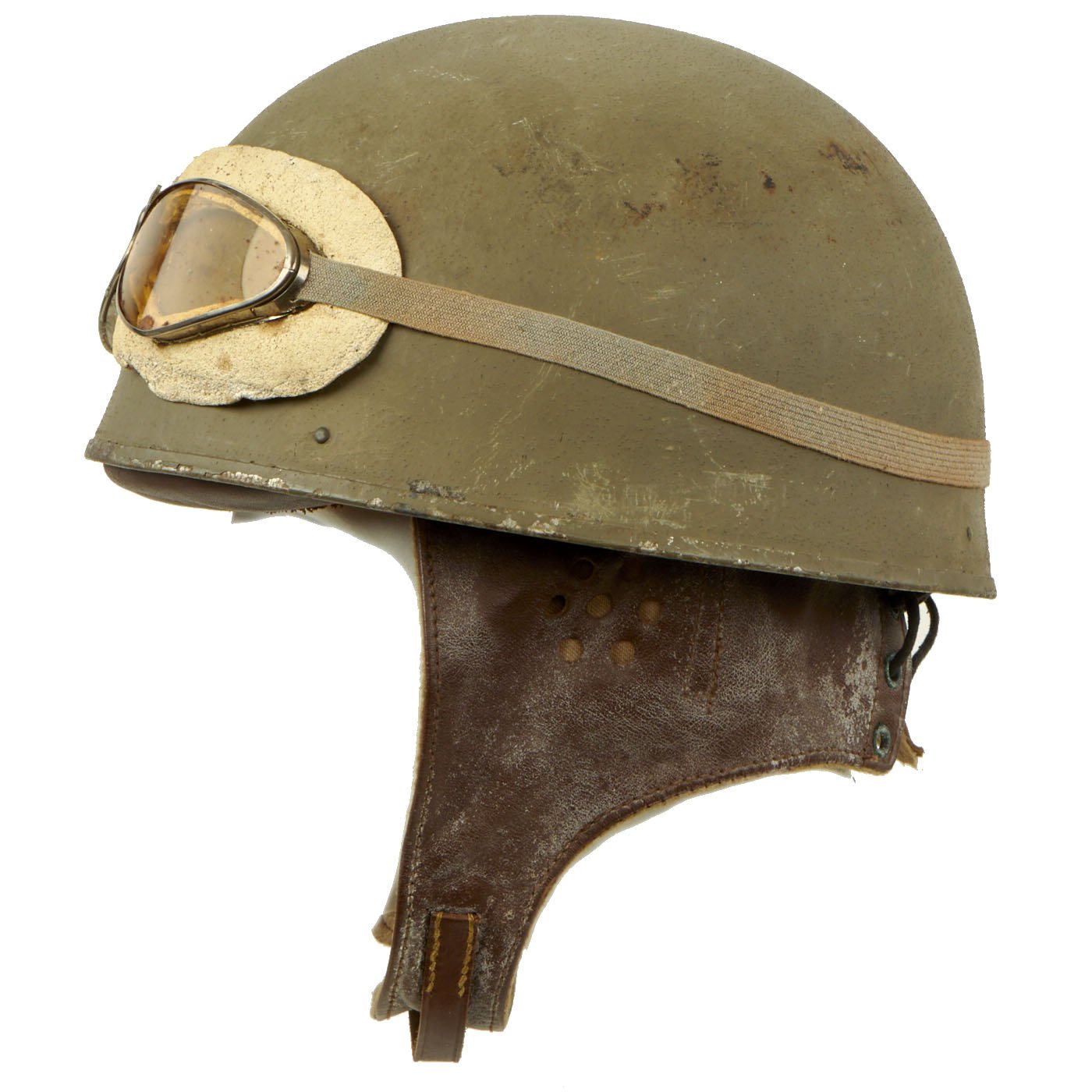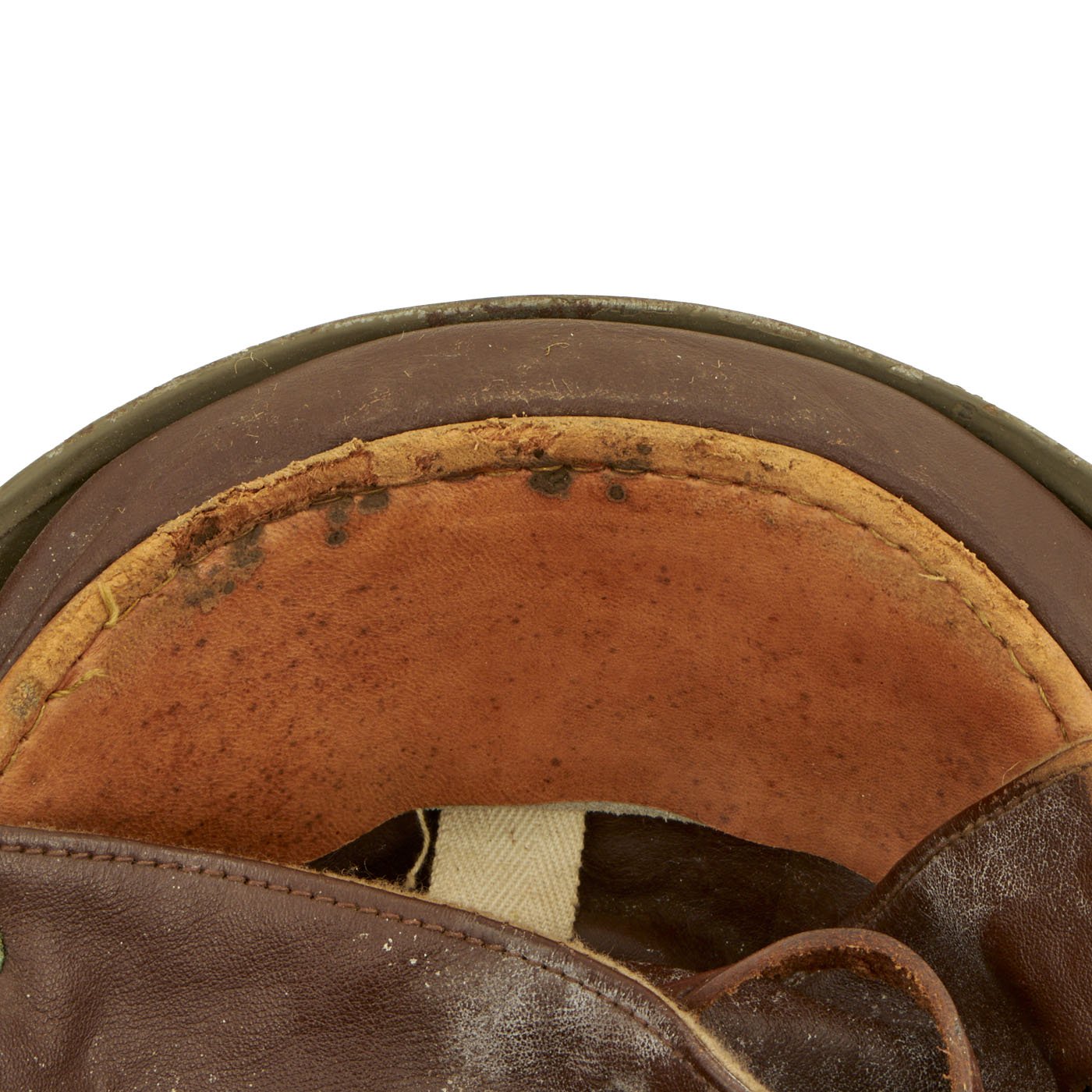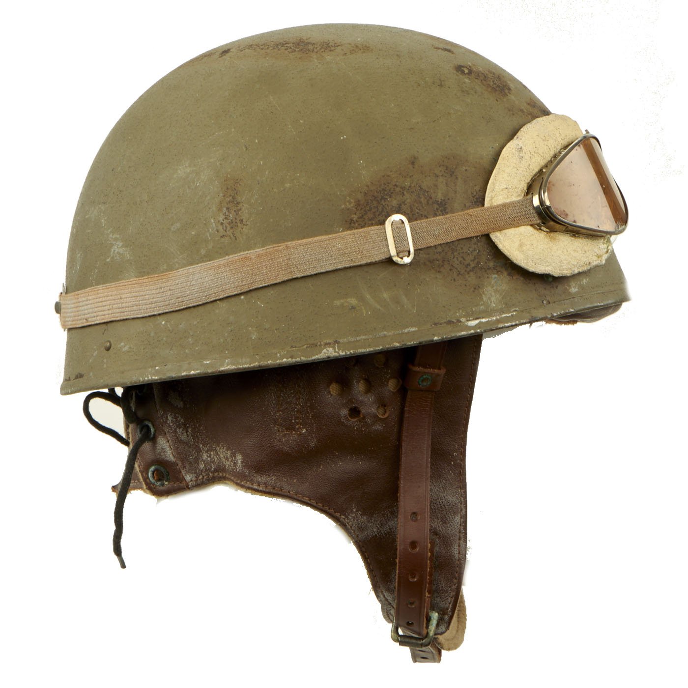 Original Item: Only One Available. This is a very good condition original WWII British MK I Dispatch Rider helmet. Shell has original paint with no major dents or dings that we can see, just a bit of scuffing and flaking, with a few scratches on the top. Leather liner and ear flaps are soft and supple, though there is a bit of oxidation around the buttons, eyelets and buckle. The leather liner is nicely marked with BMB and dated 1942, and is marked with size 7 inside a shield. BMB is the marking for Briggs Motor Bodies Ltd., who also made Brodie and other helmets for the British war effort. The wool felt ear padding is still partly present, which is rare, as it degrades easily. The chin strap snap still works, as does the buckle, and the rear lacing is intact. Also included are a pair of wartime German driving and flying goggles in fair condition, these were known SCHUTZBRILLEN FUR FLIEGER.