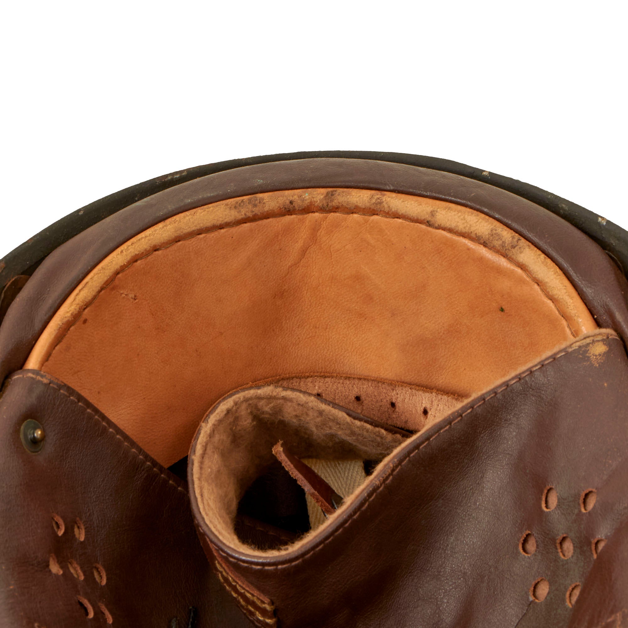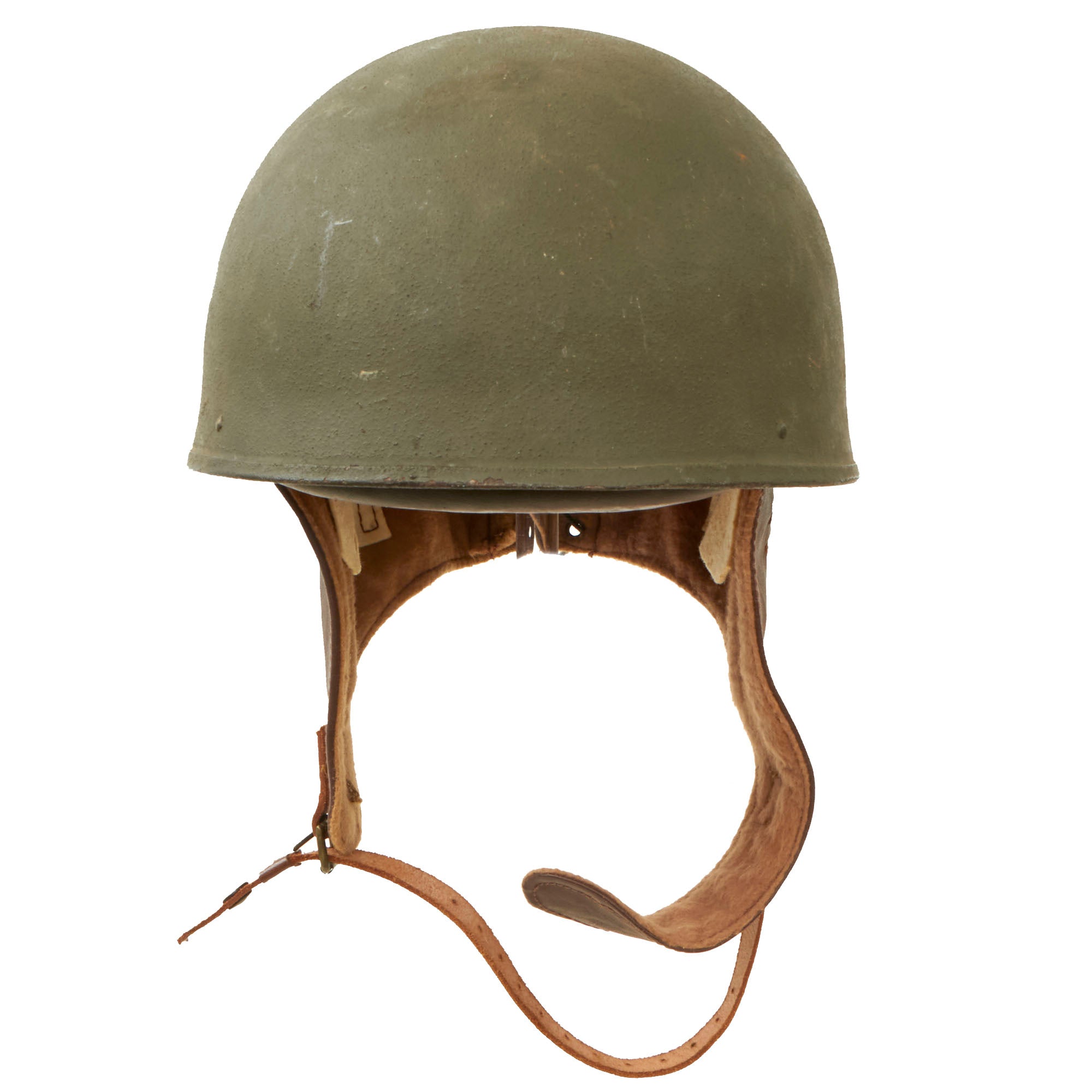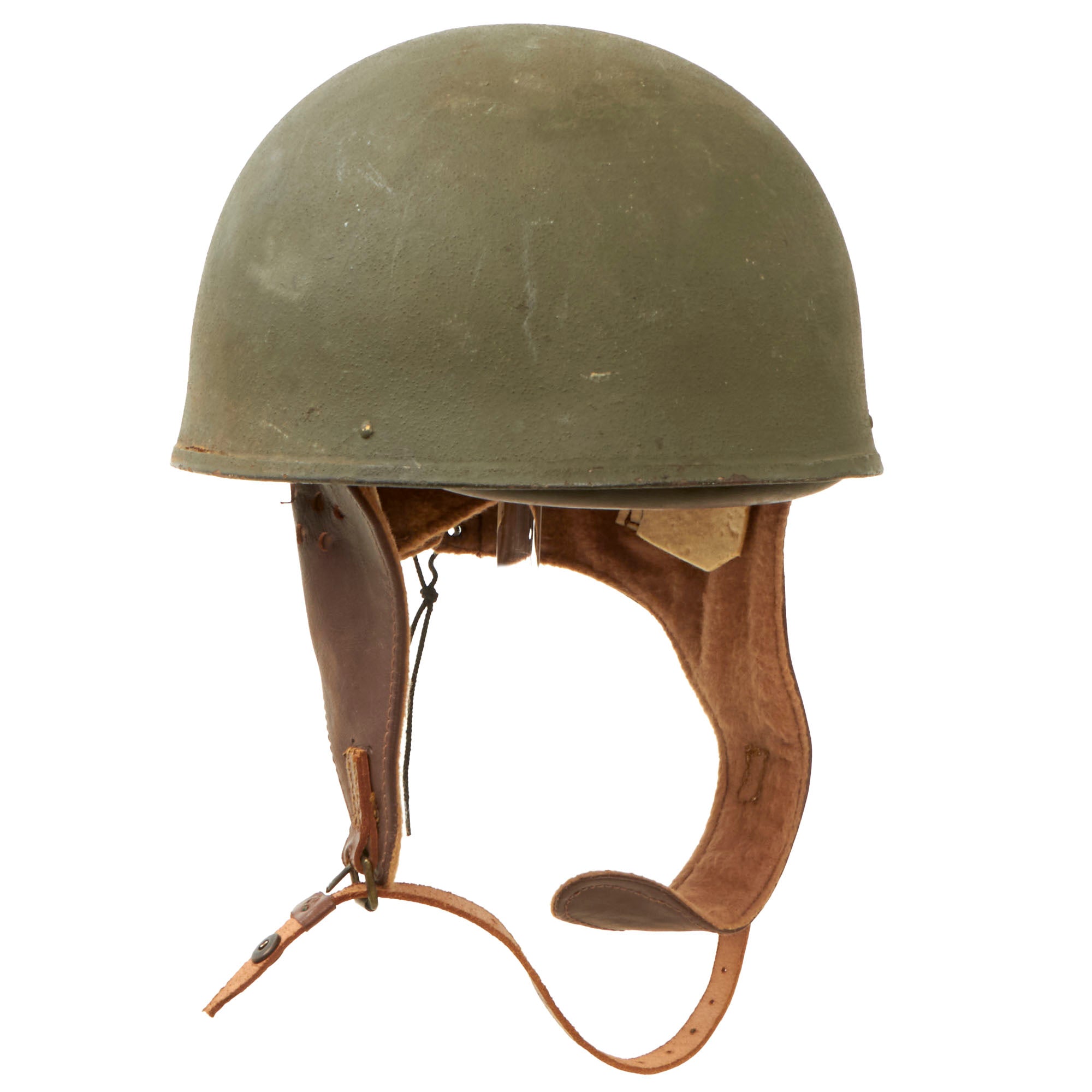 Original Item: Only One Available. This is an excellent condition original WWII British MK I Dispatch Rider helmet. The shell has original paint with no major dents or dings that we can see, just a bit of scuffing and flaking, with a few scratches on the top from storage. The Leather liner and ear flaps are soft and supple, though there is a bit of verdigris around the buttons, eyelets and buckle. The leather liner is nicely marked with BMB and dated 1945, and is marked with size 7 inside a shield. BMB is the marking for Briggs Motor Bodies Ltd., who also made Brodie and other helmets for the British war effort. The wool felt ear padding is still completely intact, which is rare, as it degrades easily. The chin strap snap still works, as does the buckle, and the rear lacing is intact.