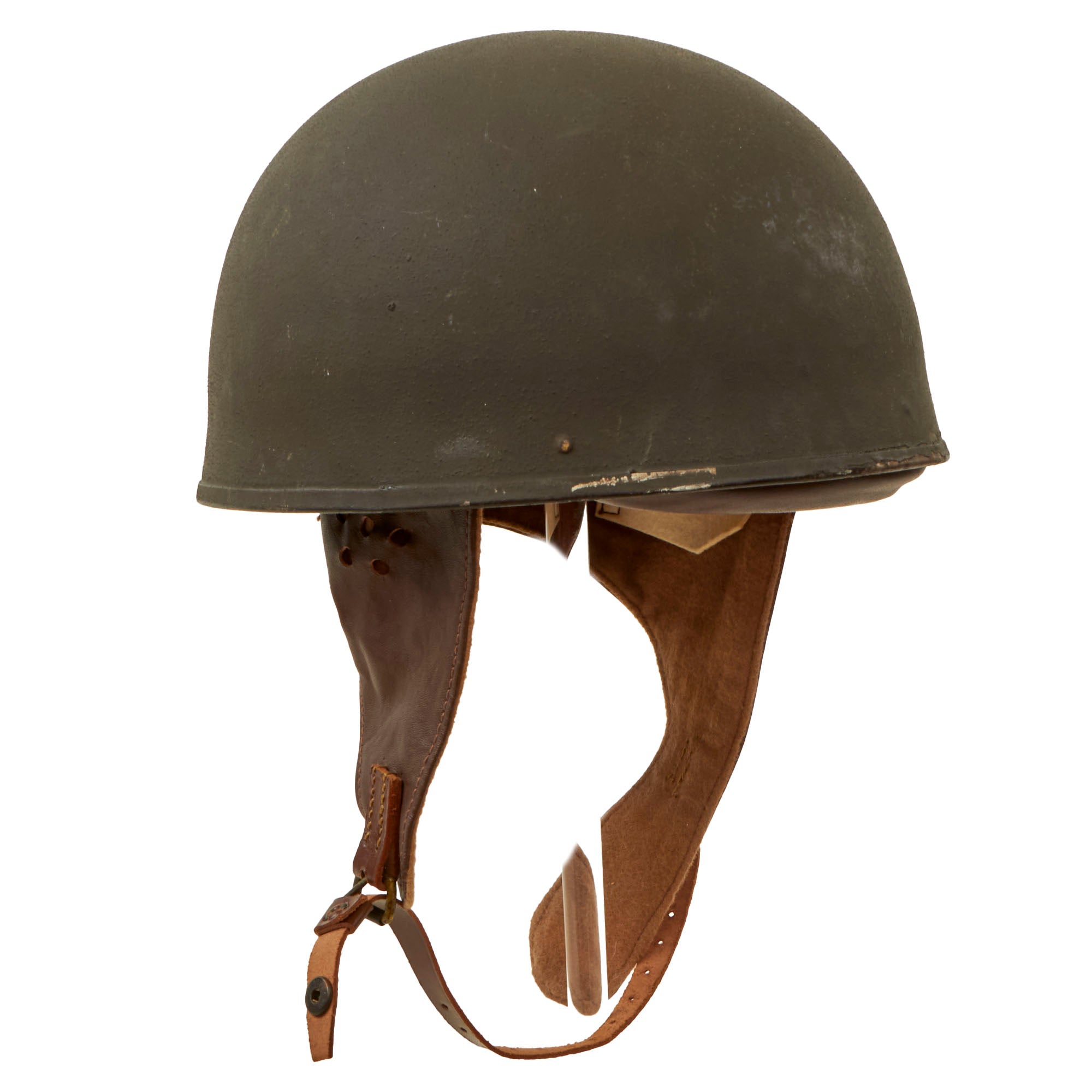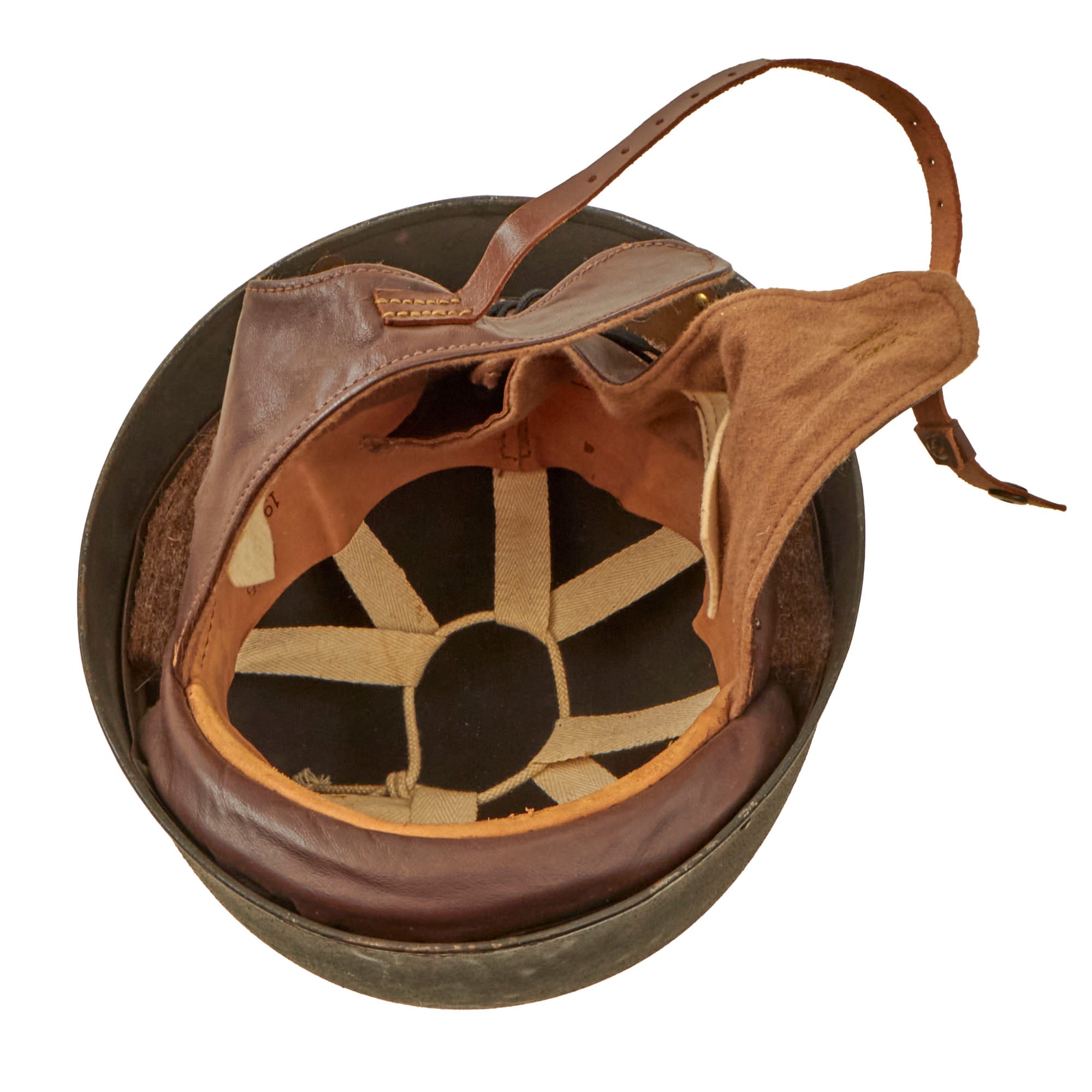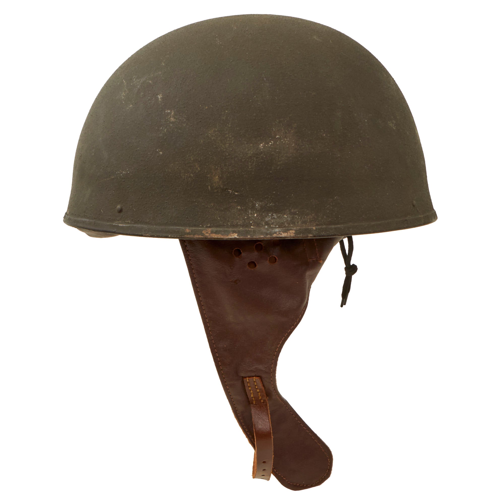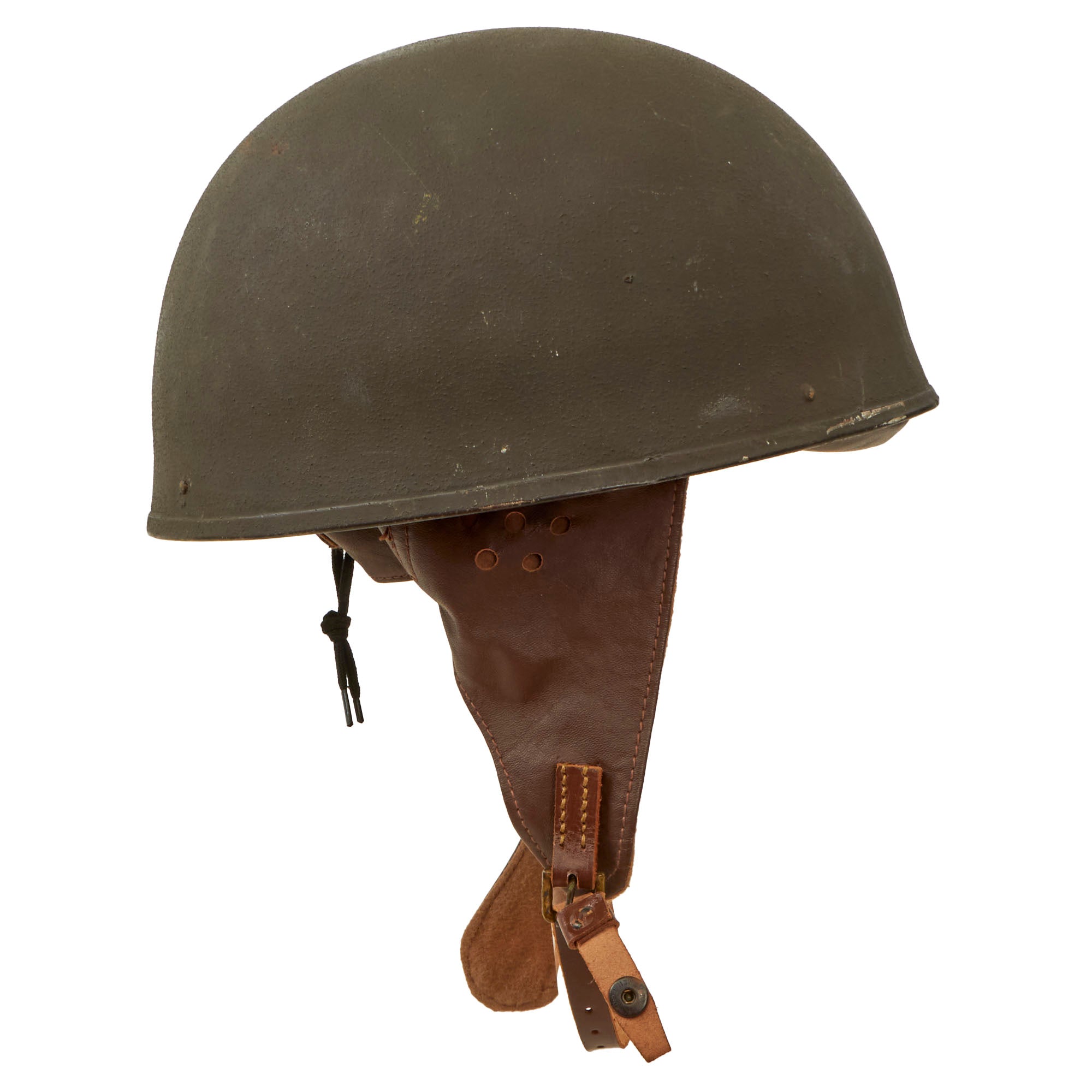Original Item: Only One Available. This is an excellent condition original WWII British MK I Dispatch Rider helmet. The shell has original paint with no major dents or dings that we can see, just a bit of scuffing and flaking, with a few scratches on the top from storage. The leather liner and ear flaps are soft and supple, though there is a bit of verdigris around the buttons, eyelets and buckle. The liner is also becoming partially detached from the helmet.