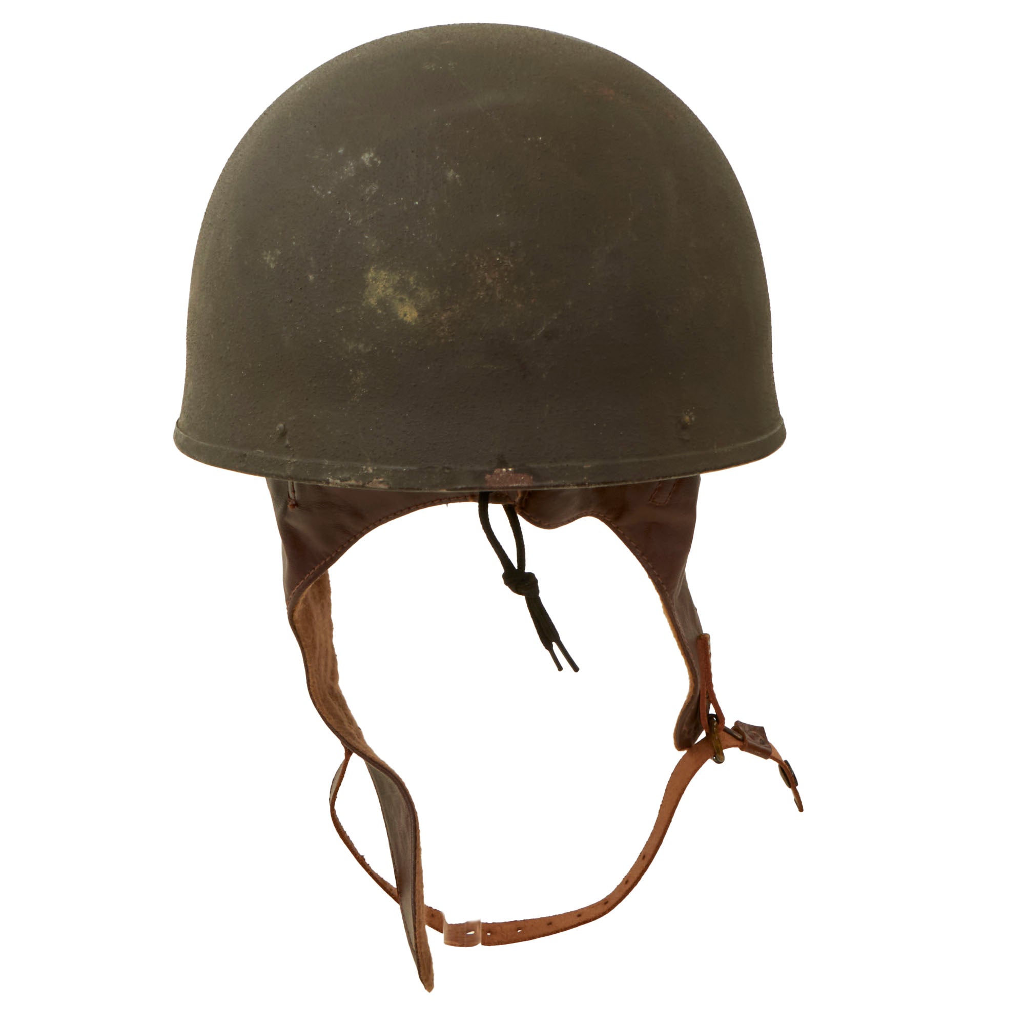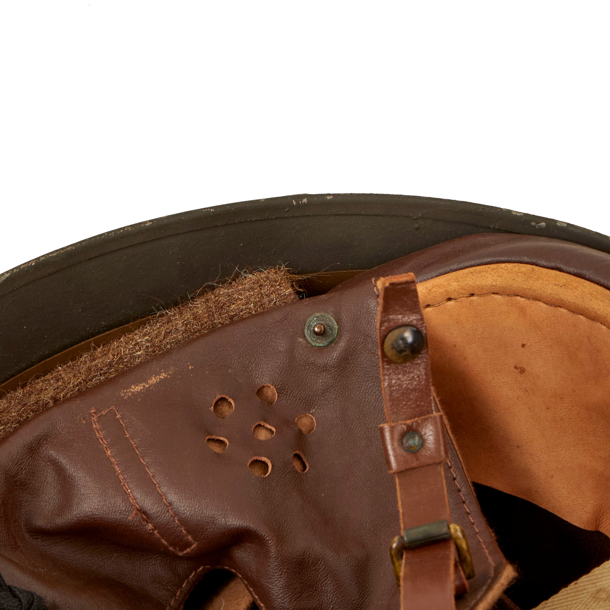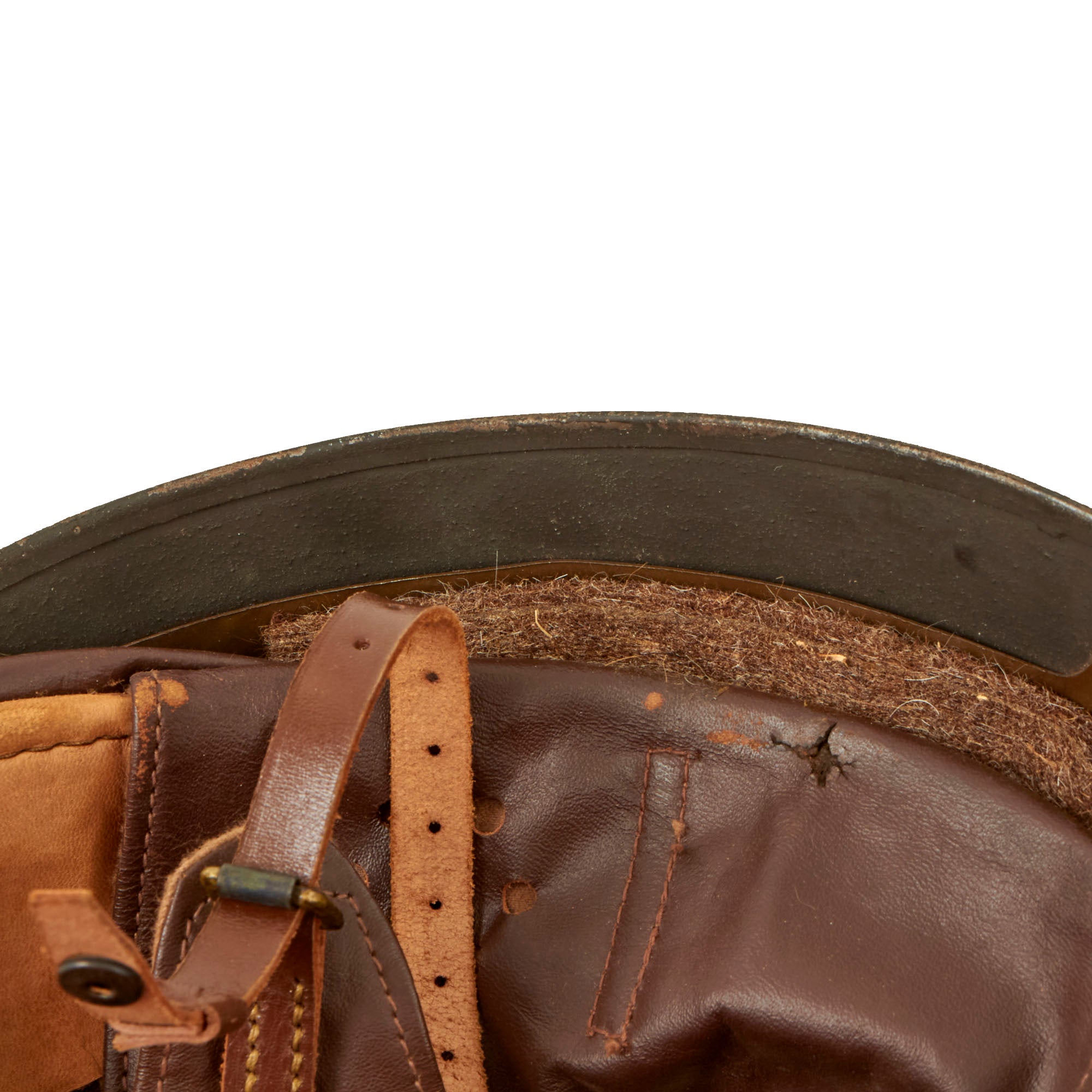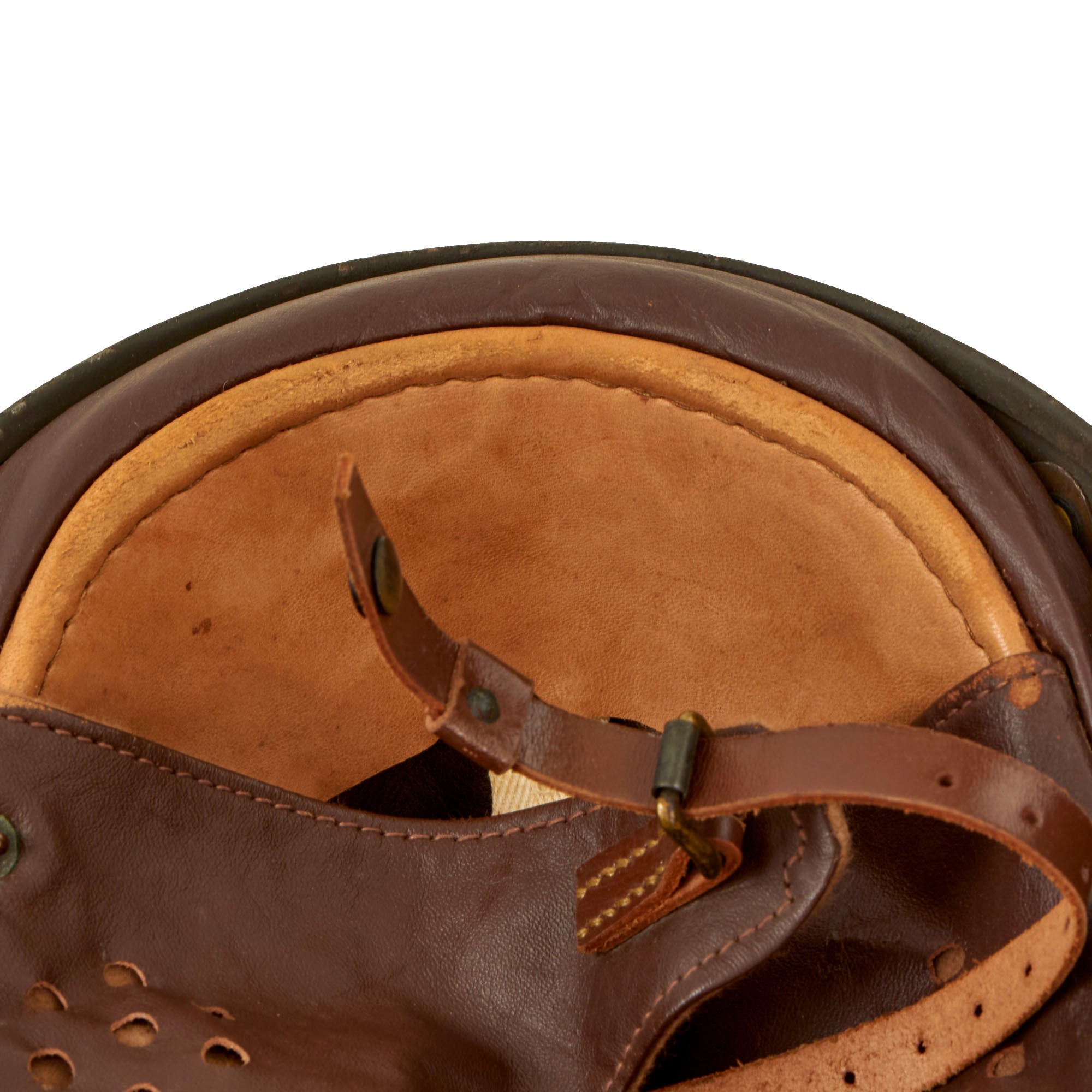 Original Item: Only One Available. This is an excellent condition original WWII British MK I Dispatch Rider helmet. The shell has original paint with no major dents or dings that we can see, just a bit of scuffing and flaking, with a few scratches on the top from storage. The leather liner and ear flaps are soft and supple, though there is a bit of verdigris around the buttons, eyelets and buckle. The liner is also becoming partially detached from the helmet.