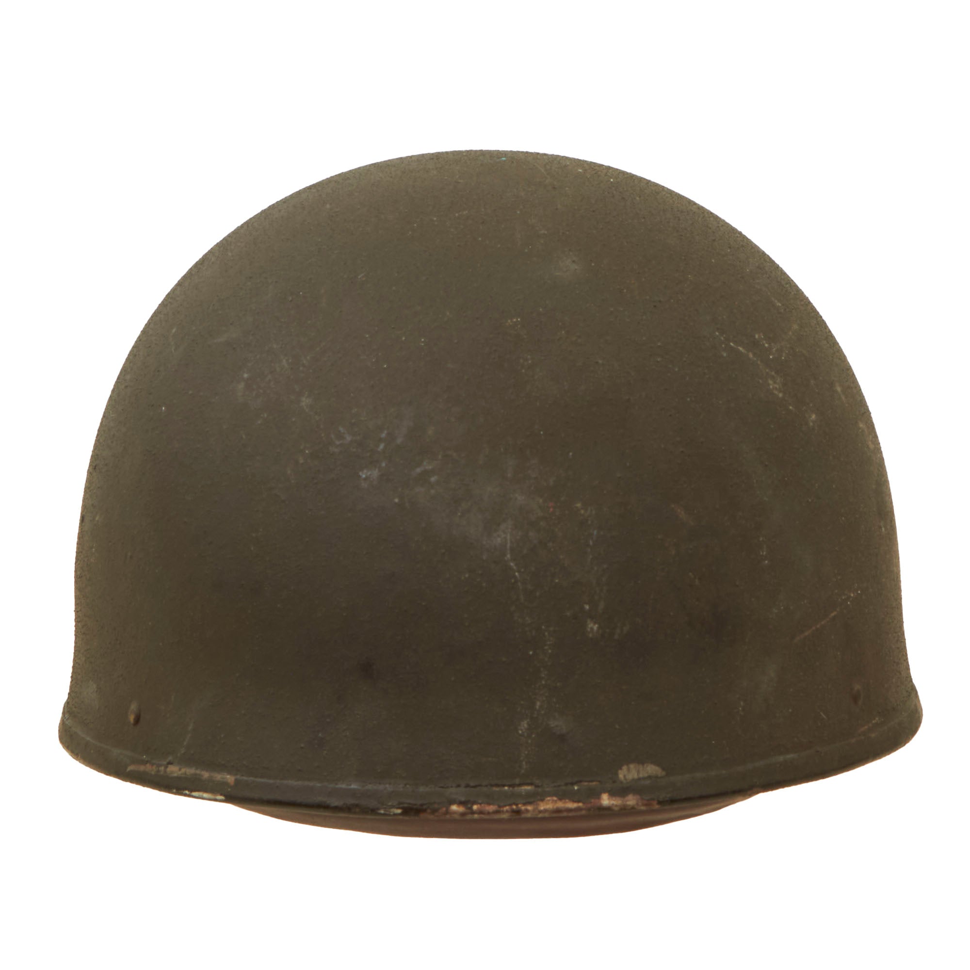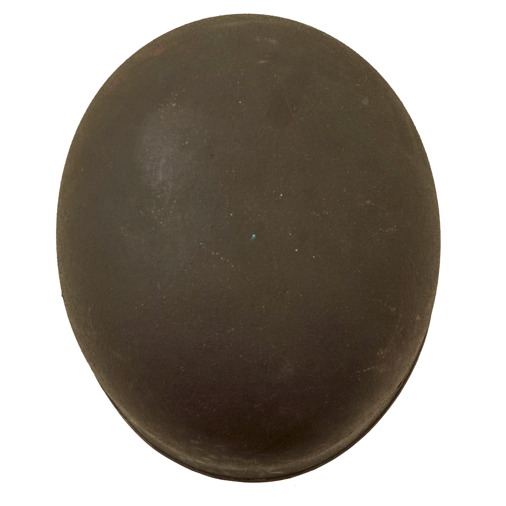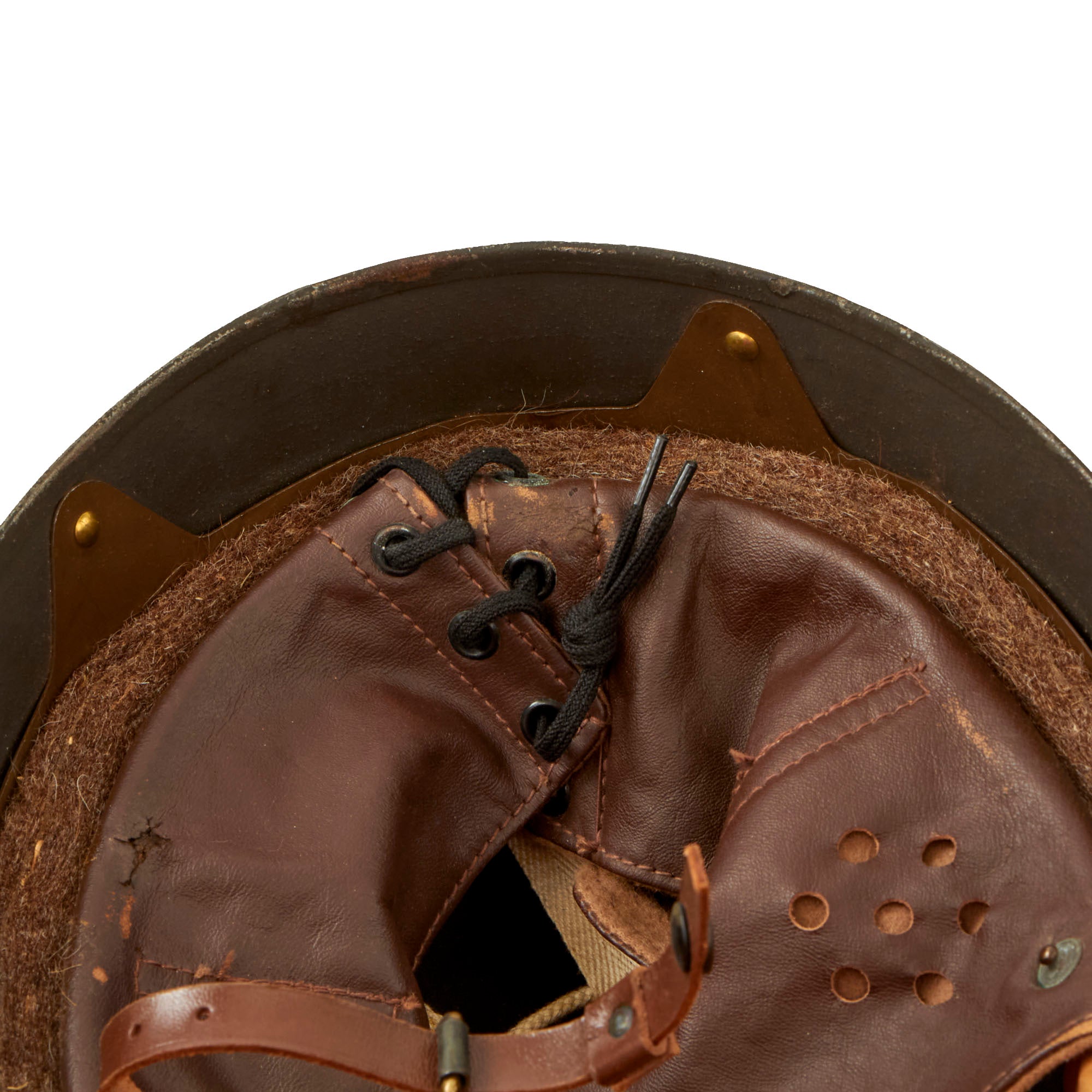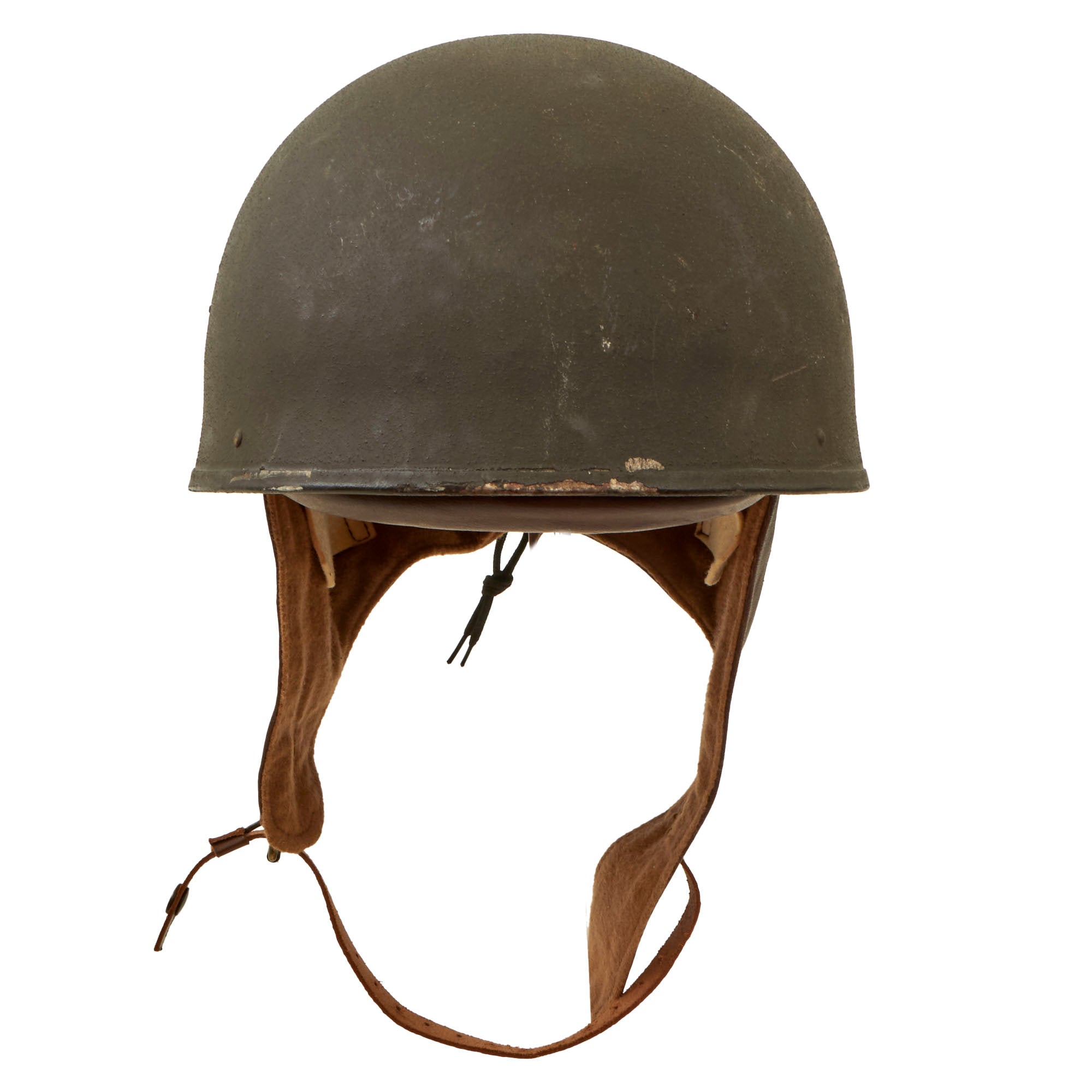 Original Item: Only One Available. This is an excellent condition original WWII British MK I Dispatch Rider helmet. The shell has original paint with no major dents or dings that we can see, just a bit of scuffing and flaking, with a few scratches on the top from storage. The leather liner and ear flaps are soft and supple, though there is a bit of verdigris around the buttons, eyelets and buckle. The liner is also becoming partially detached from the helmet.