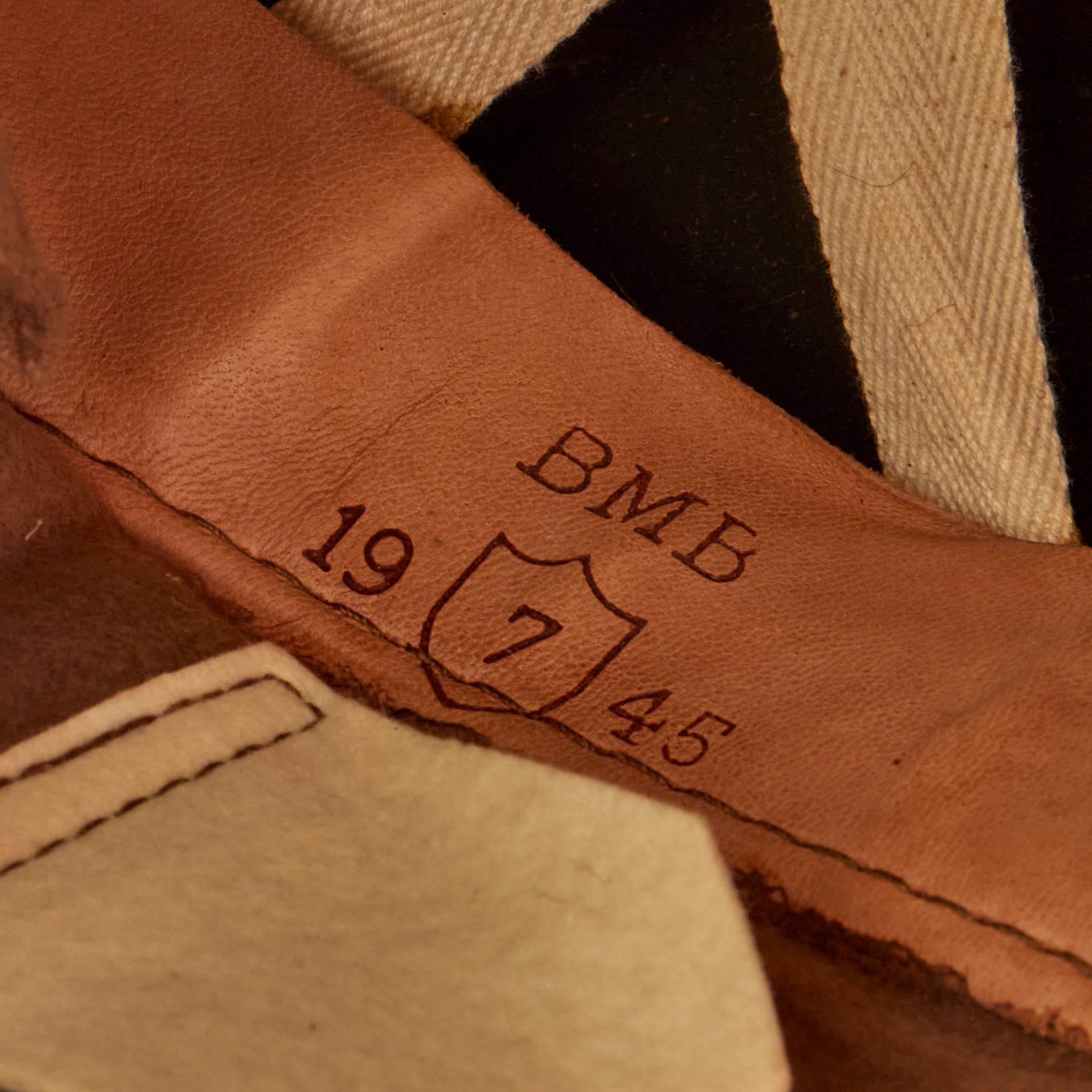 The leather liner is nicely marked with BMB and dated 1945, and is marked with size 7 inside a shield. BMB is the marking for Briggs Motor Bodies Ltd., who also made Brodie and other helmets for the British war effort. The wool felt ear padding is still intact. The chin strap snap still works, as does the buckle, and the rear lacing is intact.