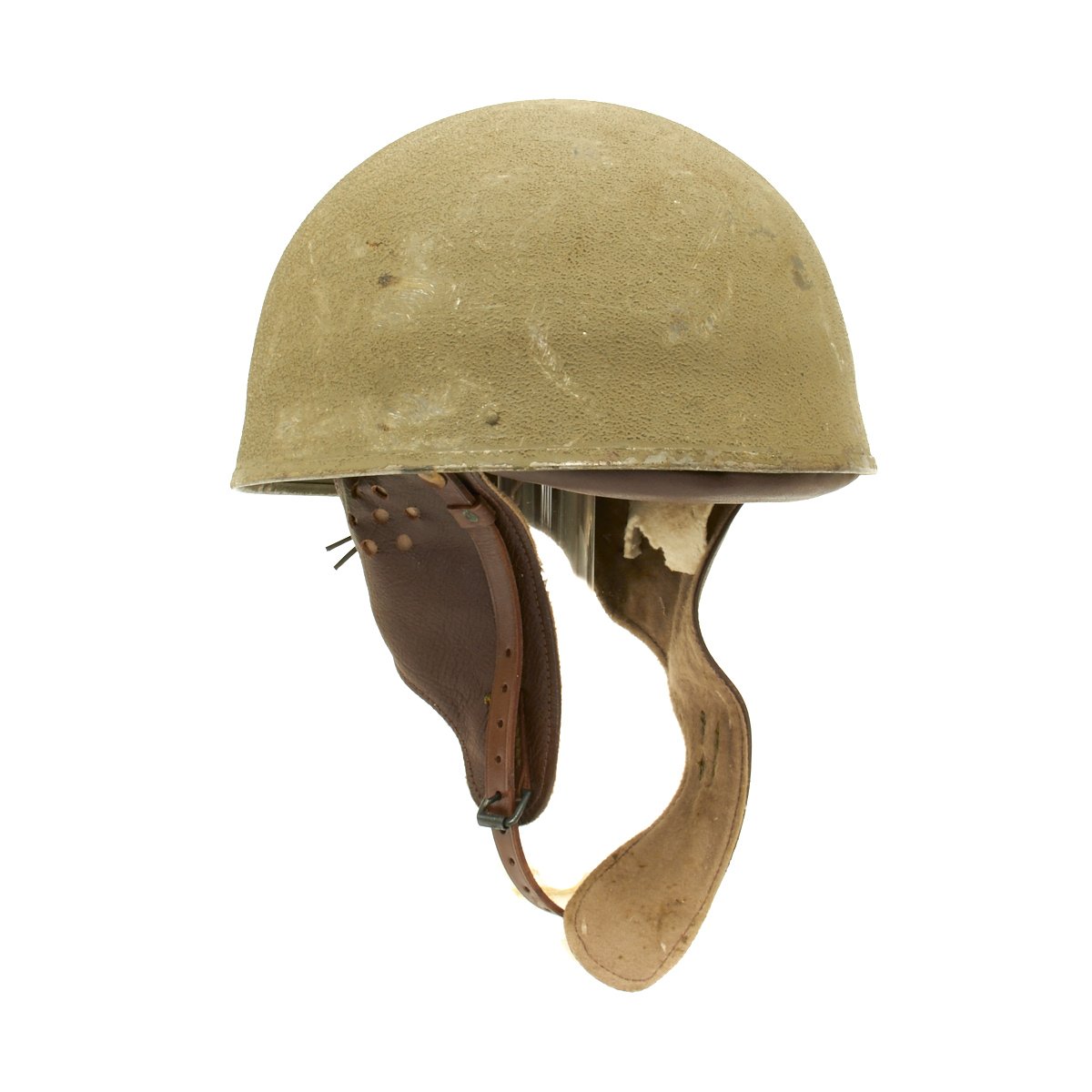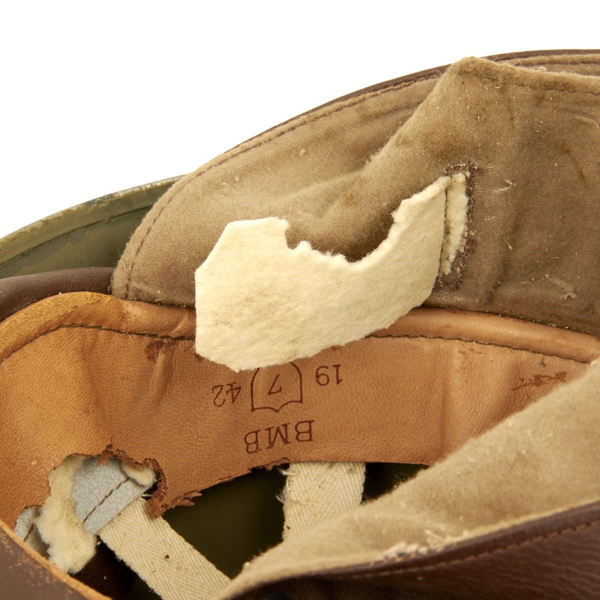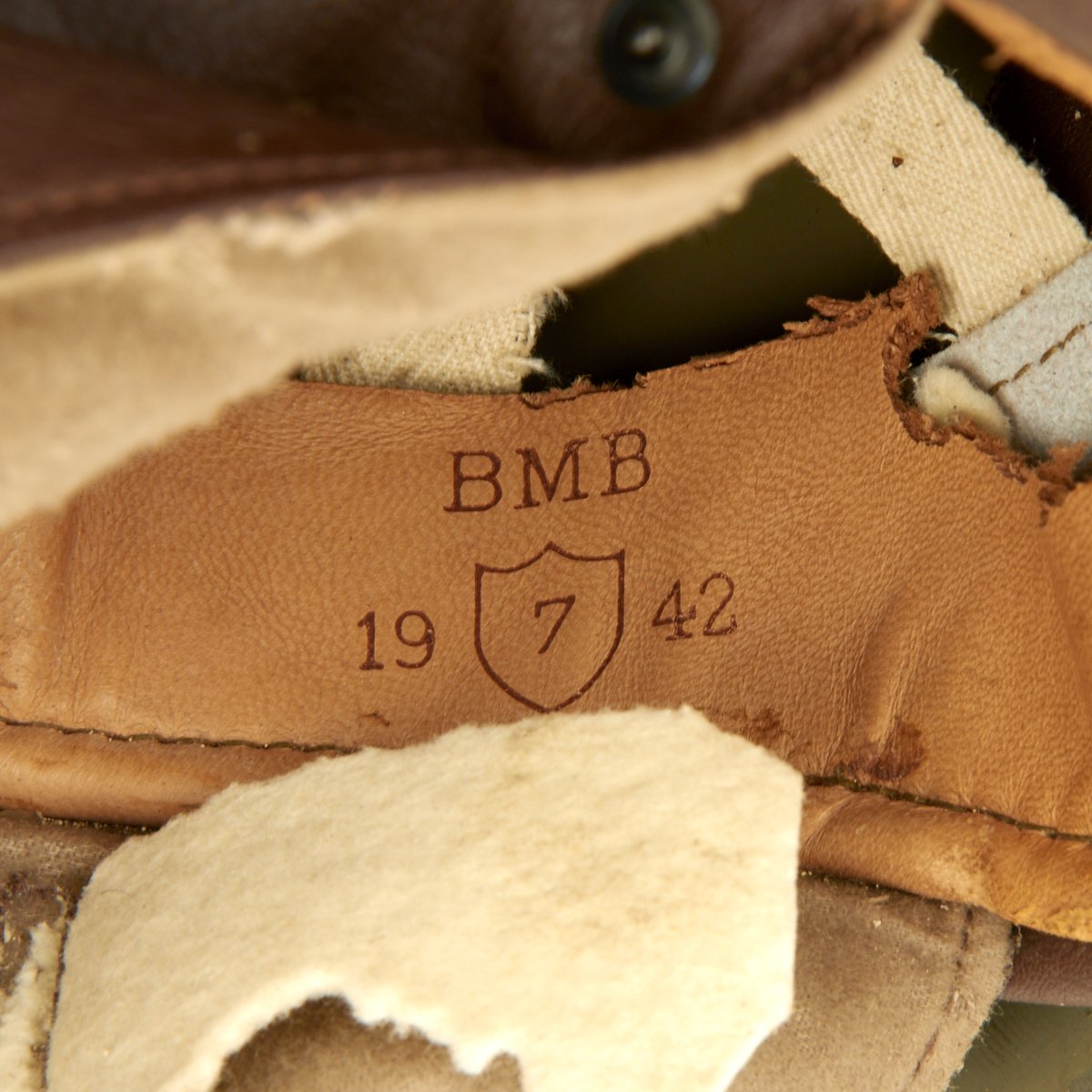 Original Item: Only One Available. A very condition original WWII British MK I Dispatch Rider helmet. Shell has original paint with one dent on the rear. Leather liner and chinstrap assembly are soft and supple, though unfortunately the liner did suffer significant moth damage. Liner is nicely maker marked BMB and dated 1942, and is marked with size 7 inside a shield. BMB is the marking for Briggs Motor Bodies Ltd., who also made Brodie and other helmets for the British war effort. The wool padding is still present, which is very rare, though it has also suffered moth damage.