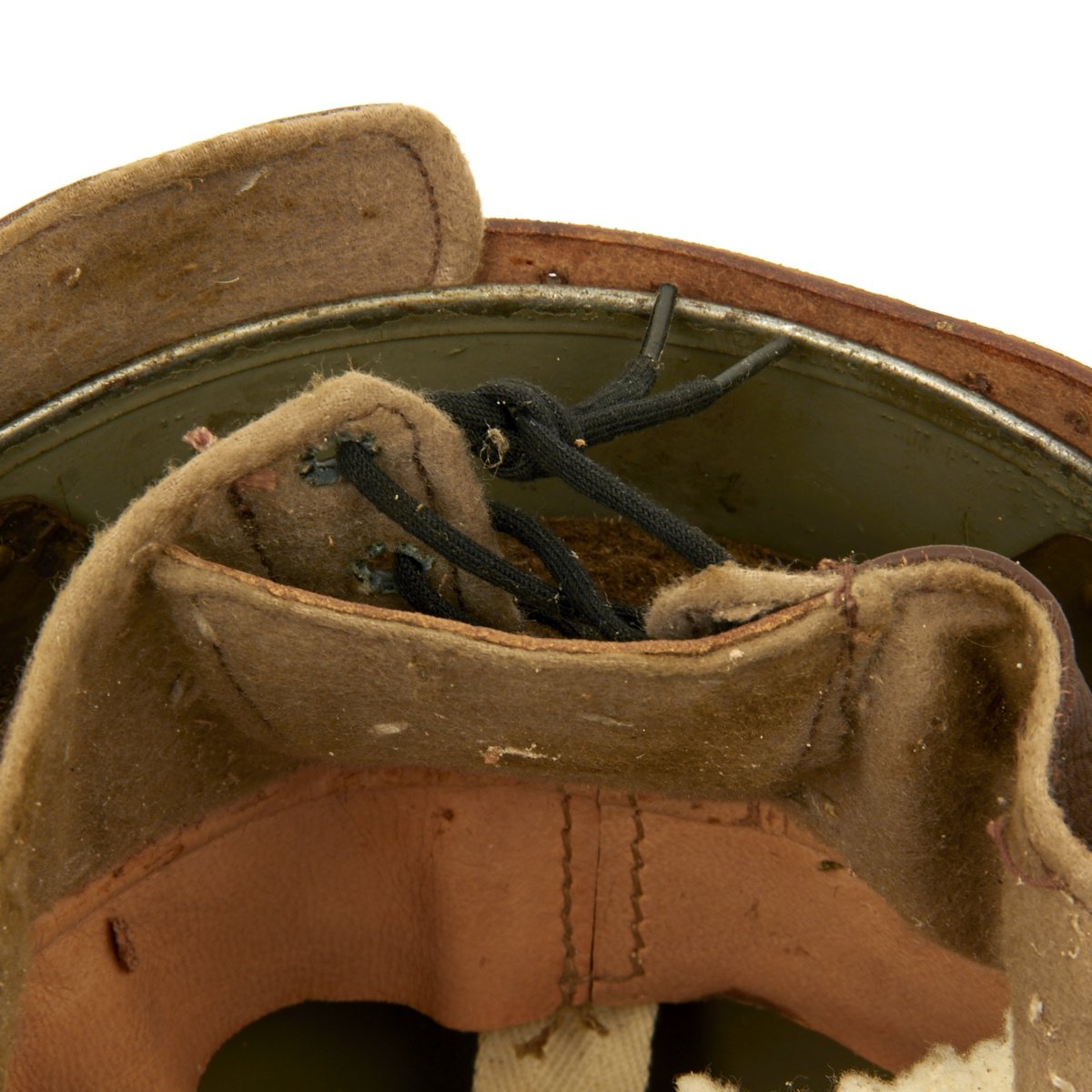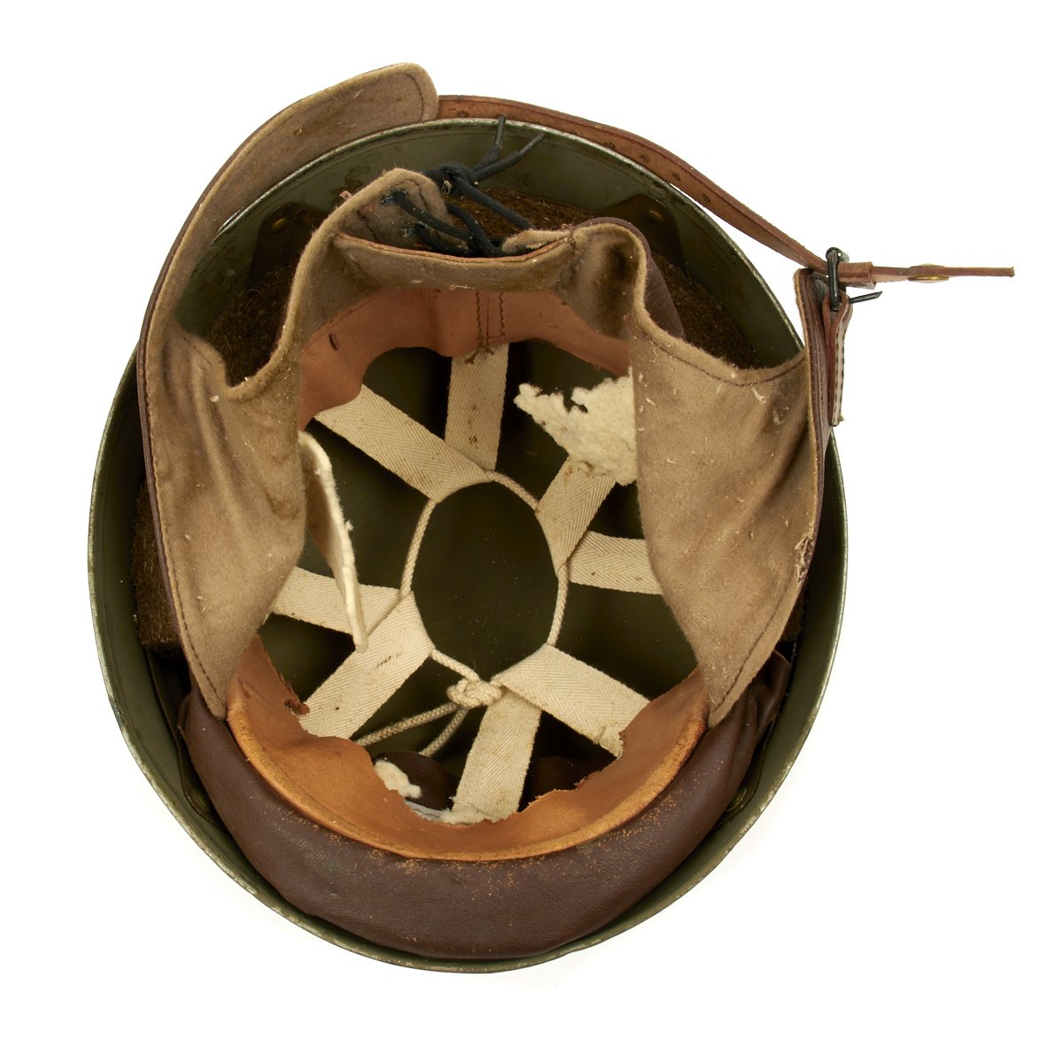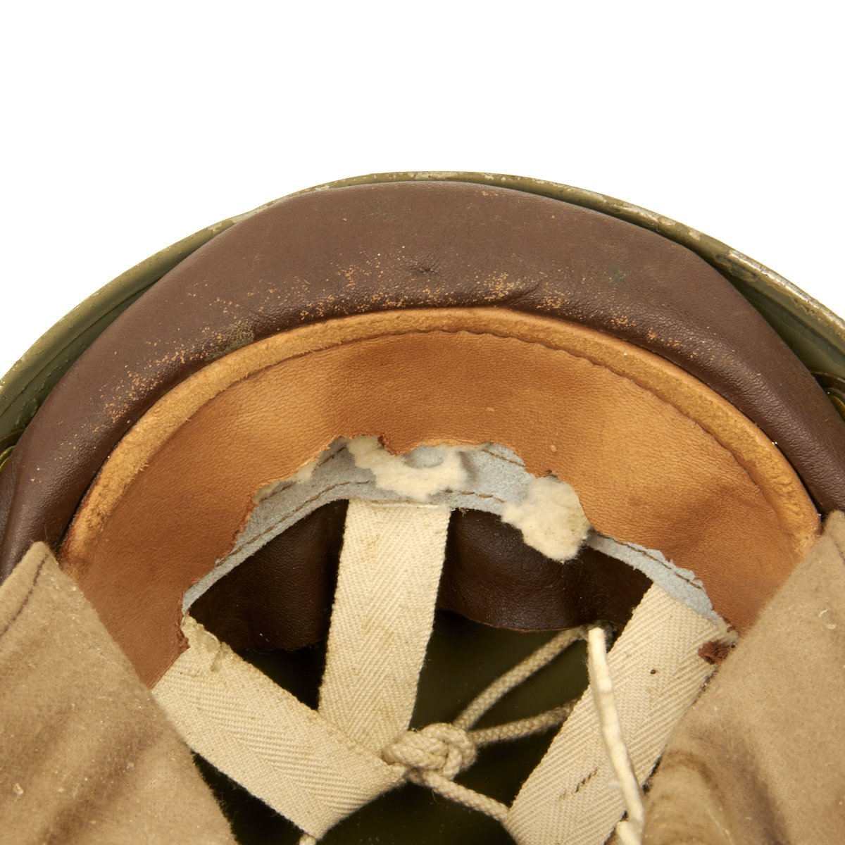 Original Item: Only One Available. A very condition original WWII British MK I Dispatch Rider helmet. Shell has original paint with one dent on the rear. Leather liner and chinstrap assembly are soft and supple, though unfortunately the liner did suffer significant moth damage. Liner is nicely maker marked BMB and dated 1942, and is marked with size 7 inside a shield. BMB is the marking for Briggs Motor Bodies Ltd., who also made Brodie and other helmets for the British war effort. The wool padding is still present, which is very rare, though it has also suffered moth damage.