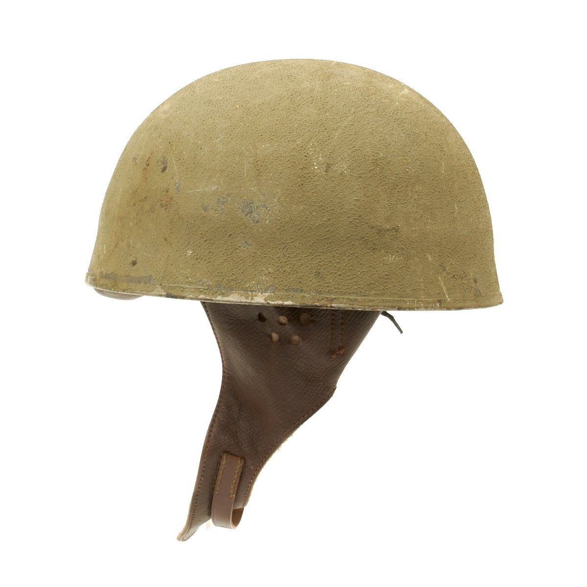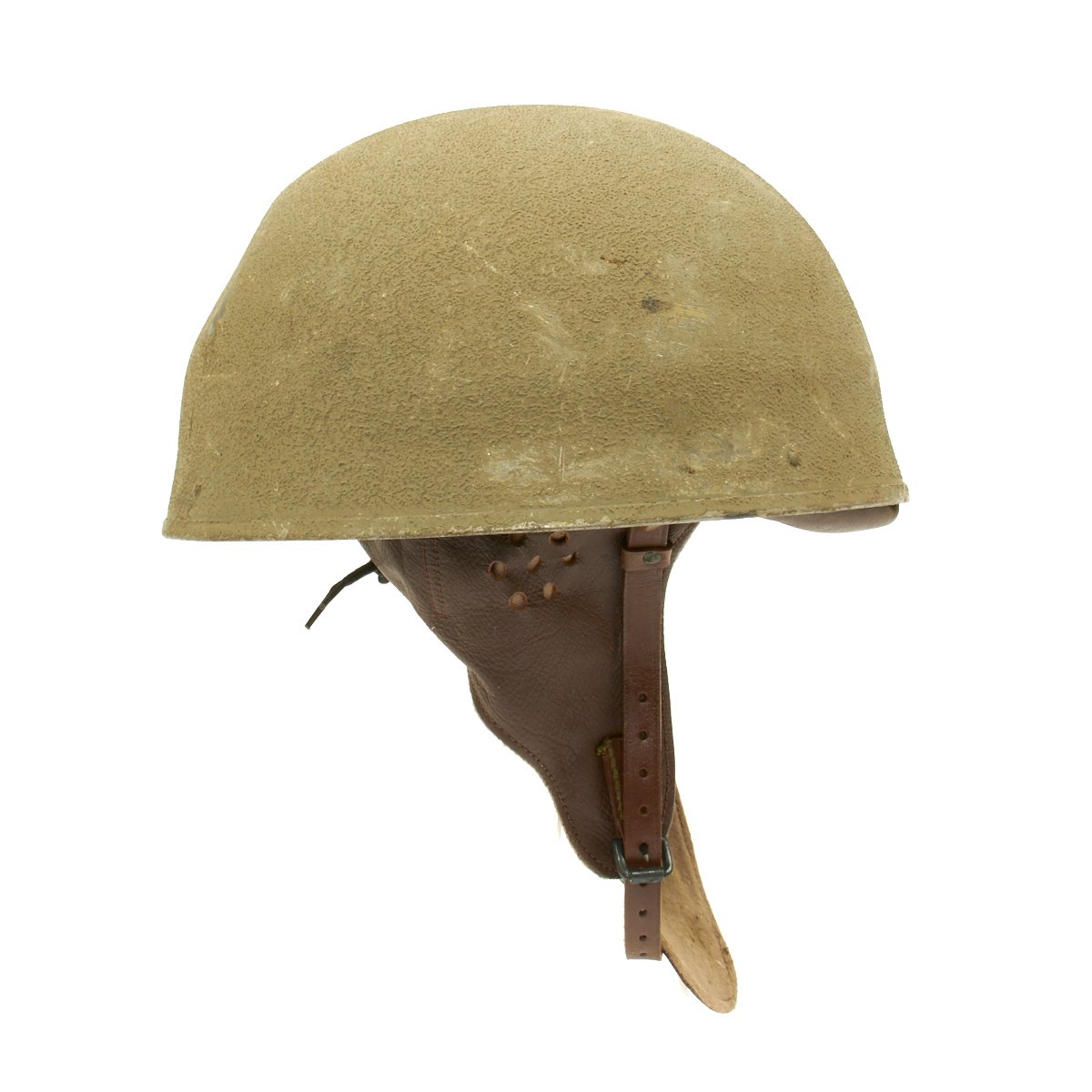 The MkII paratrooper helmet shell was also used for dispatch riders during and after World War II. It was introduced in 1942 and features a front pad and leader neck flap that forms a double chinstrap.