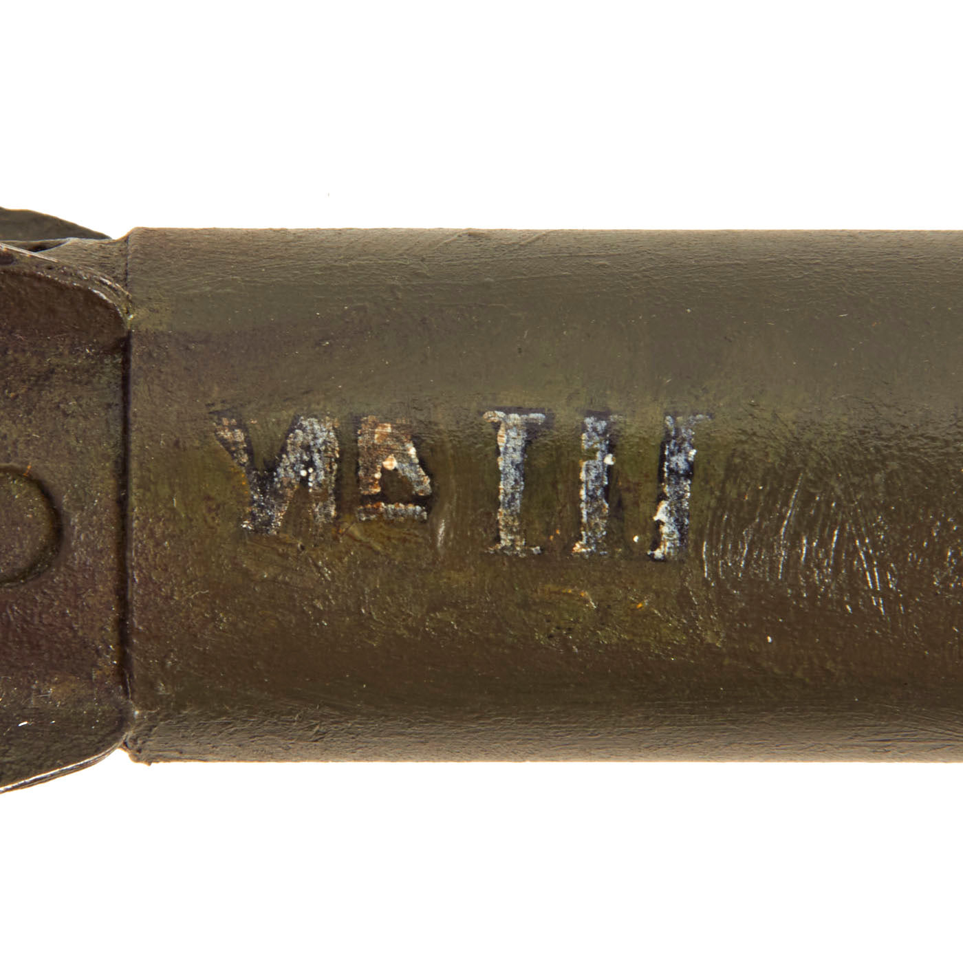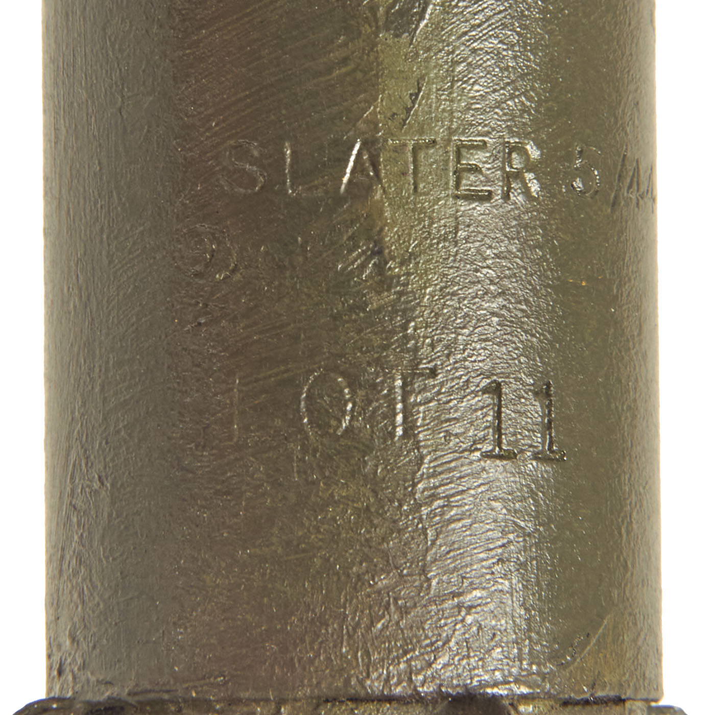 This round is in excellent condition, close to unissued, and has British ordnance markings on many components. The warhead itself is maker marked SLATER with a date of 5 / 44 (May, 1944). The top of the round also unscrews, and a lot of the internal structures are still present, which were designed to direct the explosive force.