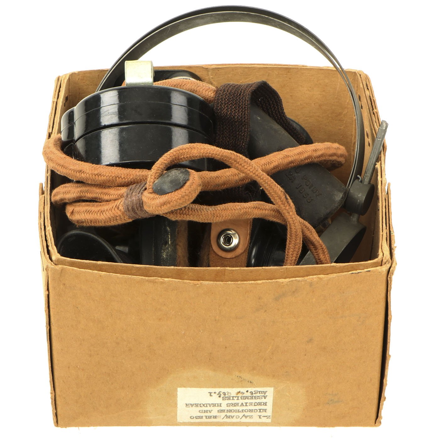 Original Item: Only One Set Available. Here we have a very nice WWII Issue Canadian Headphone and Microphone set, complete with the original wiring and "Broad Arrow in C" marked. Also included is a PL-291 by SHURE, though it does not actually interface with this set. All of these items are contained in an original cardboard box indicating that it is MICROPHONES AND RECEIVERS HEADGEAR ASSEMBLIES, over a date of Augt. 4, but unfortunately the last number cannot be read.