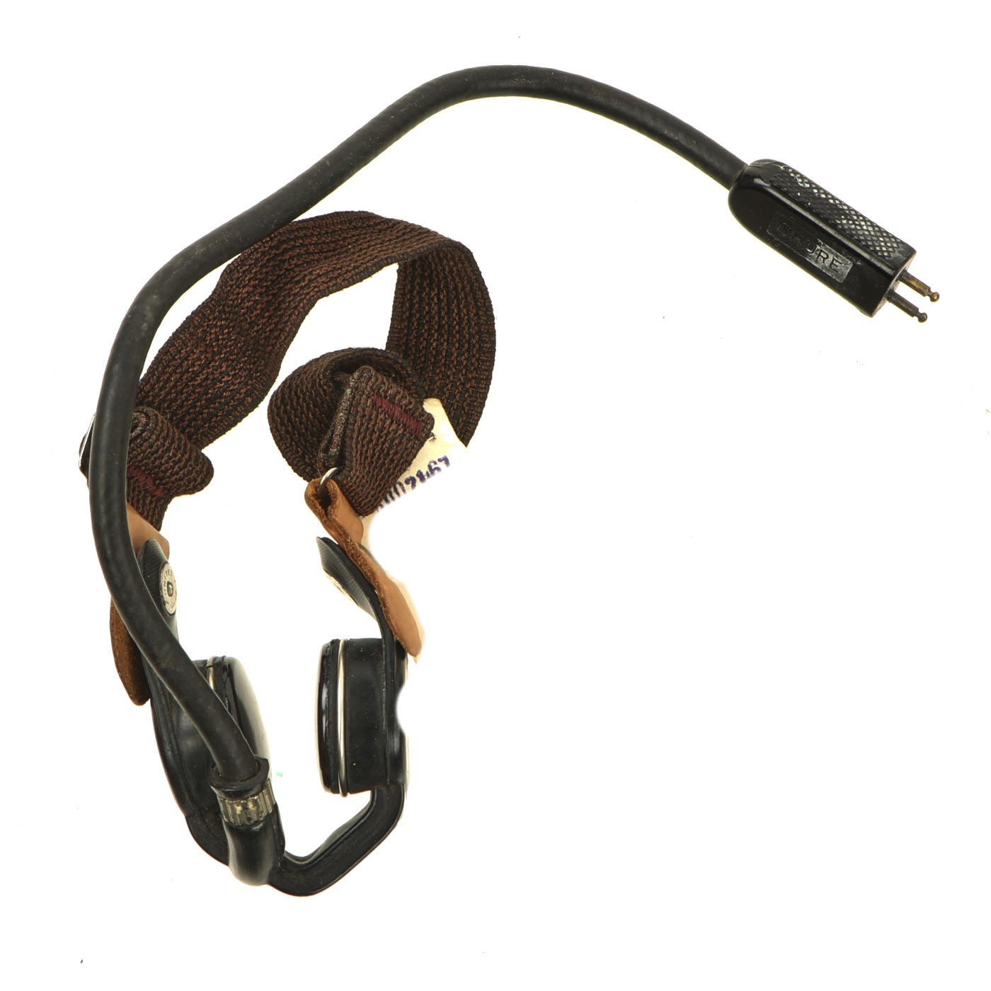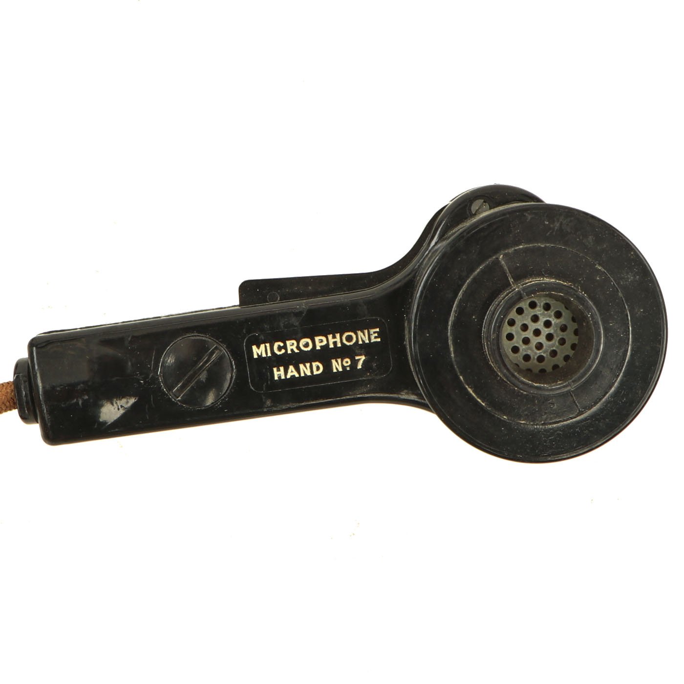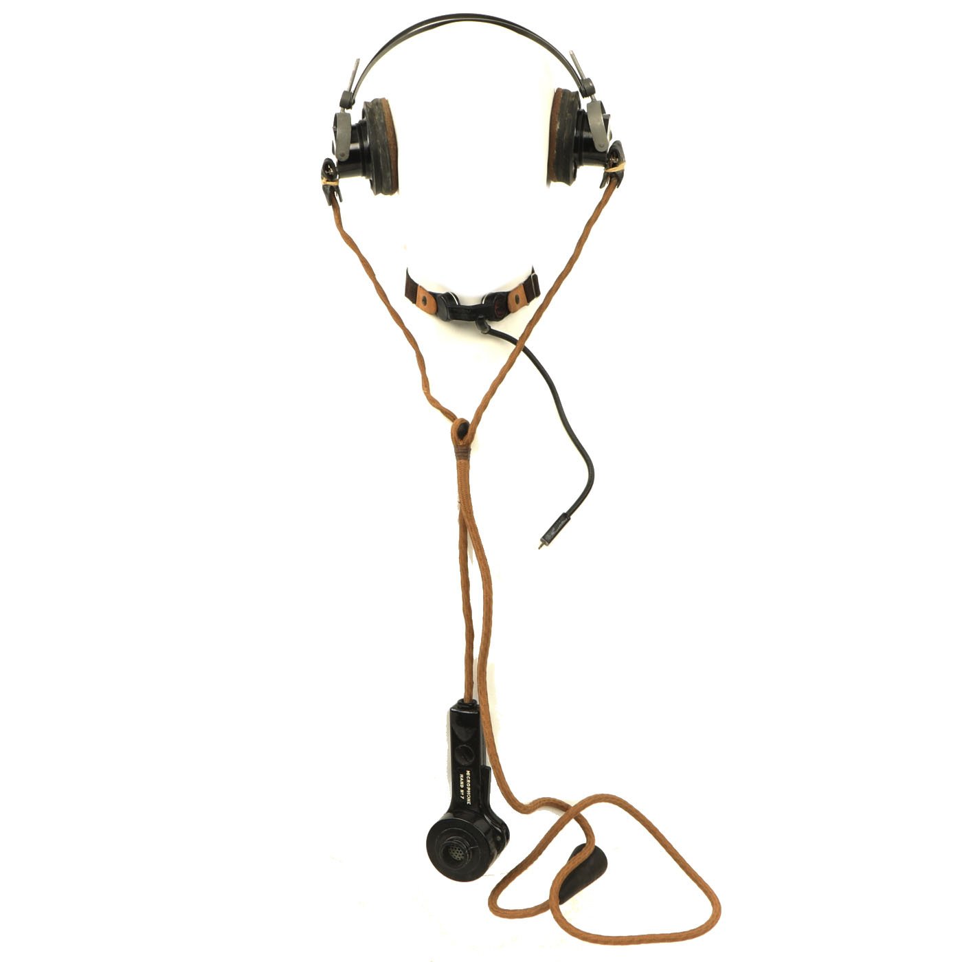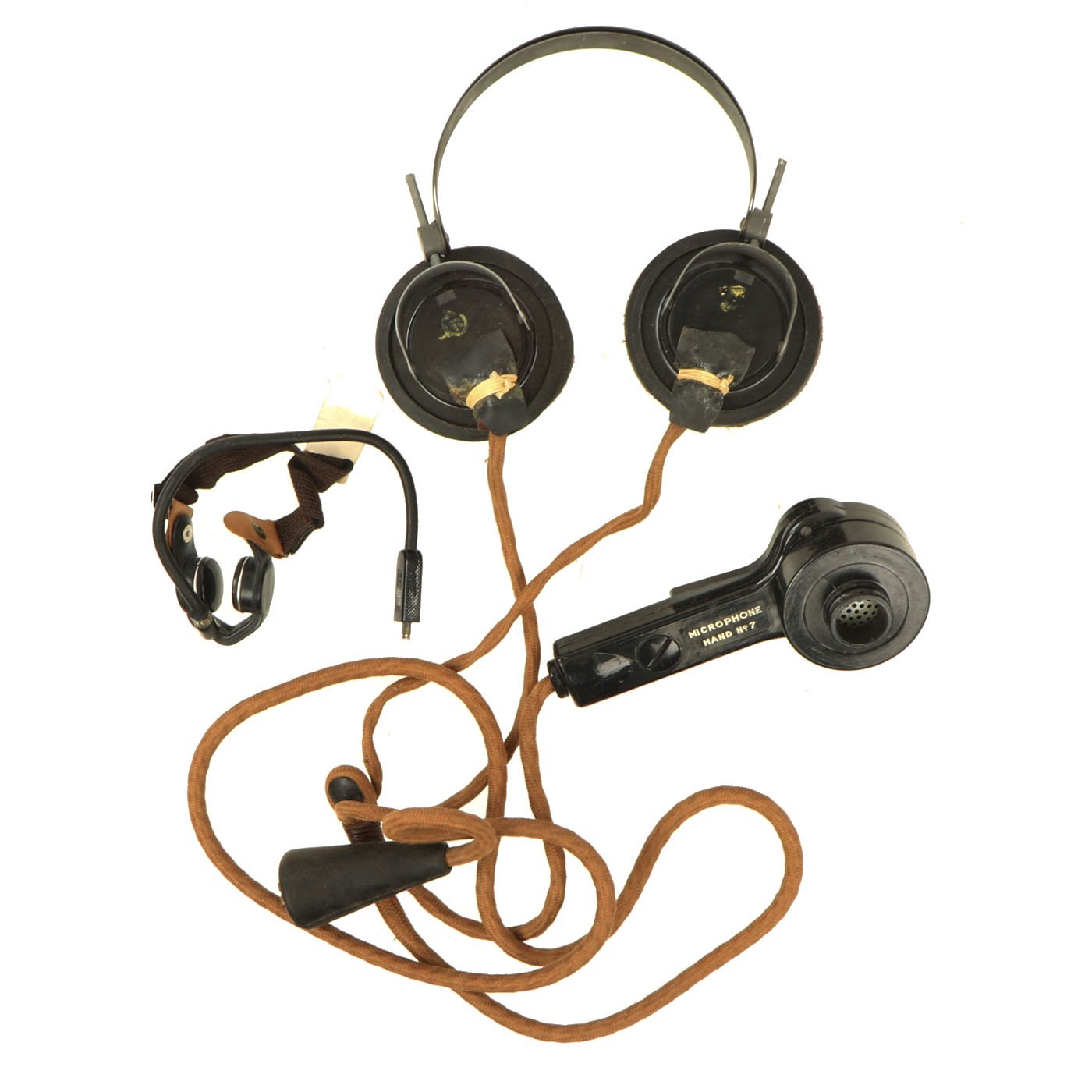 The headphones are in good shape, with intact napping on the pads, and secure wiring. They are attached to a MICROPHONE HAND No. 7, which is also in good shape. It still has the original rubber mouthpiece cone, which has been left off to avoid it stretching and cracking.