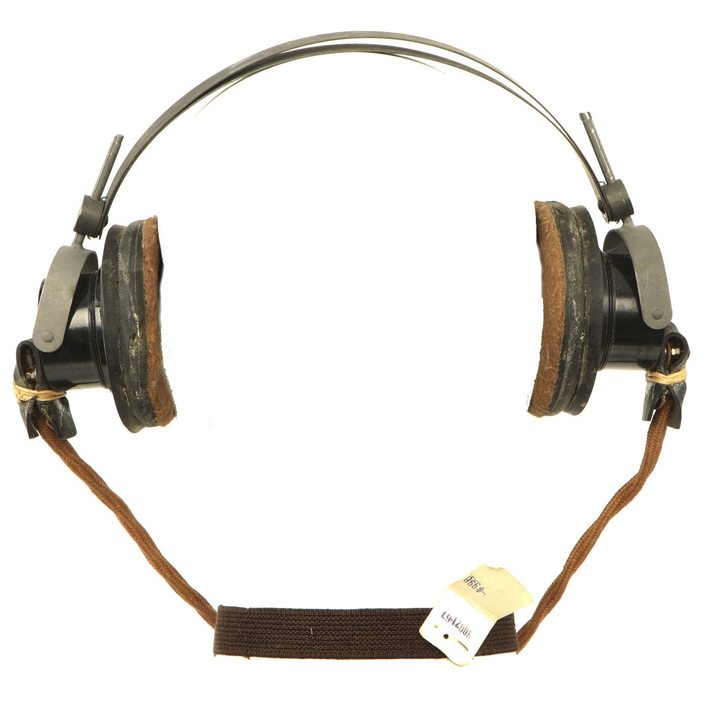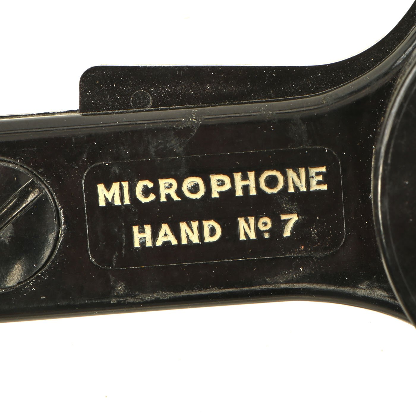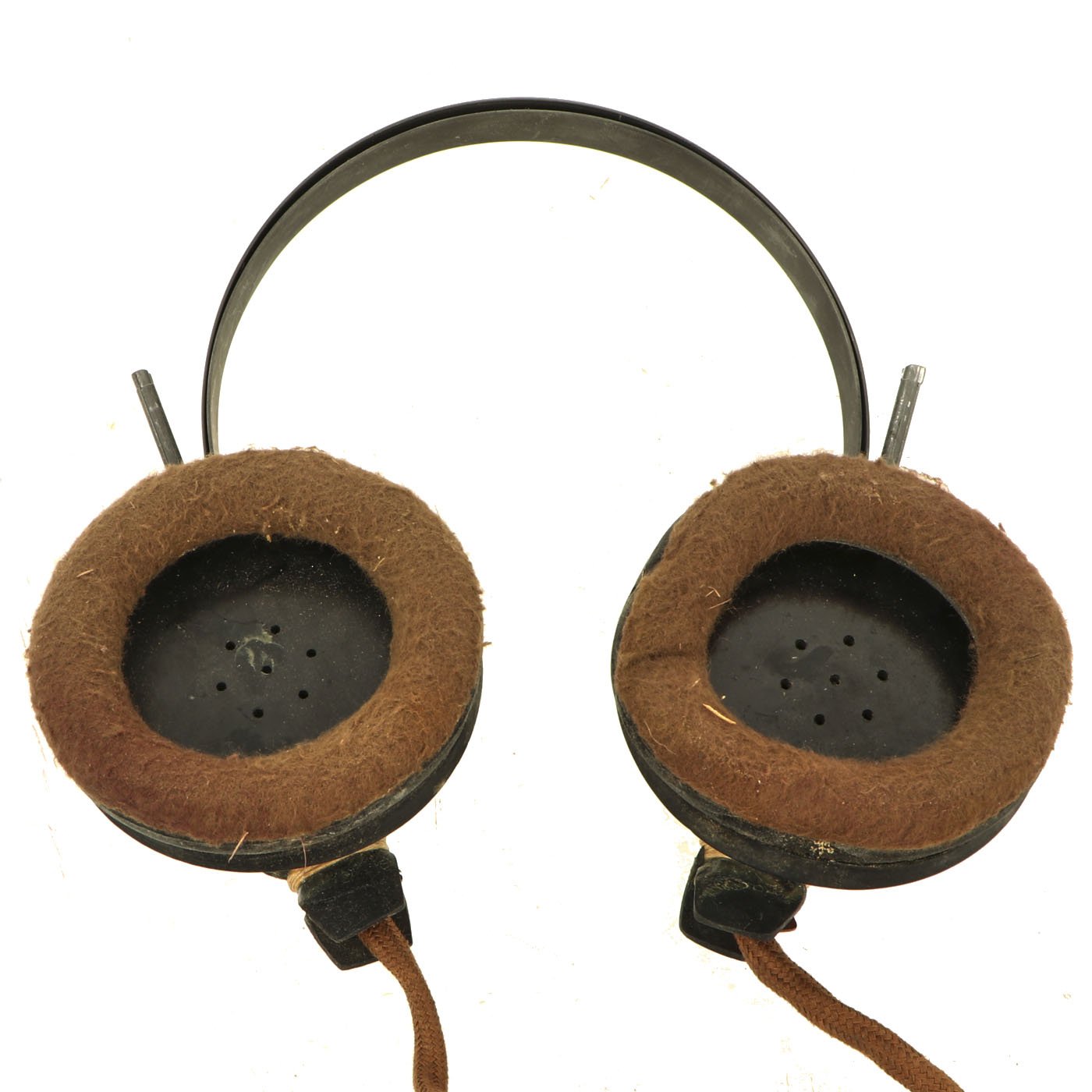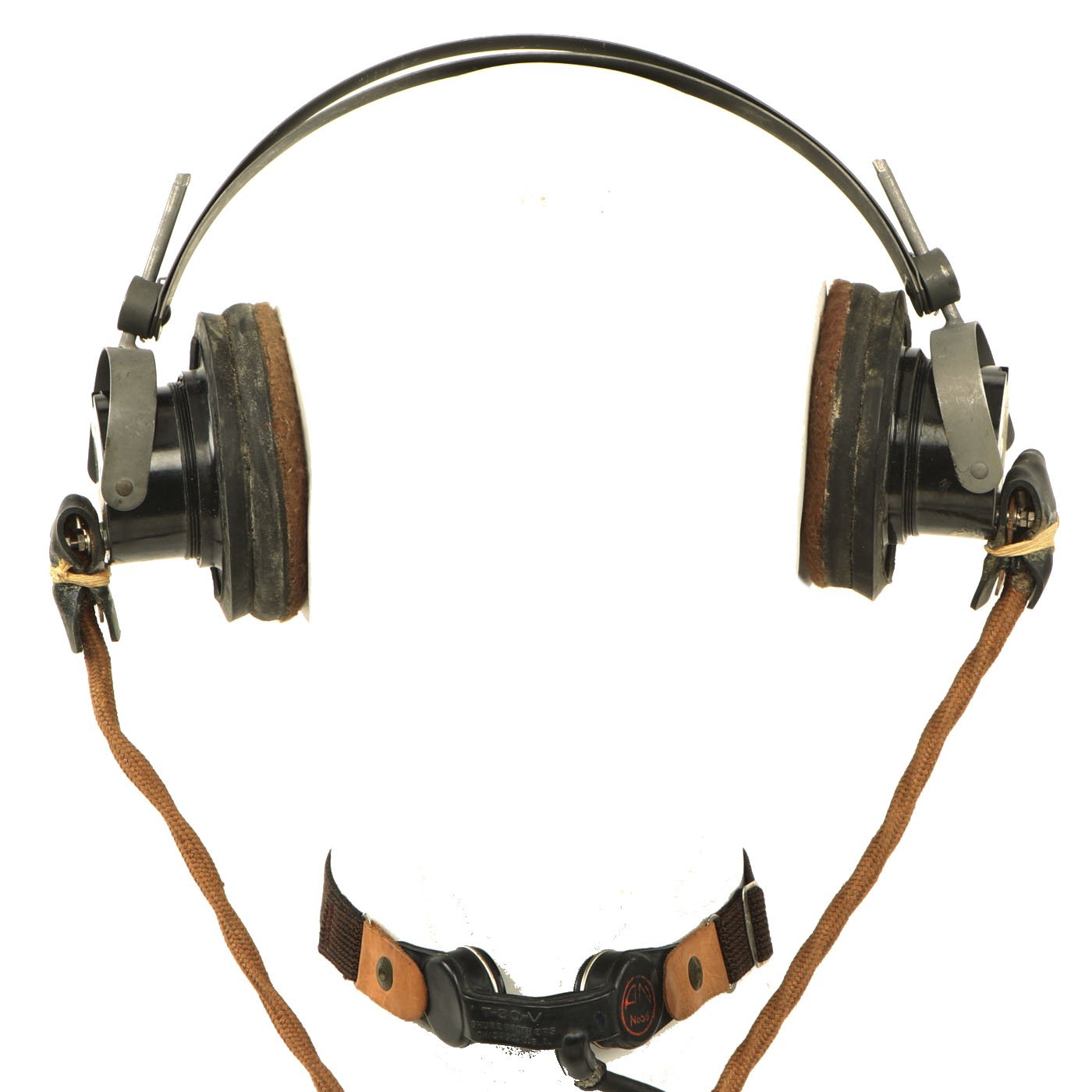 The headphones are in good shape, with intact napping on the pads, and secure wiring. They are attached to a MICROPHONE HAND No. 7, which is also in good shape. It still has the original rubber mouthpiece cone, which has been left off to avoid it stretching and cracking.