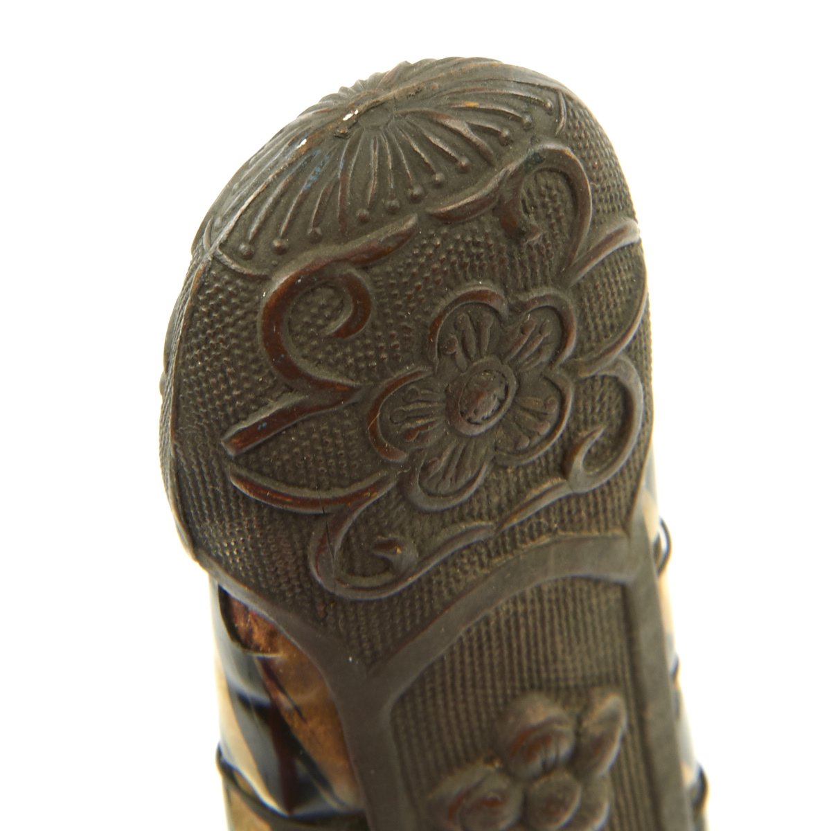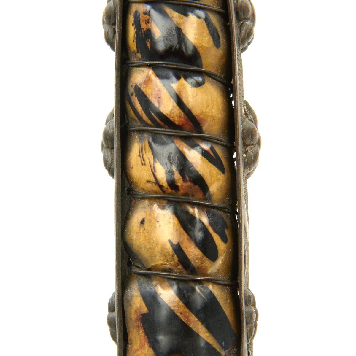 Handle is fabricated from age-toned multicolored celluloid, with eight rows of wire wrap. Gilt brass mounts adorned with Chinese Plum Blossoms. The grip is in very good condition with no damage.