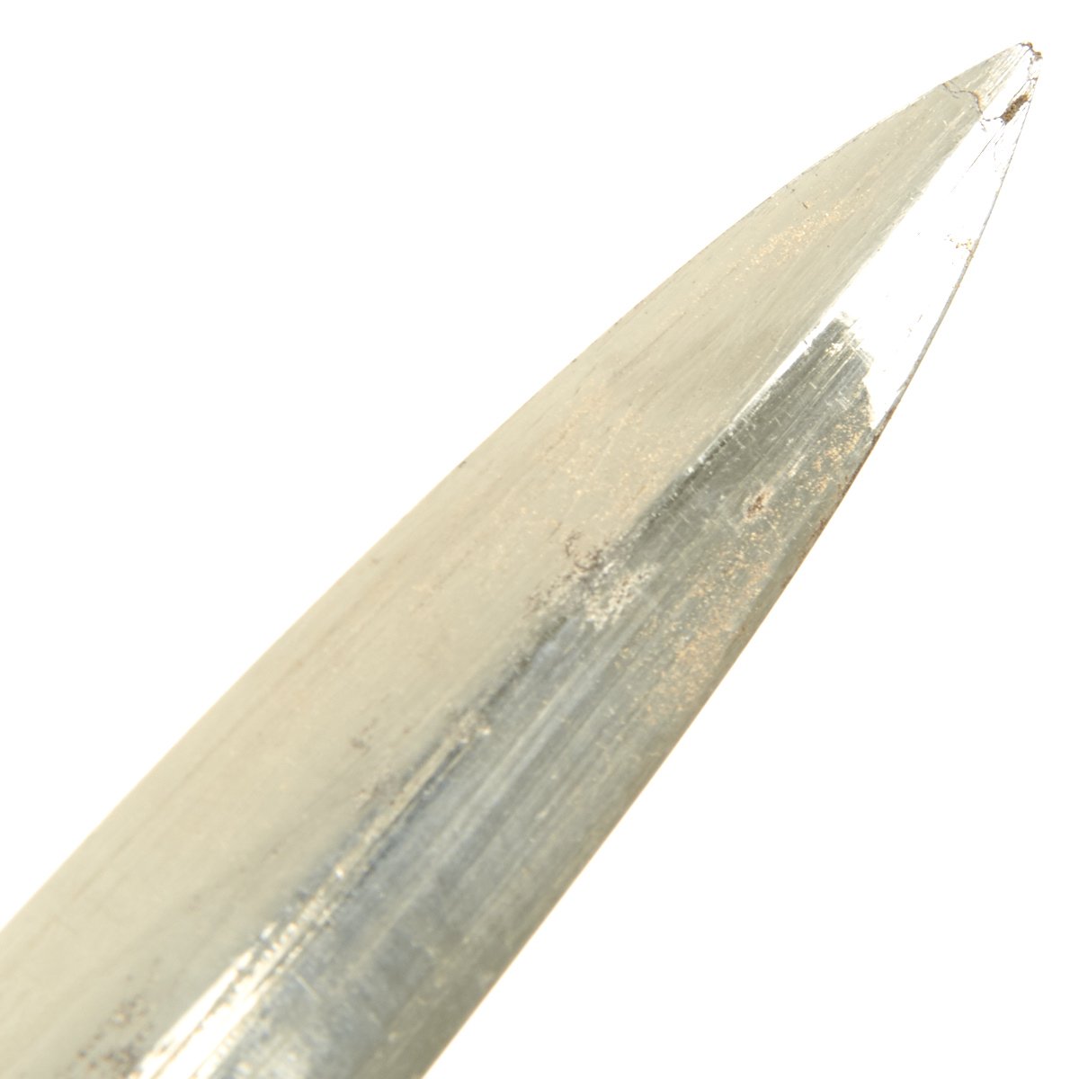 This is a genuine rare Chinese Nationalist Army Officer's Dagger circa 1935. It measures approximately 15.5" with the scabbard on, this dagger features a 9 3/4 inch nickel-plated steel blade, magnetic, with dull edges, remaining bright and crisp with areas of wear and discoloration and retaining a sharp tip. The blade exhibits wear overall and some scuffing from extraction and return to the scabbard, along with spots in the plating, maintaining a natural shine, the blade rating is good.