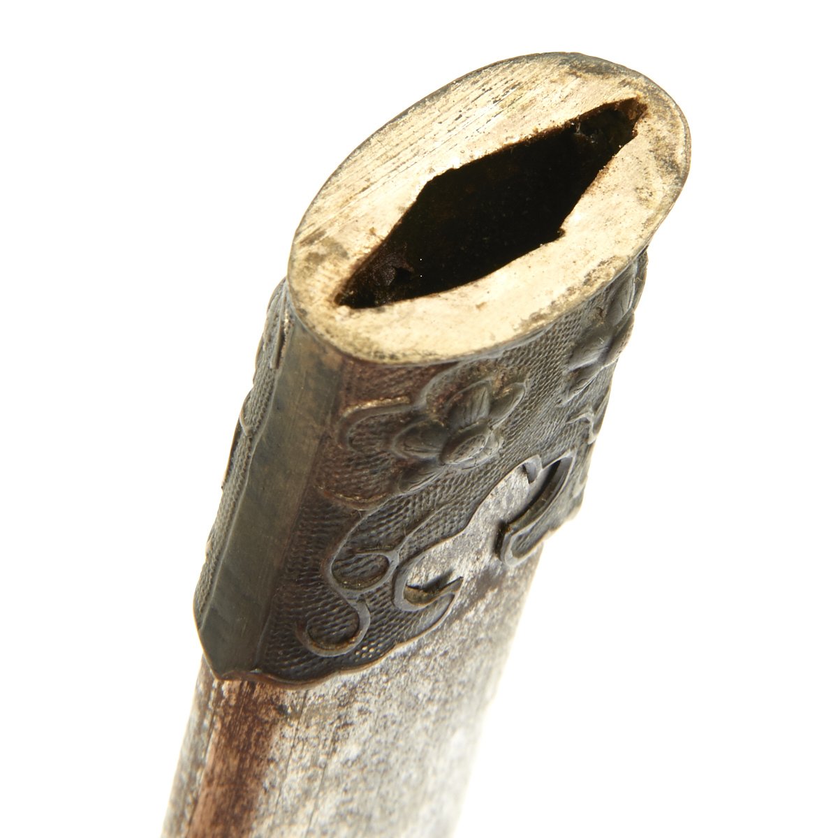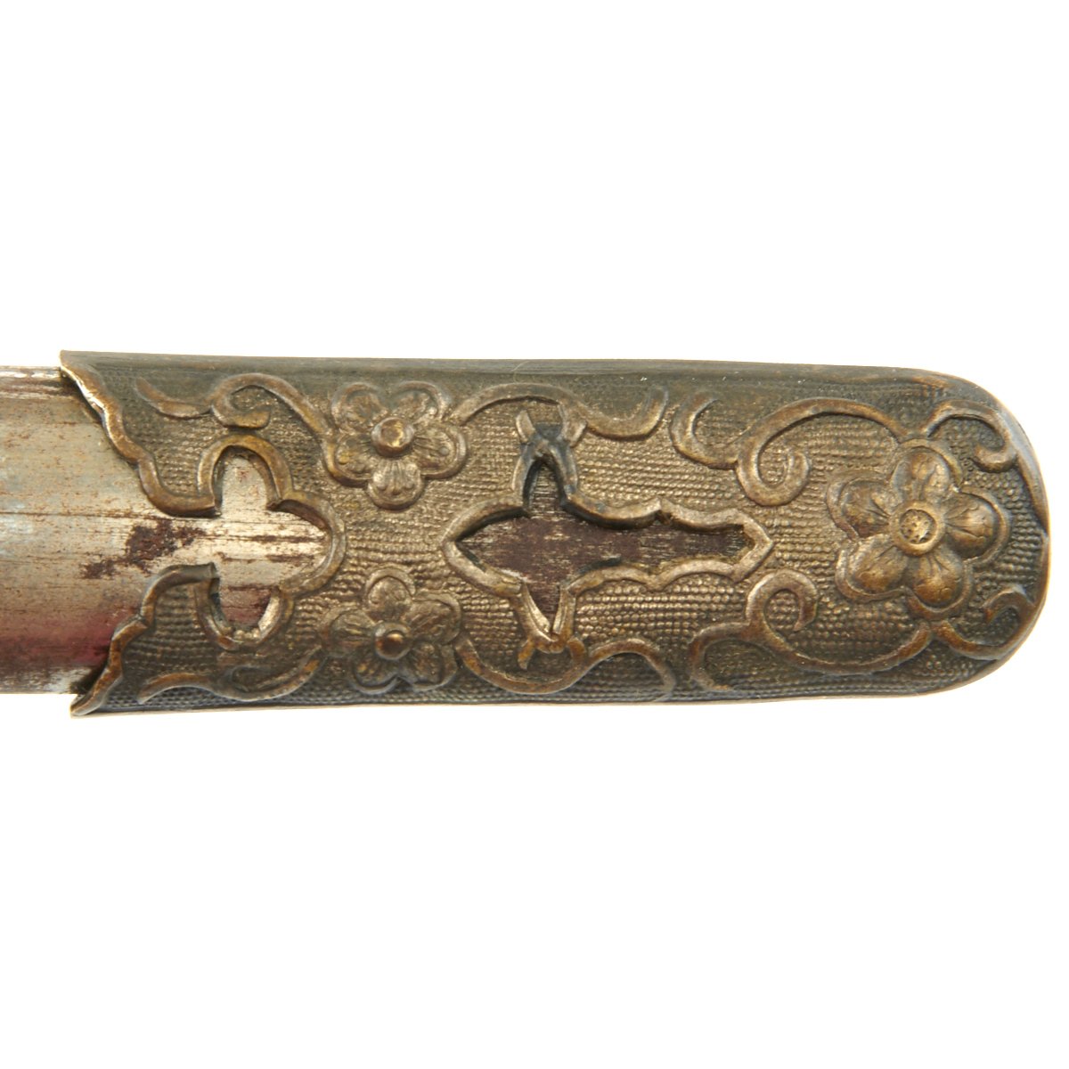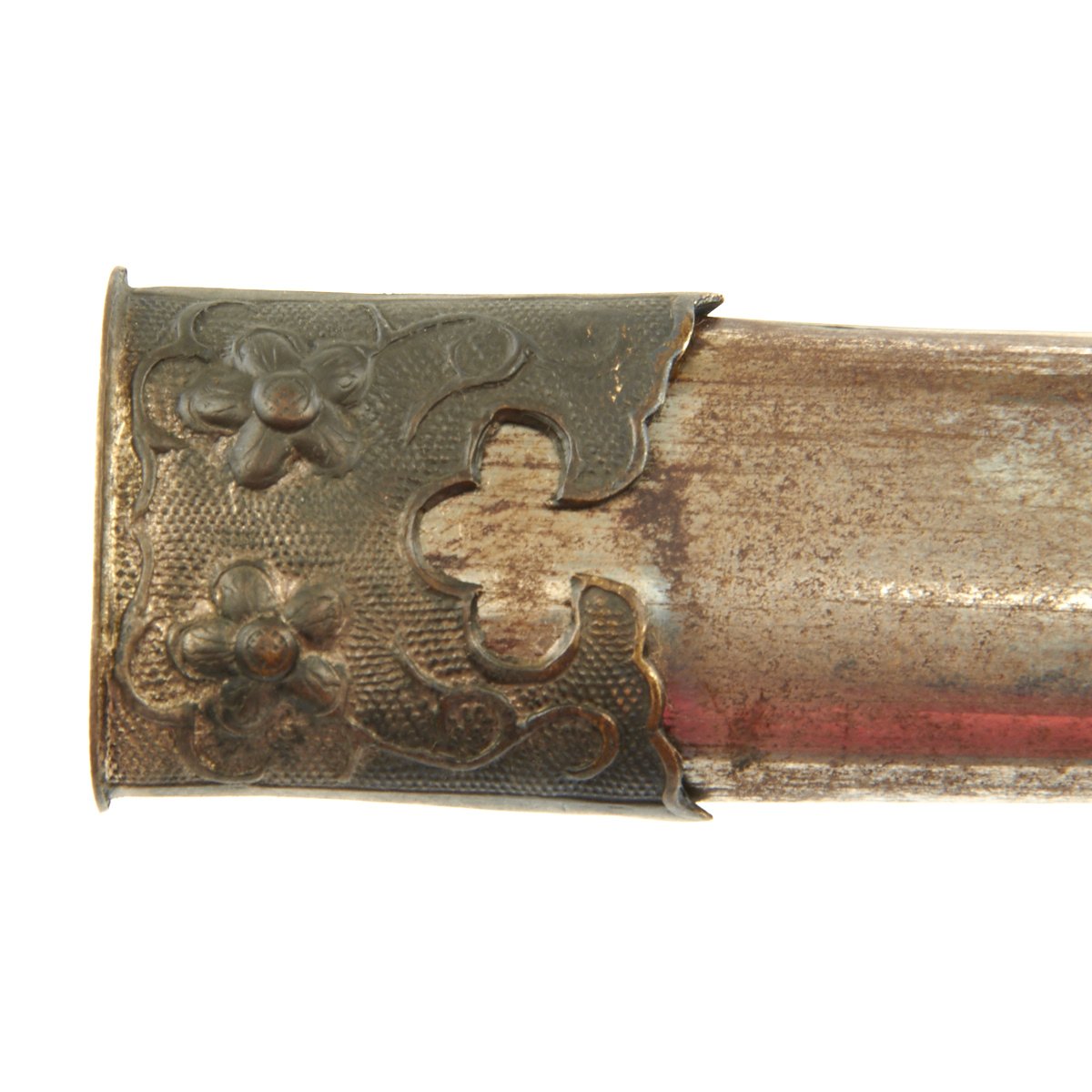 Accompanied by its nickel-plated steel scabbard, magnetic, gilt brass fittings form the chape and locket, each held firmly in place by a single brass screw. The chape illustrates Chinese plum flower floral motif. Scabbard measures 11" in length. Overall a nice condition rare WWII Chinese Army Officer Dagger!