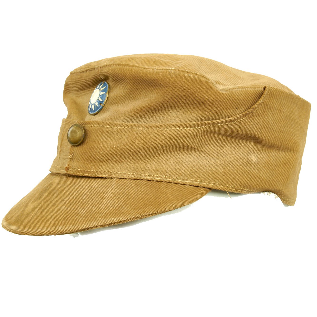 The cap is made from Khaki fabric, and is very similar in design to the German WWI/WWII field cap design, with a "skirt" that goes around the cap, which is folded around the outside. It is also tack stitched in place, so it was most likely was uncommon for it to ever be unfolded. It is lined with light fabric, and has a sweatband that looks to be made of painted leather or rawhide. The front of the cap has a round badge showing a white sun on a blue background, the emblem of the National army.