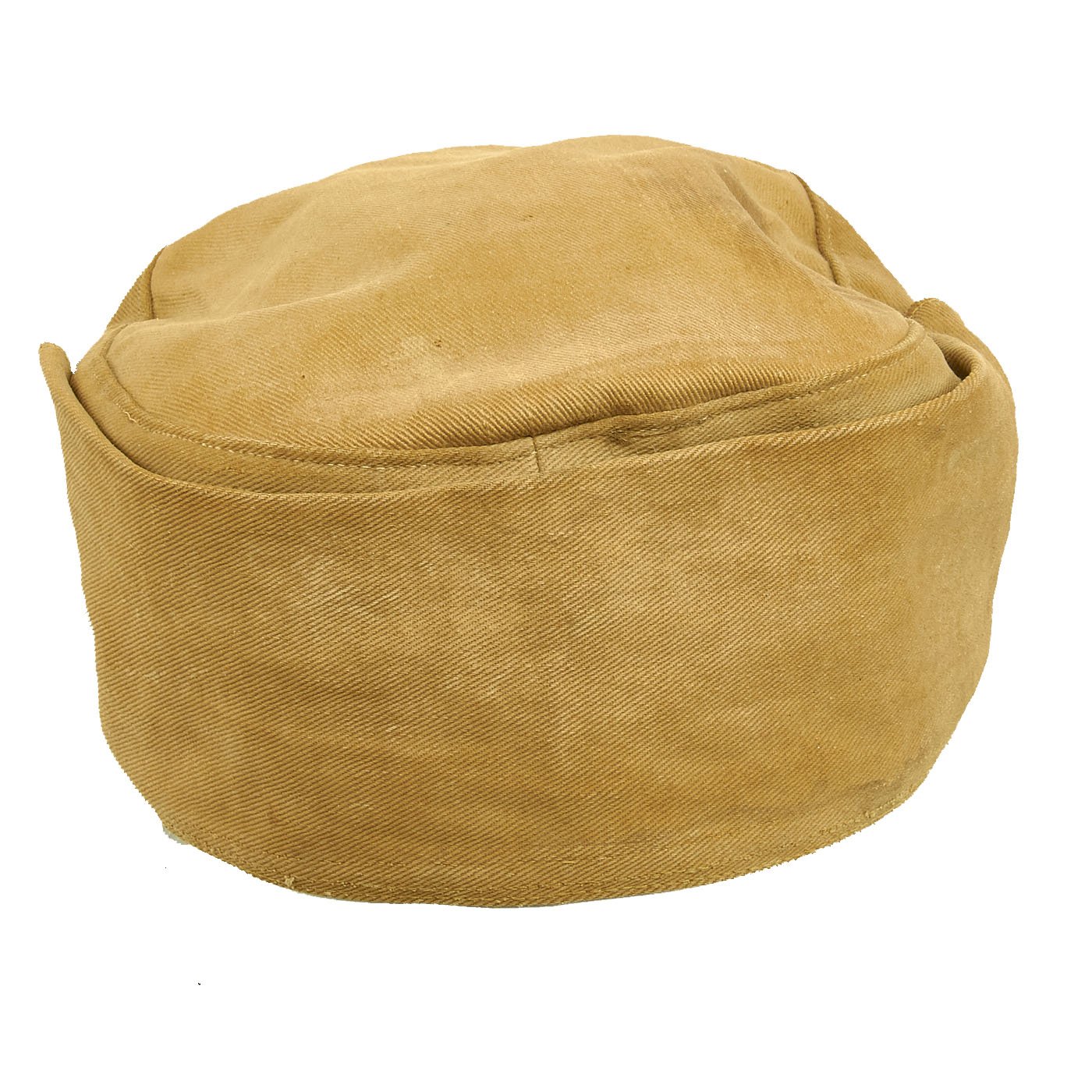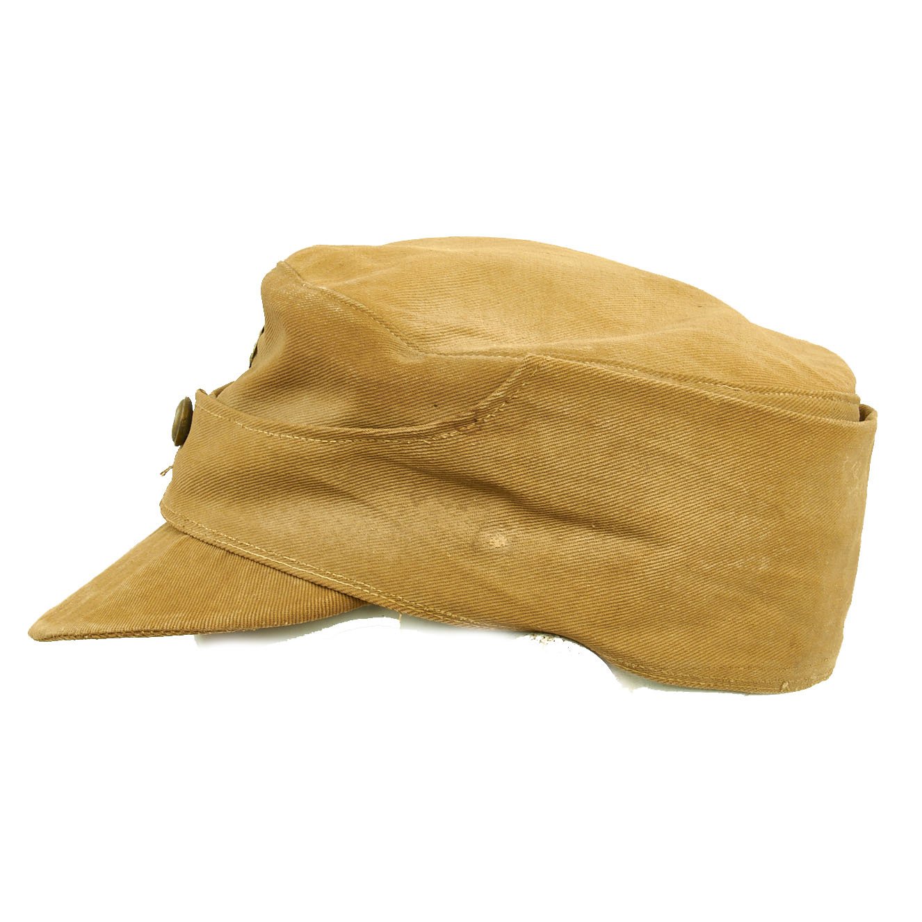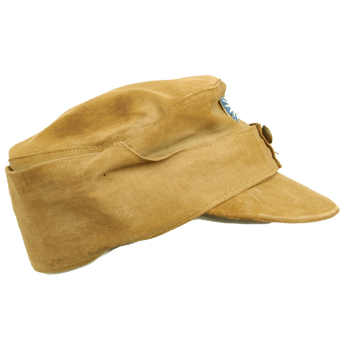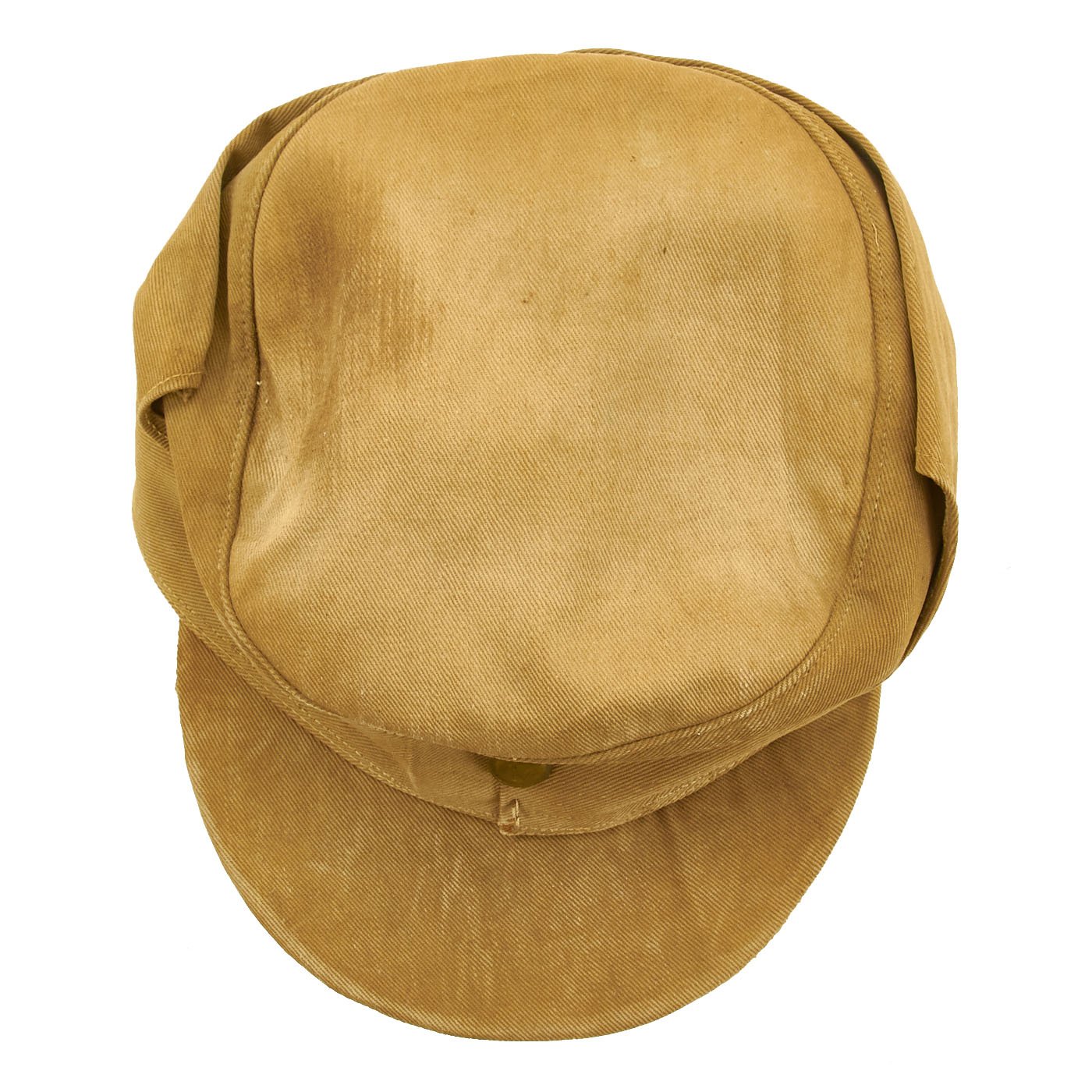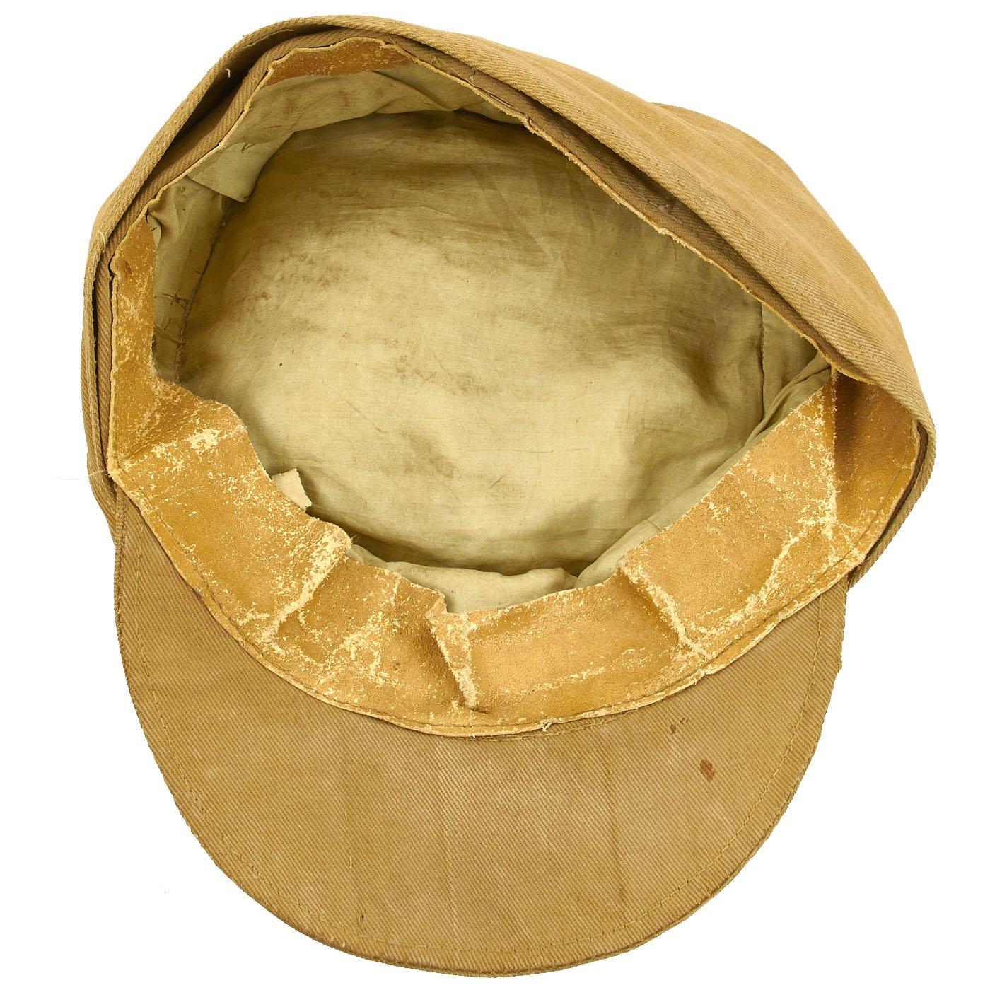 The cap is in very good condition, with the expected wear and staining from service. the sweatband is a bit worn, and one of the two front buttons is missing. Size is relatively small, probably around a 56cm.