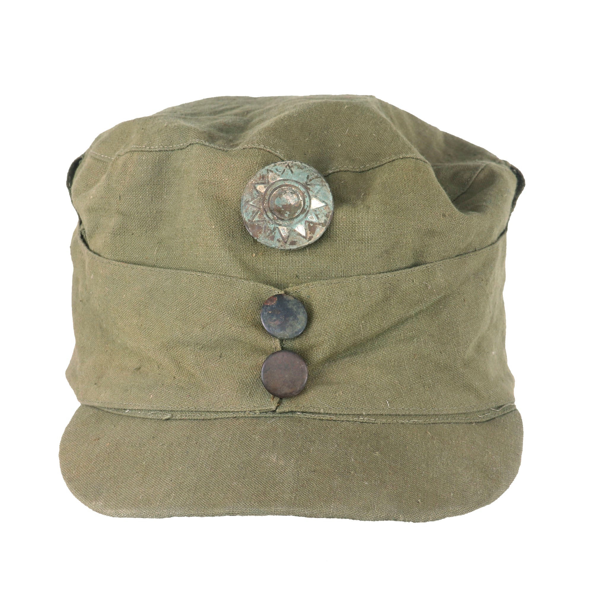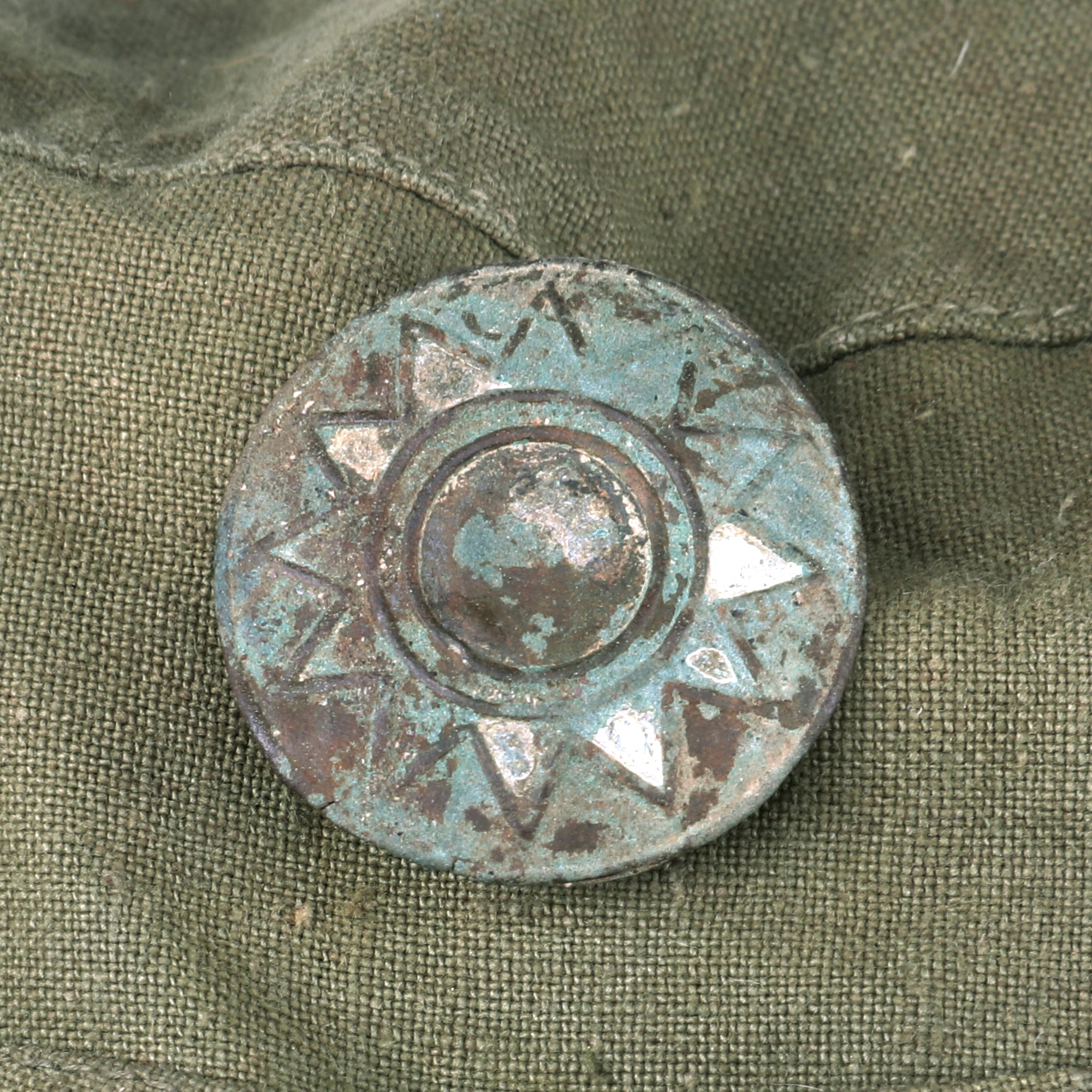 The cap is made from green Khaki fabric, and is very similar in design to the German WWI/WWII field cap design, with a "skirt" that goes around the cap, which is folded around the outside. It is also tack stitched in place, so it was most likely uncommon for it to ever be unfolded. It is lined with light fabric, and has no sweatband. The front of the cap has a round badge showing a white sun on a blue background, the emblem of the National army, but is rather worn and has some verdigris.