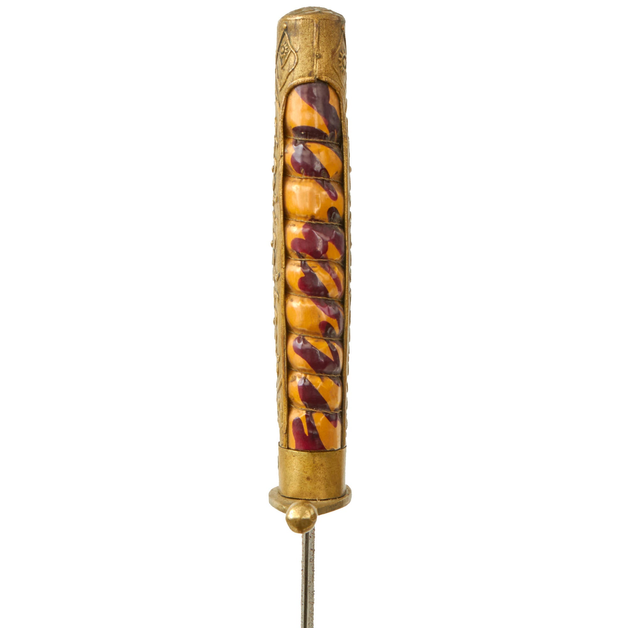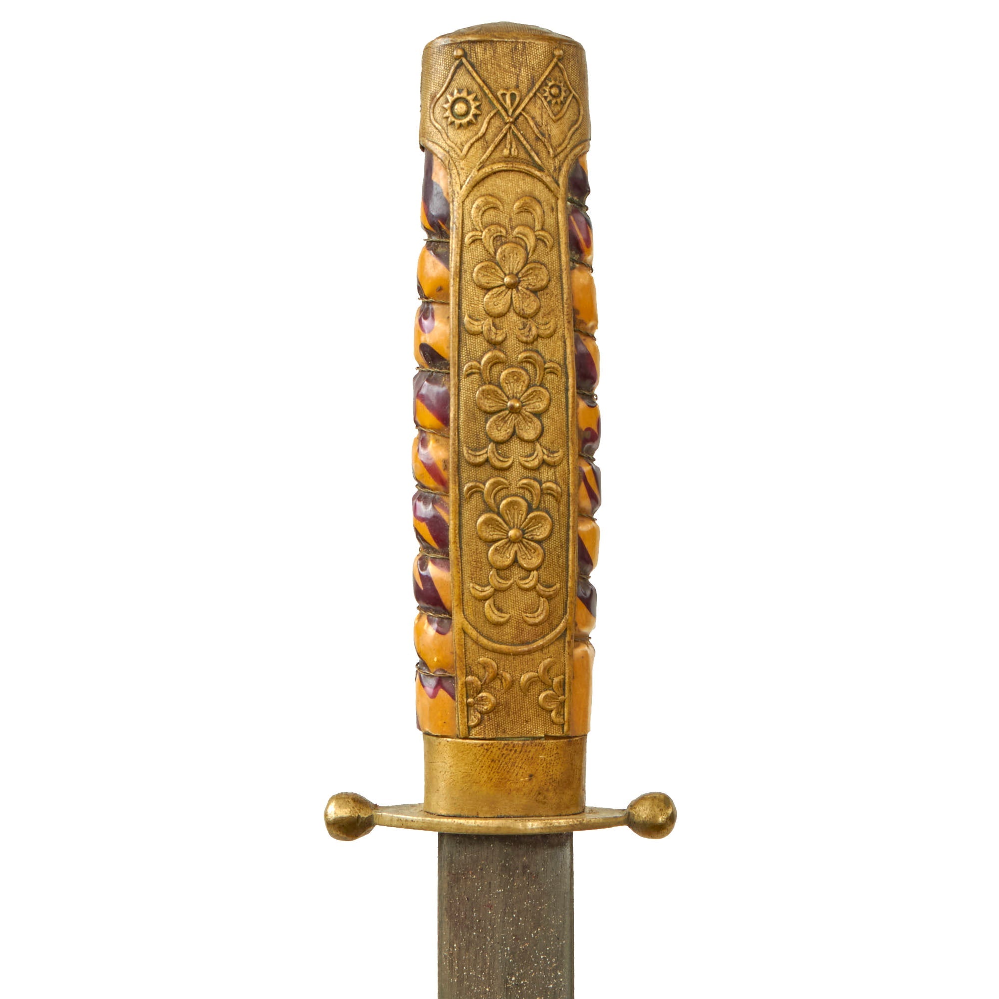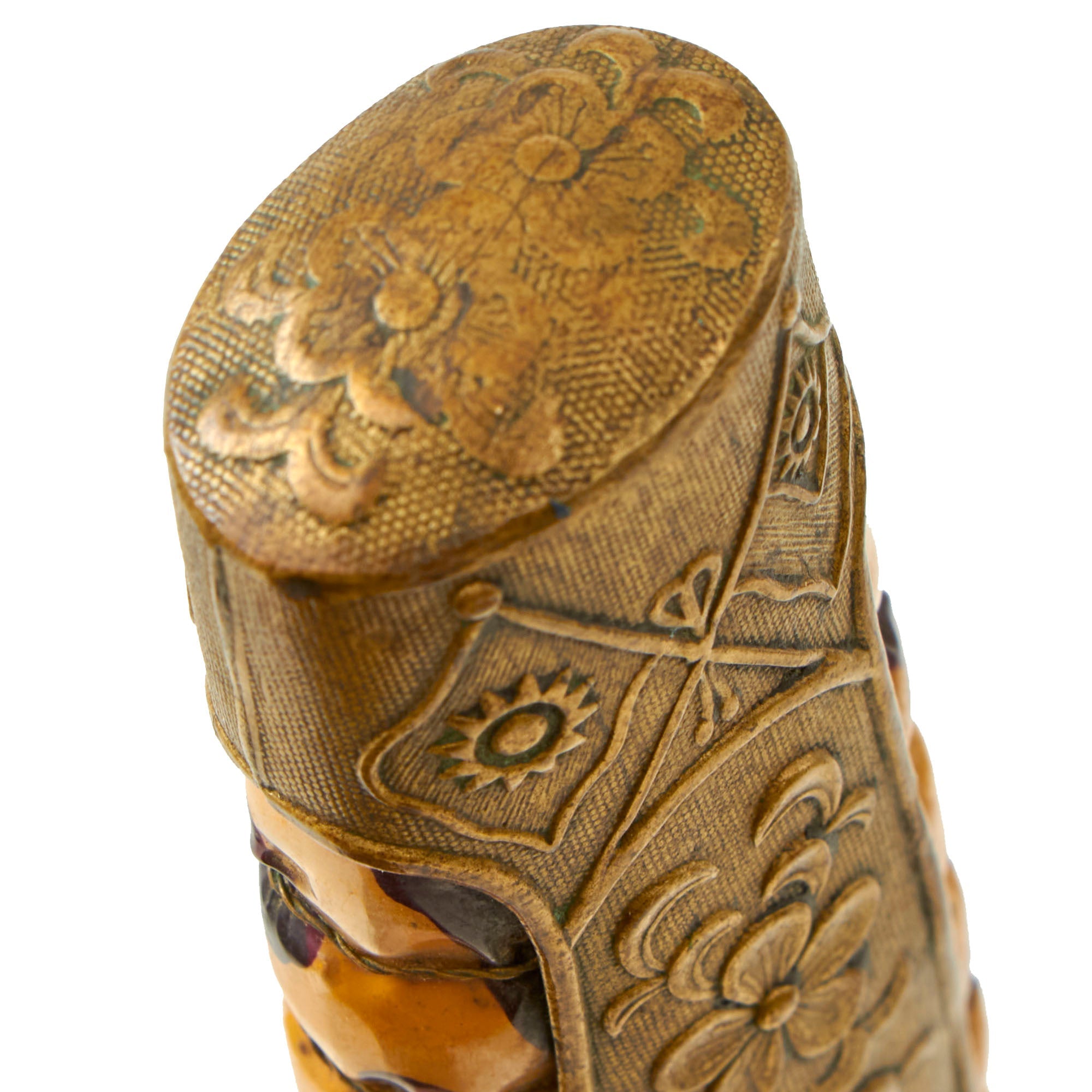 It has a brass crossguard that sits tight against the adjoining ferrule, which is held in place with a single brass screw. The handle is fabricated from age-toned multicolored celluloid, with eight rows of wire wrap, with decorative brass panels on each side, which come together at the pommel. These show some Chinese plum blossoms underneath two rice plants, which are under the Kuomintang sun emblem. At the pommel there are more plum blossoms. Overall condition is fantastic, showing wear and age related damage. The handle and crossguard are tight on the blade tang, which is rare to see.