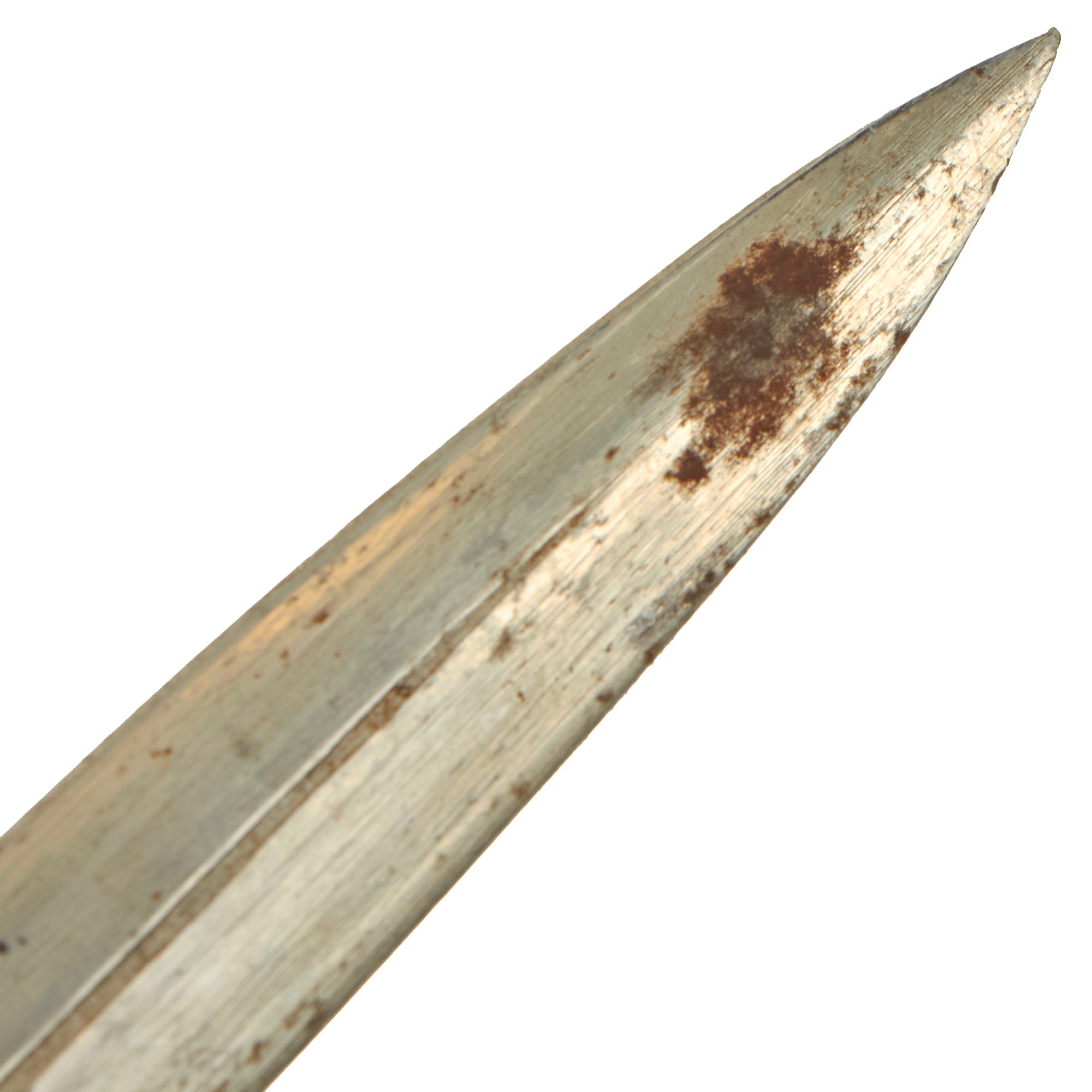 These officer's daggers were both finely and crudely made, with a great deal of variation apparent among surviving examples. This example is one of the mid level variety, and measures approximately 16" with the scabbard on. Unsheathed, it is 14" long with a 9 1/2" nickel-plated steel blade, magnetic, with dull edges. The plating is retained very well, with only a bit missing near the cross guard, and a few spots of oxidation. Overall it is very good and shiny, with just a tiny bit of tip damage and staining.