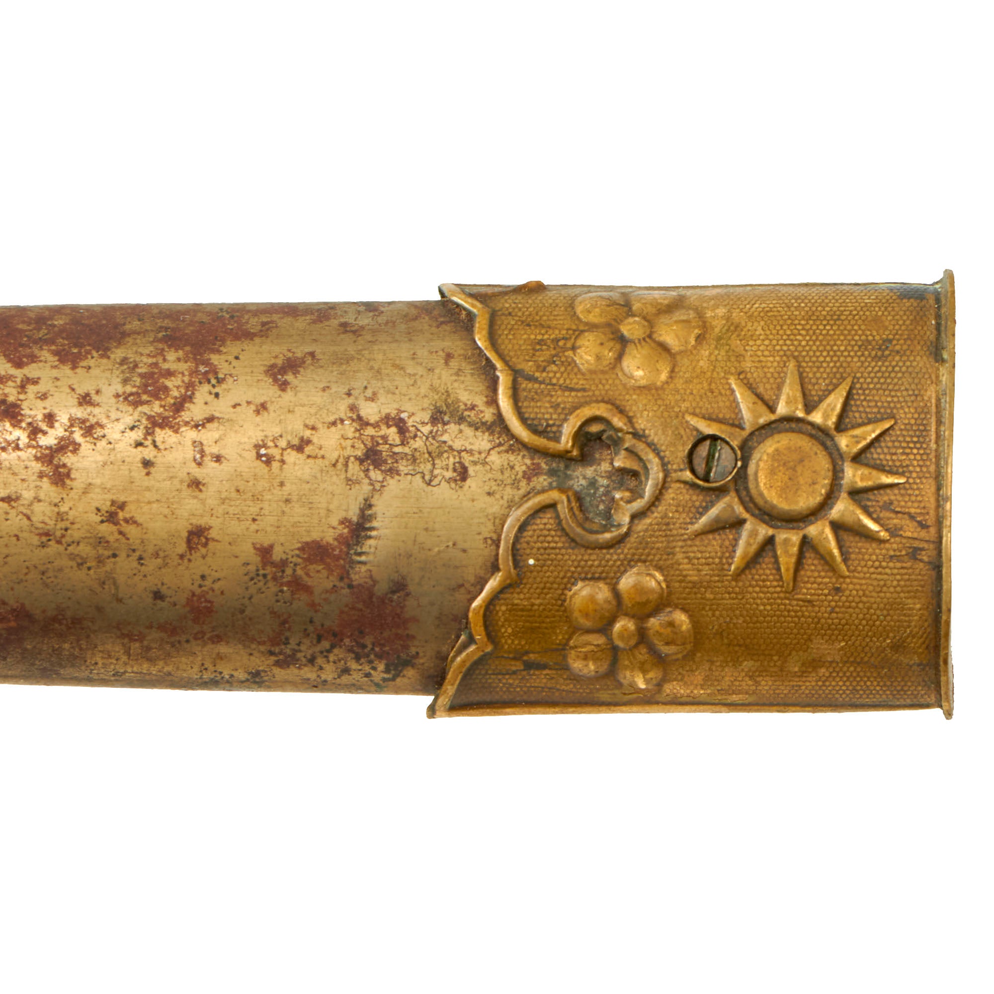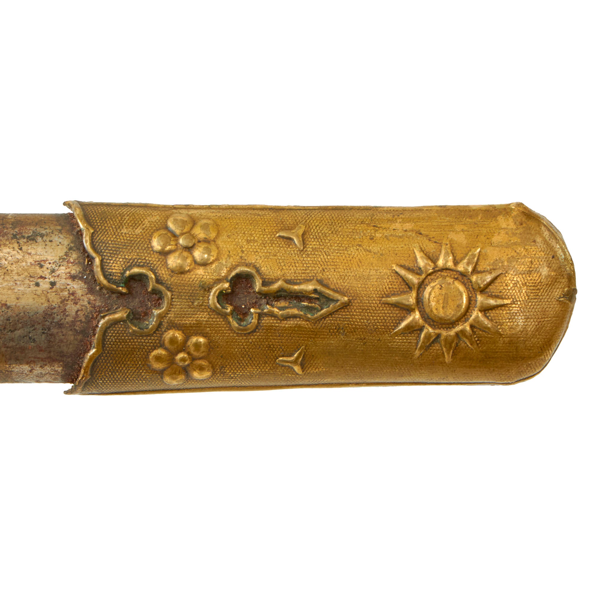 The dagger comes with what looks to be a non-magnetic nickel alloy scabbard, which was originally painted brown. Most of this paint is now missing, and there is oxidation to the metal of the scabbard body. There are brass fittings for the throat and drag. Both fittings have several Chinese "Sun" emblems, as well as plum blossoms and foliate designs. A great piece.
