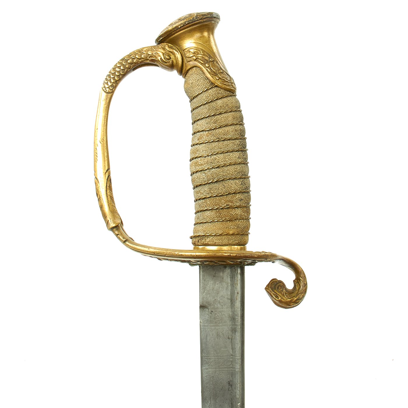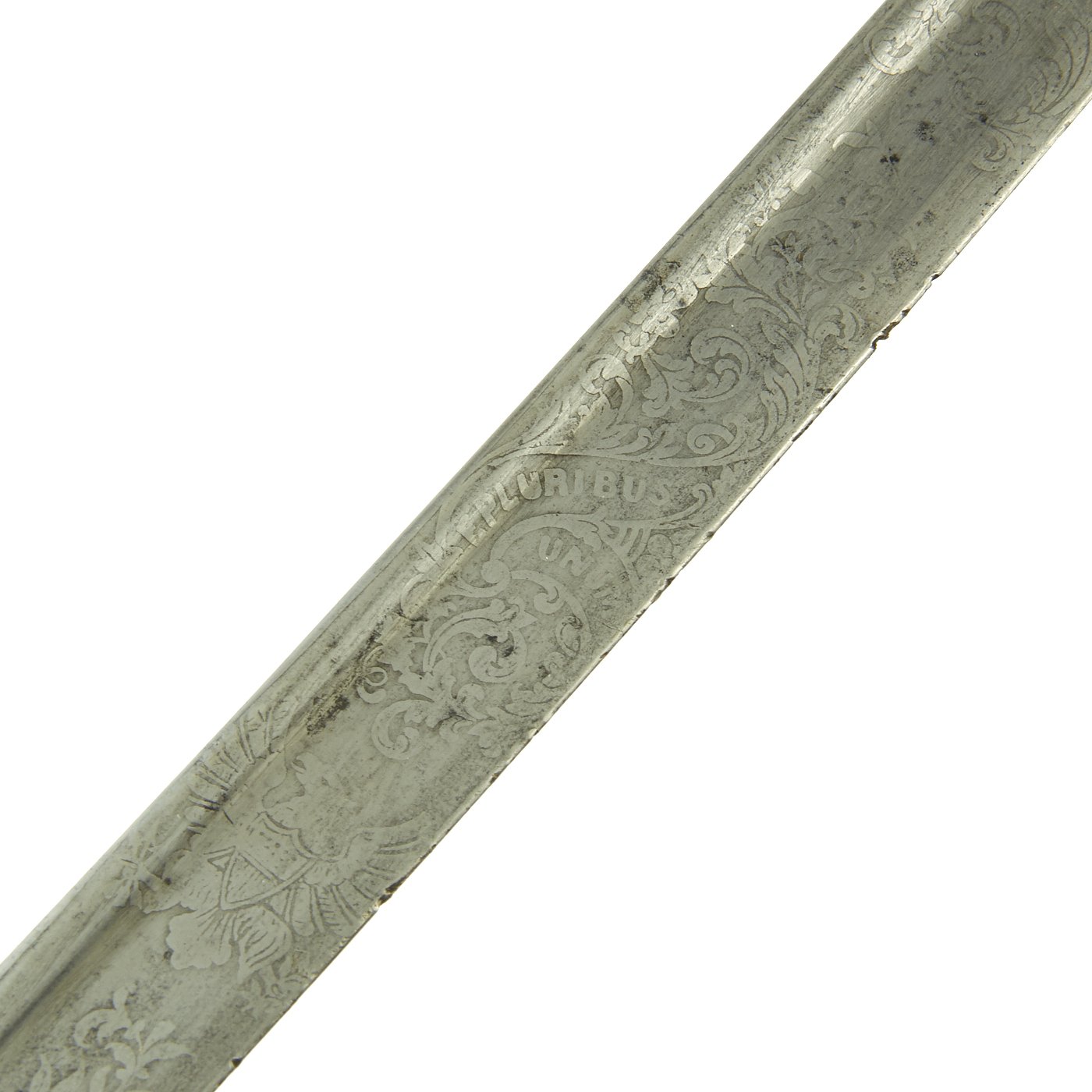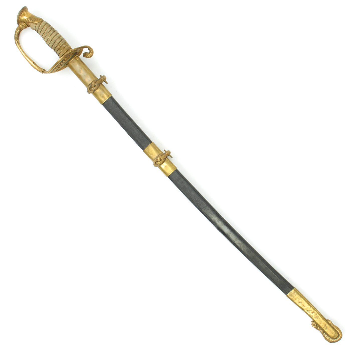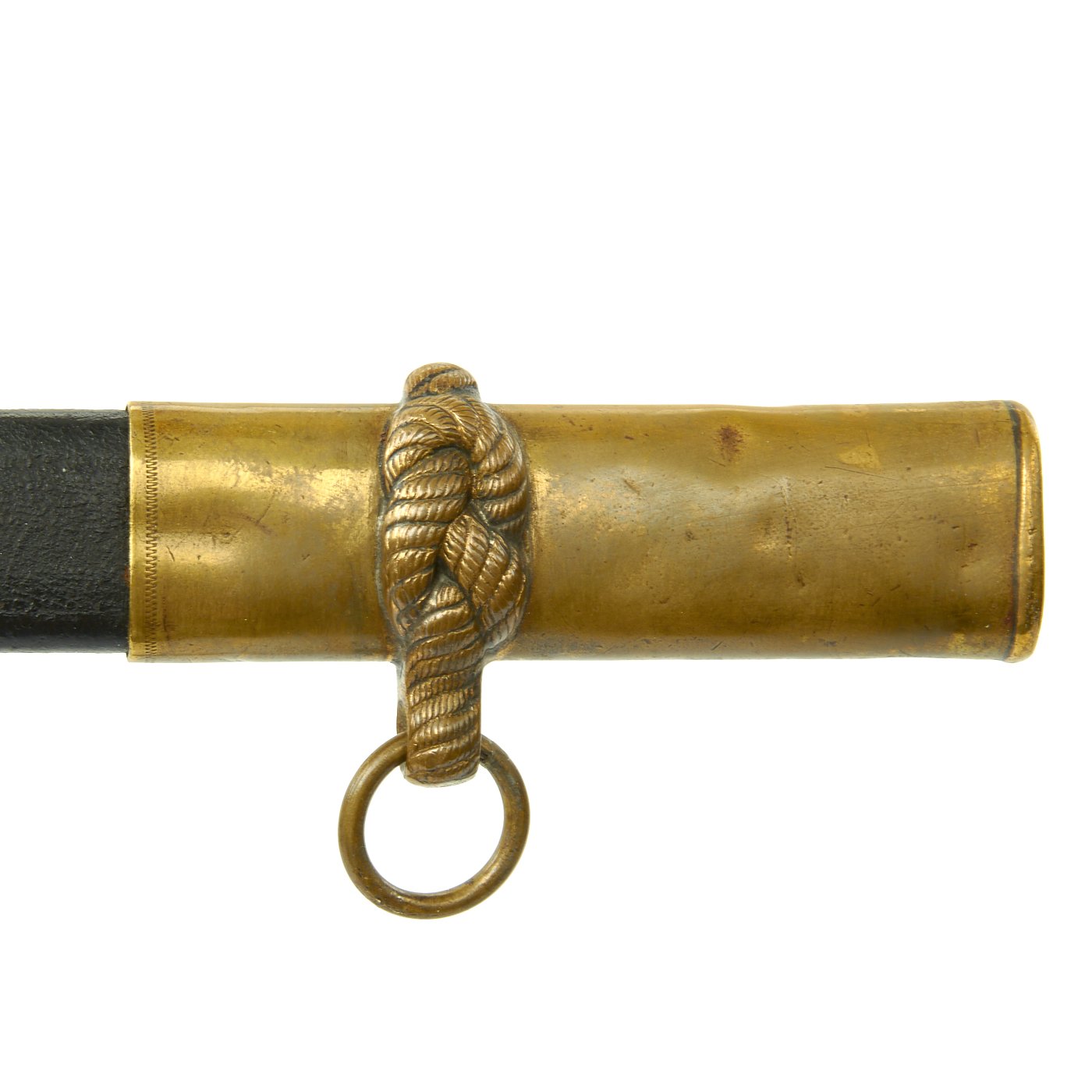 Original Item: Only one available. This is a real beauty! It is a very nice U.S. Navy Model 1852 Dress sword, fitted with a very nice 29 inch long pipe back blade, with 2/3 of it with etched decorations. Most of these are nice foliate decoration, including stands of arms with E. PLURIBUS UNUM and U.S.. The sword measures 35 1/2 inches overall, and is contained in a fine leather scabbard that is brass mounted, with knotted rope base fittings for the suspension rings, which are both present. There is also an entire sea serpent wrapped around the bottom mount, the drag. There is a small repair to the leather about 14 inches above the drag.