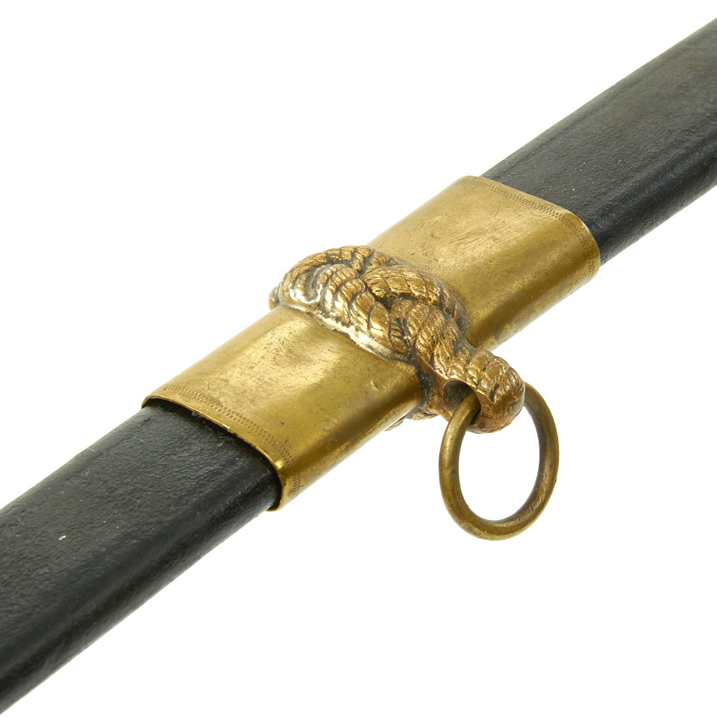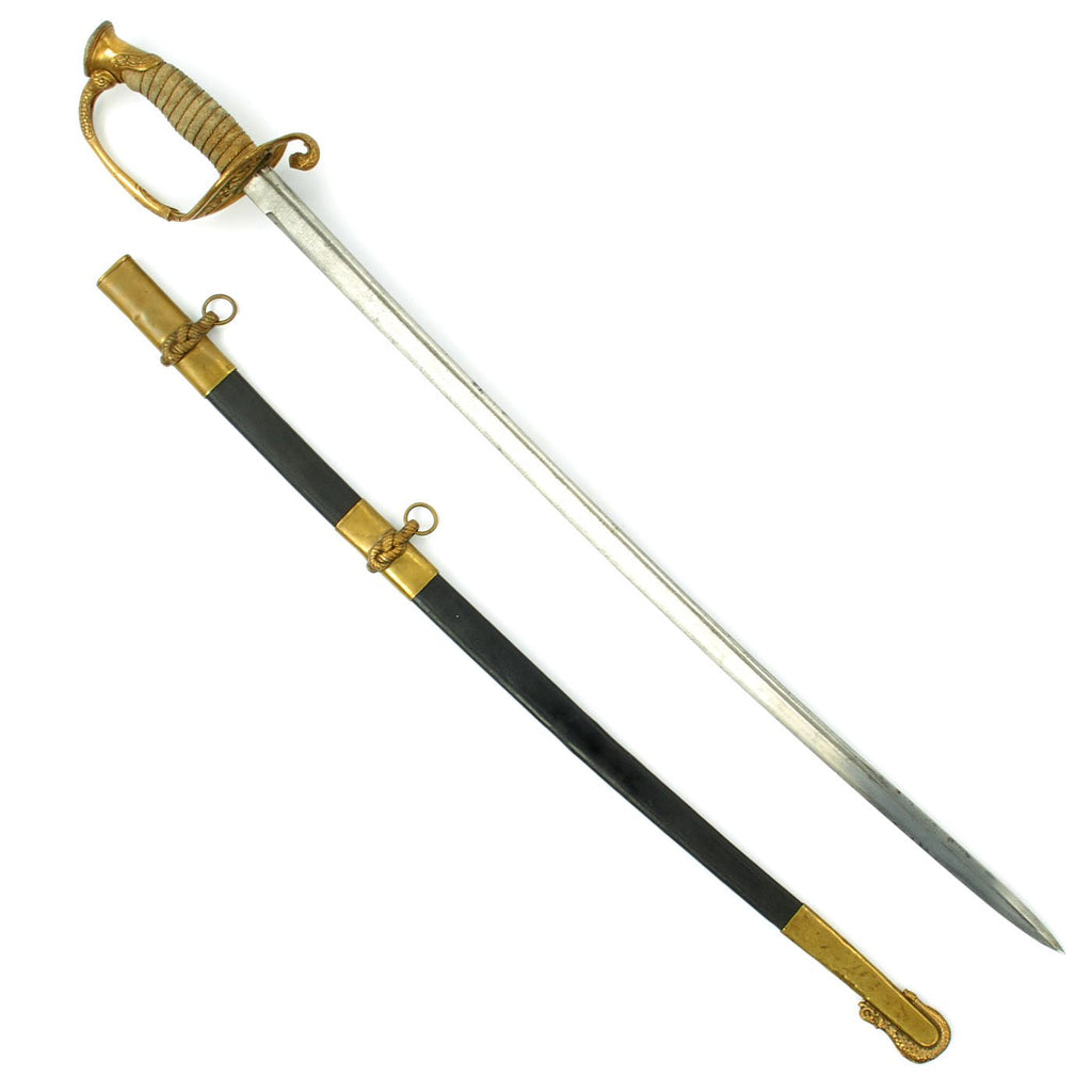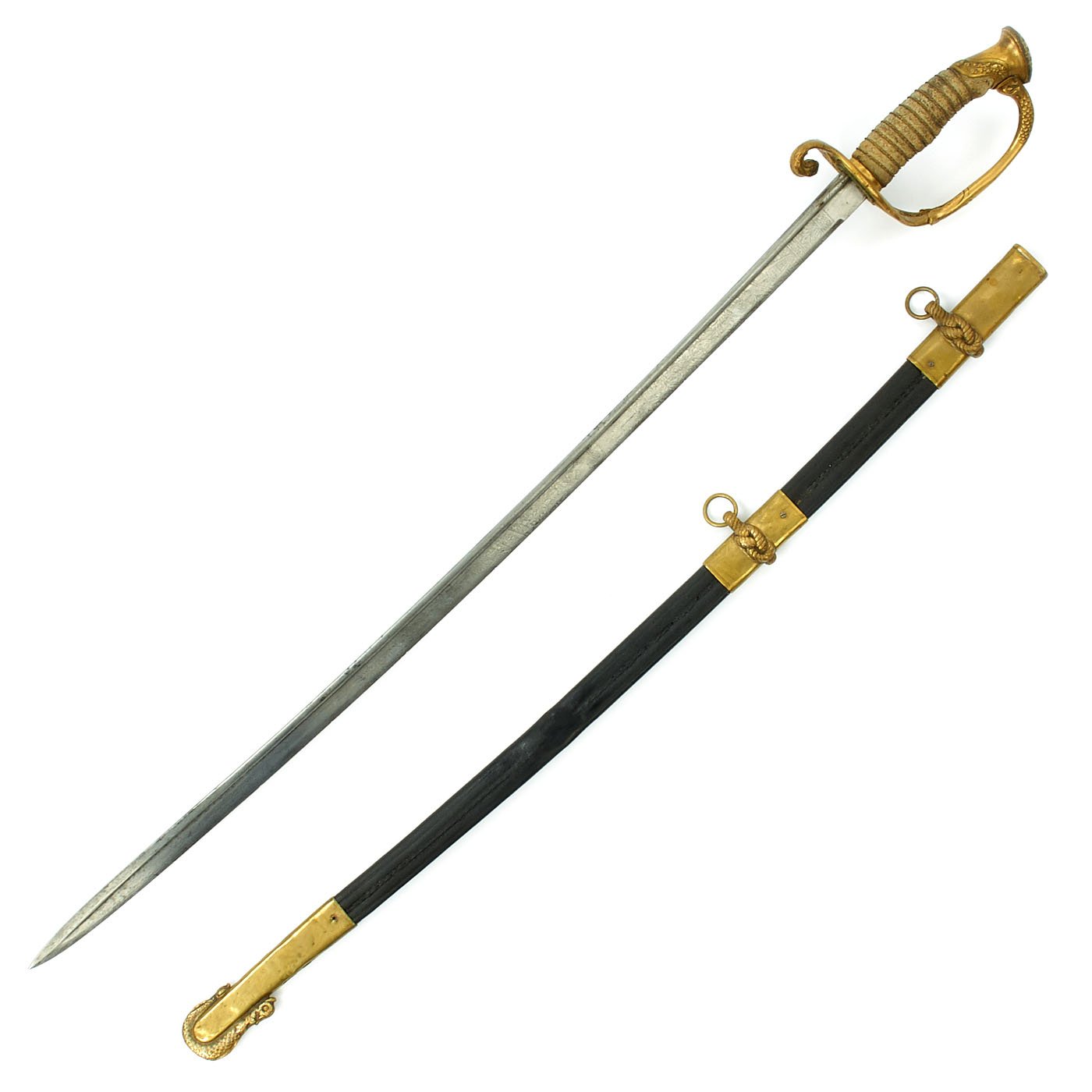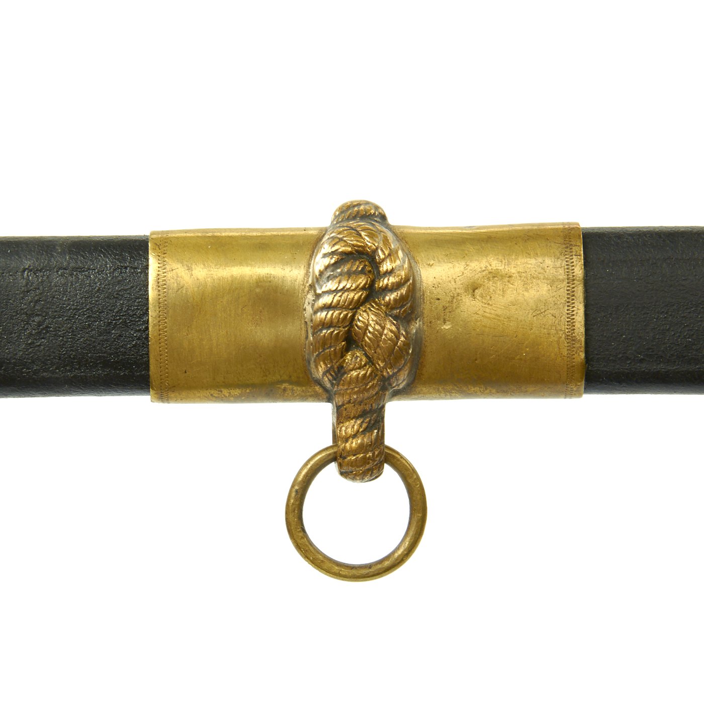 Original Item: Only one available. This is a real beauty! It is a very nice U.S. Navy Model 1852 Dress sword, fitted with a very nice 29 inch long pipe back blade, with 2/3 of it with etched decorations. Most of these are nice foliate decoration, including stands of arms with E. PLURIBUS UNUM and U.S.. The sword measures 35 1/2 inches overall, and is contained in a fine leather scabbard that is brass mounted, with knotted rope base fittings for the suspension rings, which are both present. There is also an entire sea serpent wrapped around the bottom mount, the drag. There is a small repair to the leather about 14 inches above the drag.