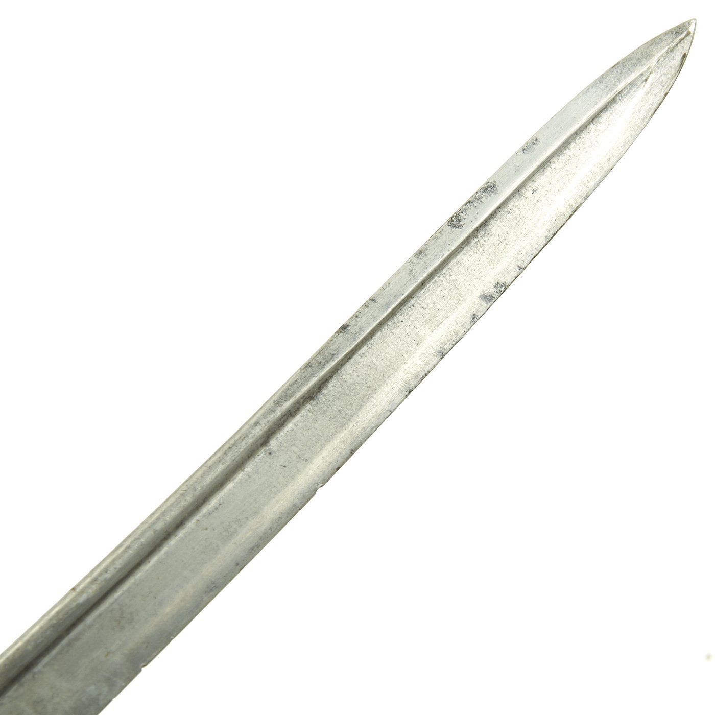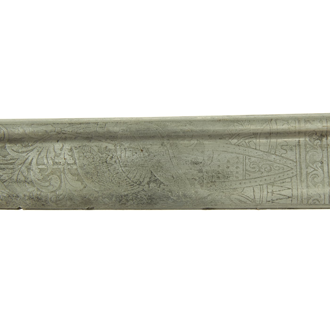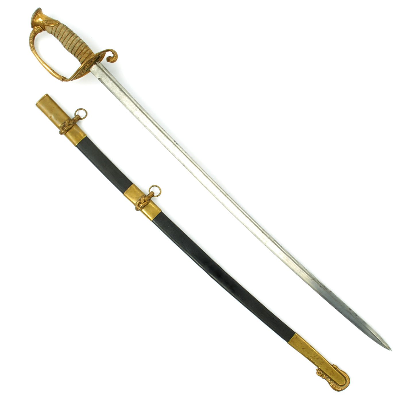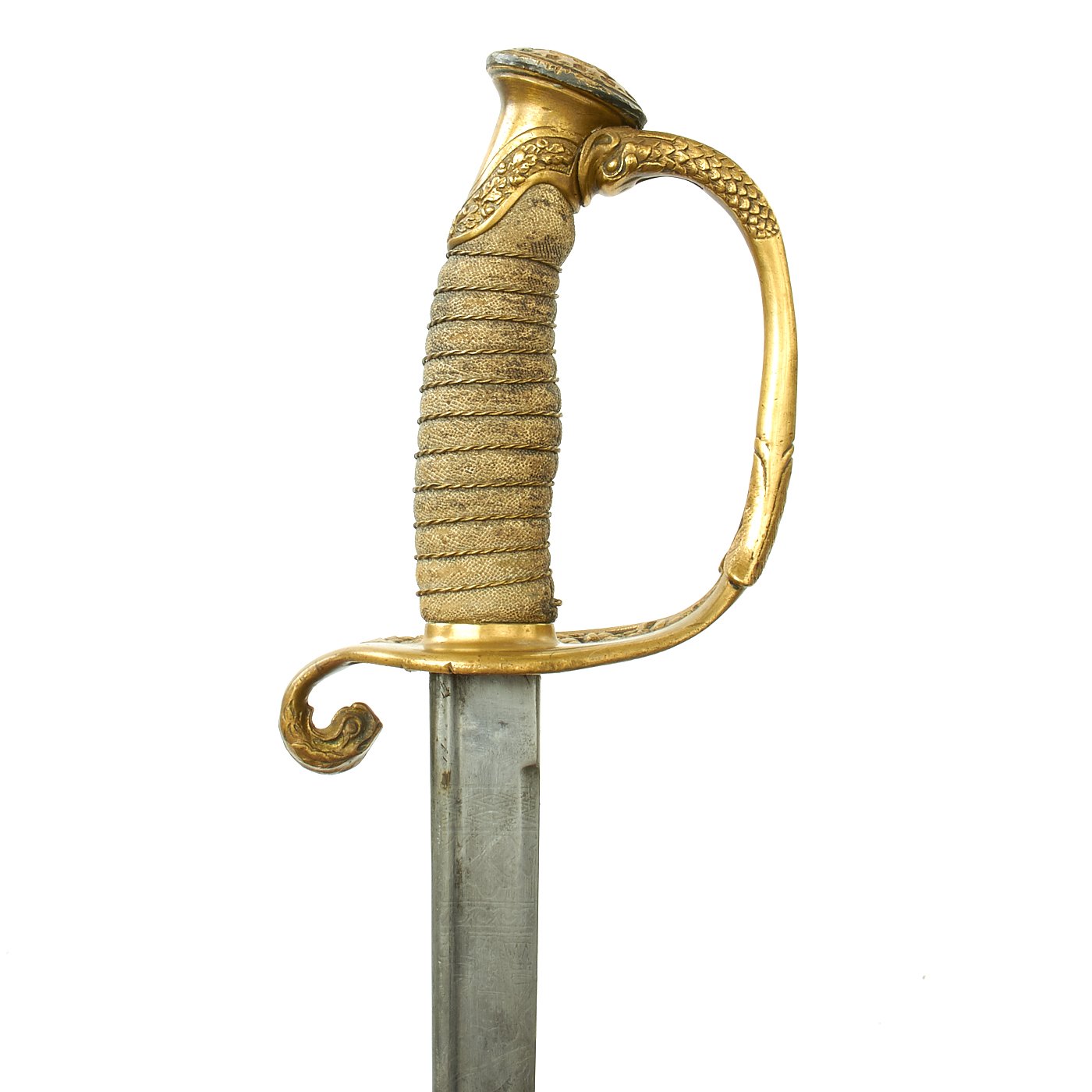 Original Item: Only one available. This is a real beauty! It is a very nice U.S. Navy Model 1852 Dress sword, fitted with a very nice 29 inch long pipe back blade, with 2/3 of it with etched decorations. Most of these are nice foliate decoration, including stands of arms with E. PLURIBUS UNUM and U.S.. The sword measures 35 1/2 inches overall, and is contained in a fine leather scabbard that is brass mounted, with knotted rope base fittings for the suspension rings, which are both present. There is also an entire sea serpent wrapped around the bottom mount, the drag. There is a small repair to the leather about 14 inches above the drag.