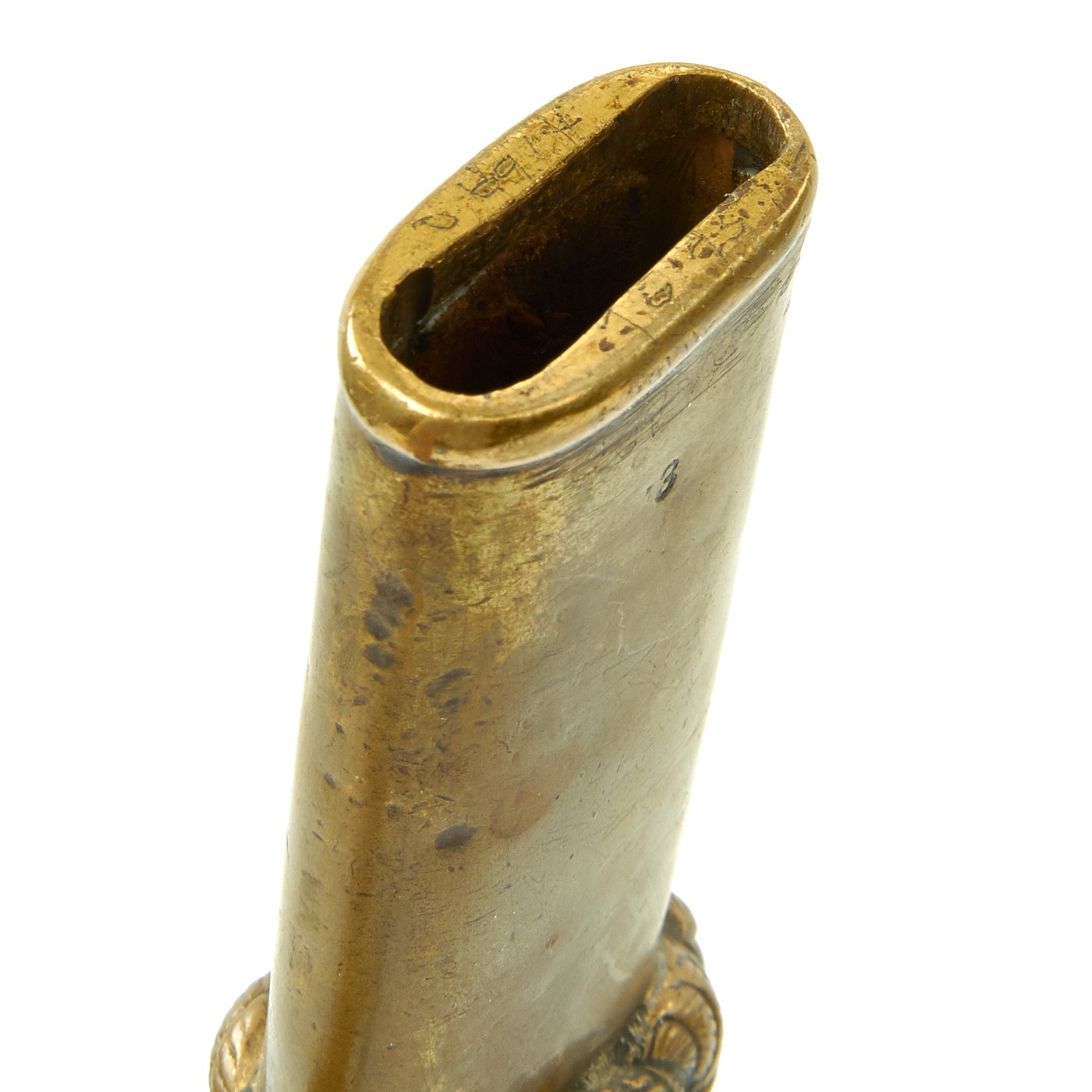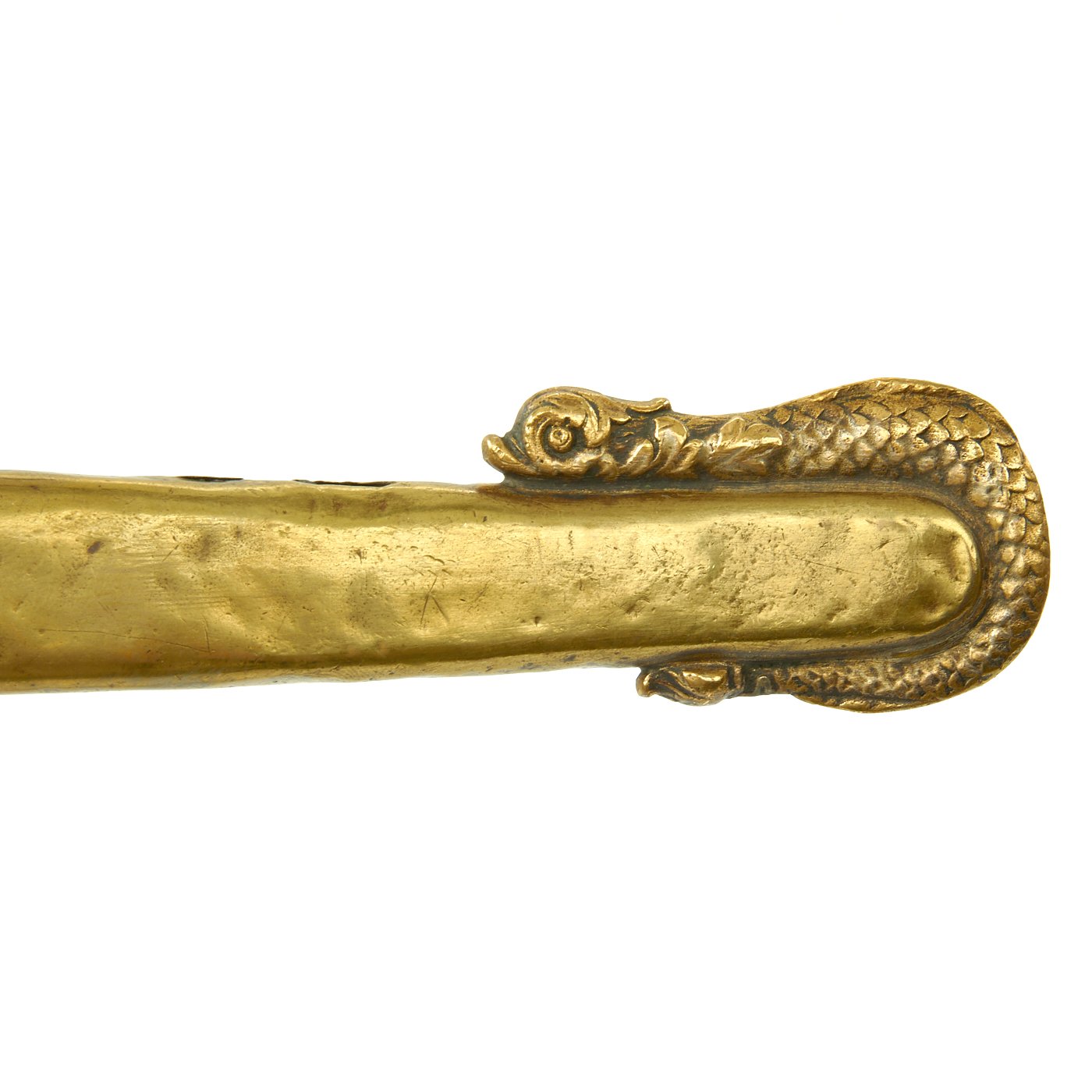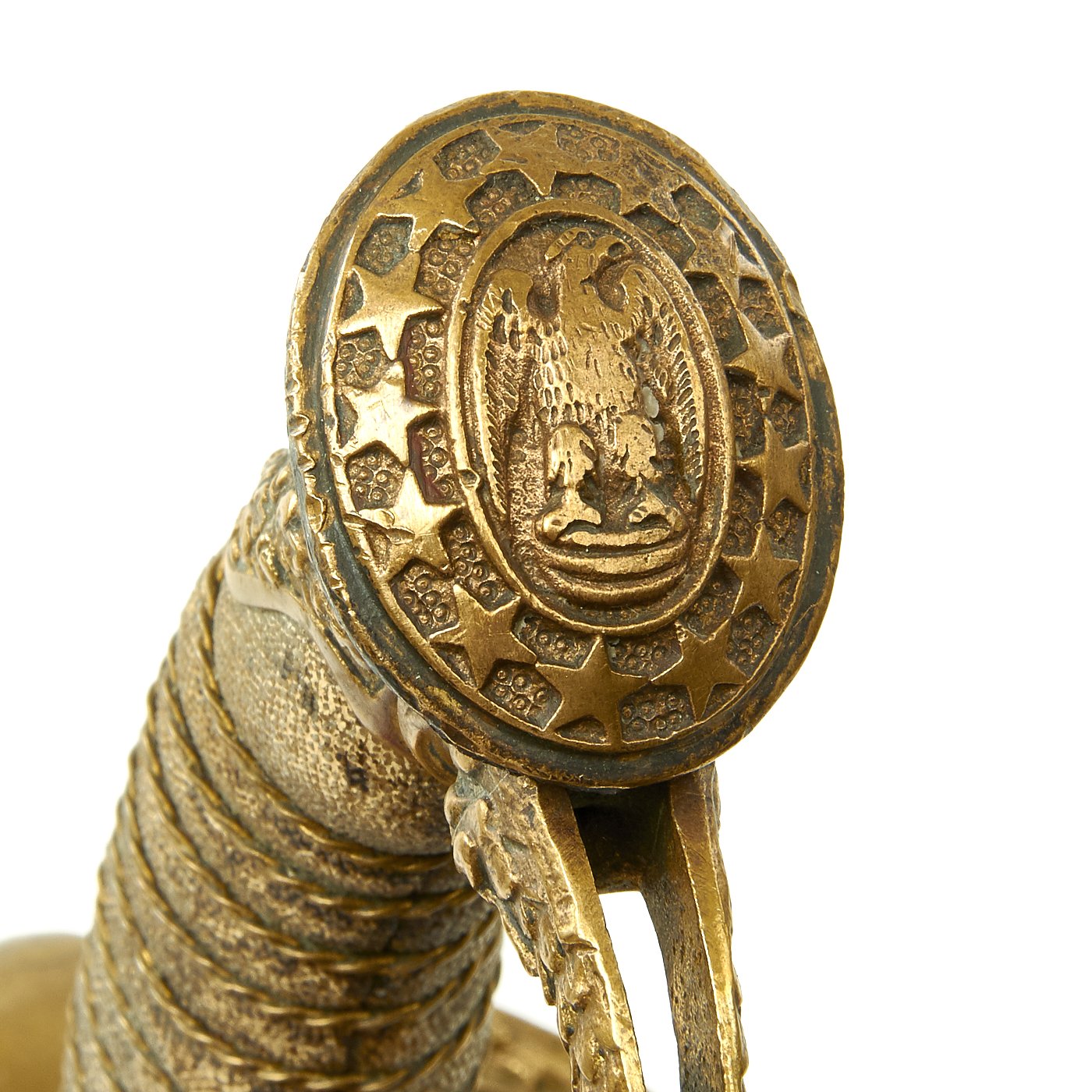 The sword's hand guard is elaborately molded again with a sea serpent as part of the bow. The grip is wrapped shark skin and is brass wire bound. The part basket is embossed Oak leaves and acorns and displays the letters U.S.N.. The pommel shows an eagle surrounded by 13 Stars. All the brass mounts were originally gold washed or plated and much is still evident after maybe 160/170 years.