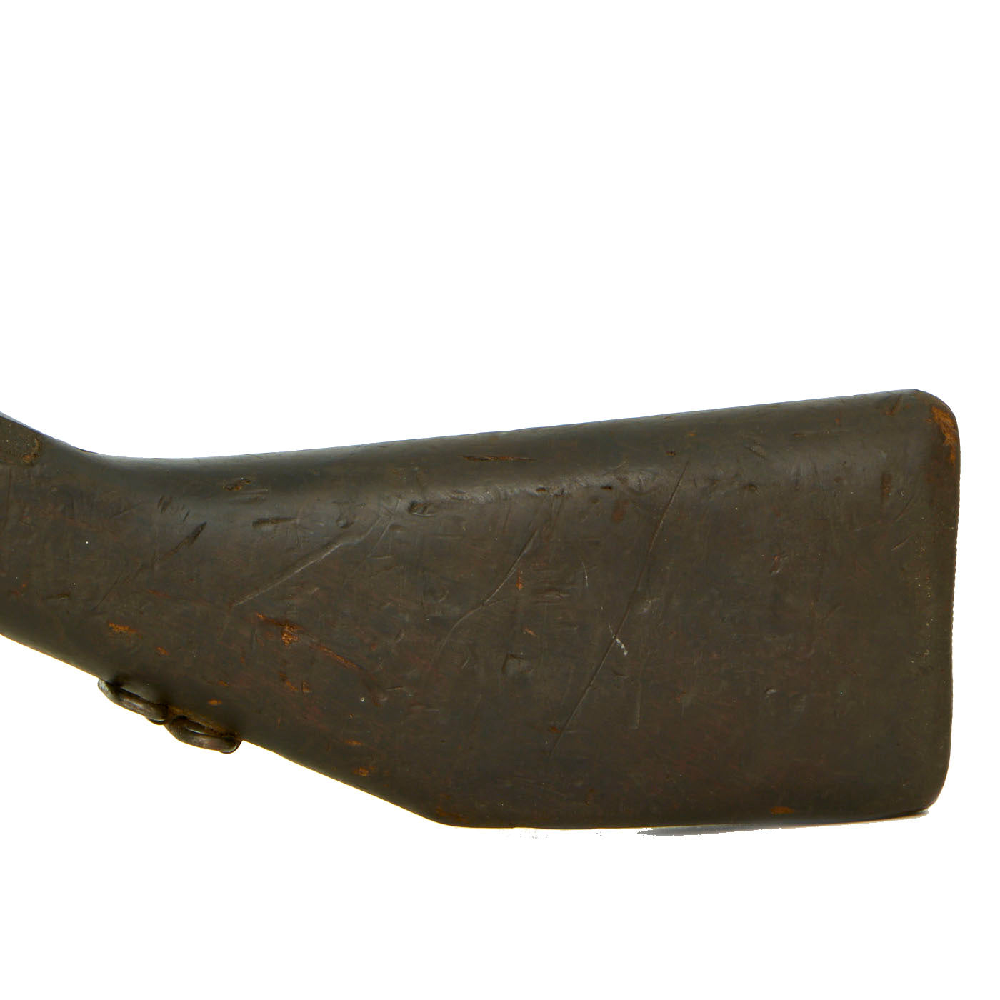 Complete with original issued bipod, wood butt stock, and detachable magazine, our display gun still has an operational hammer and trigger assembly so weapon can be cocked using the charging lever and dry fired. Also included is a very nice leather Madsen magazine pouch, which is empty. In 8mm (German) this became a very reliable weapon for the Third Reich in WWII.