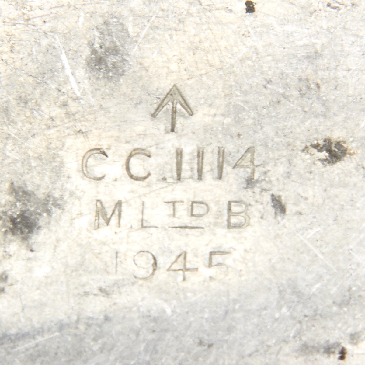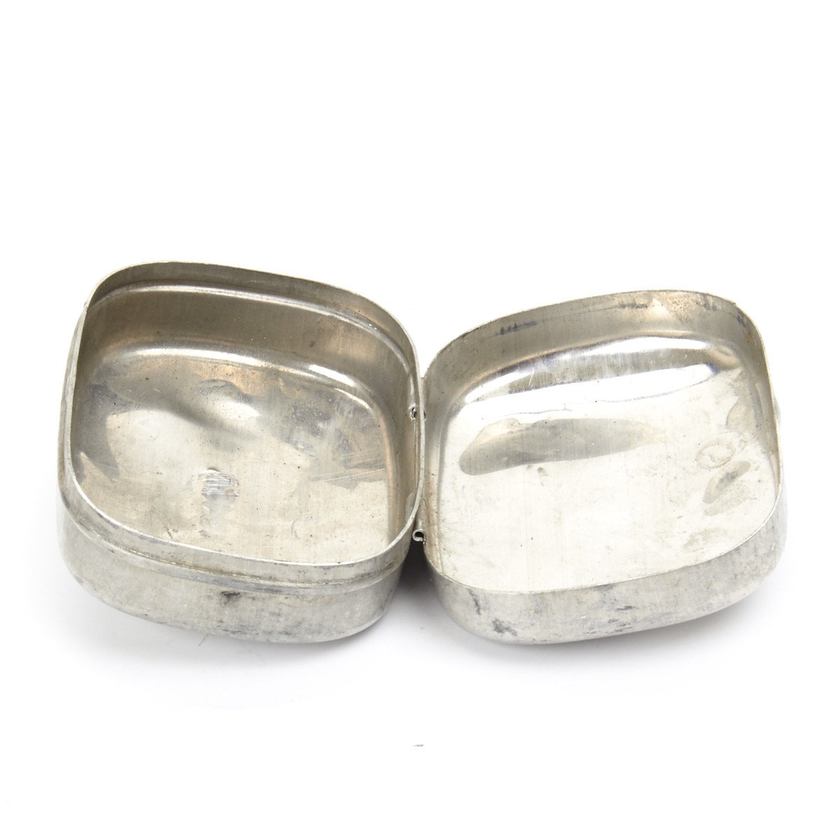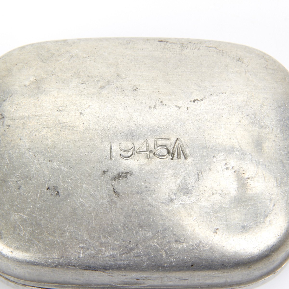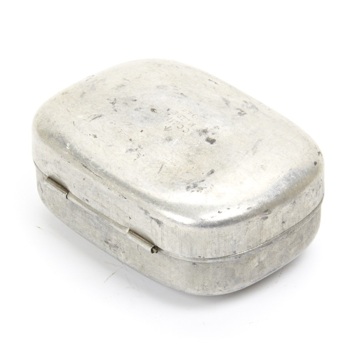 Original Item: These are British WWII dated and Broad Arrow marked aluminum 2 1/2" x 3 1/2" aluminum case containers with hinged tight fit lids. Referred to as Soap Dishes; these were widely used for survival gear such a compass, fish hook and line, water purification tablets, matches, snare wire and even condoms (for use as water bags).