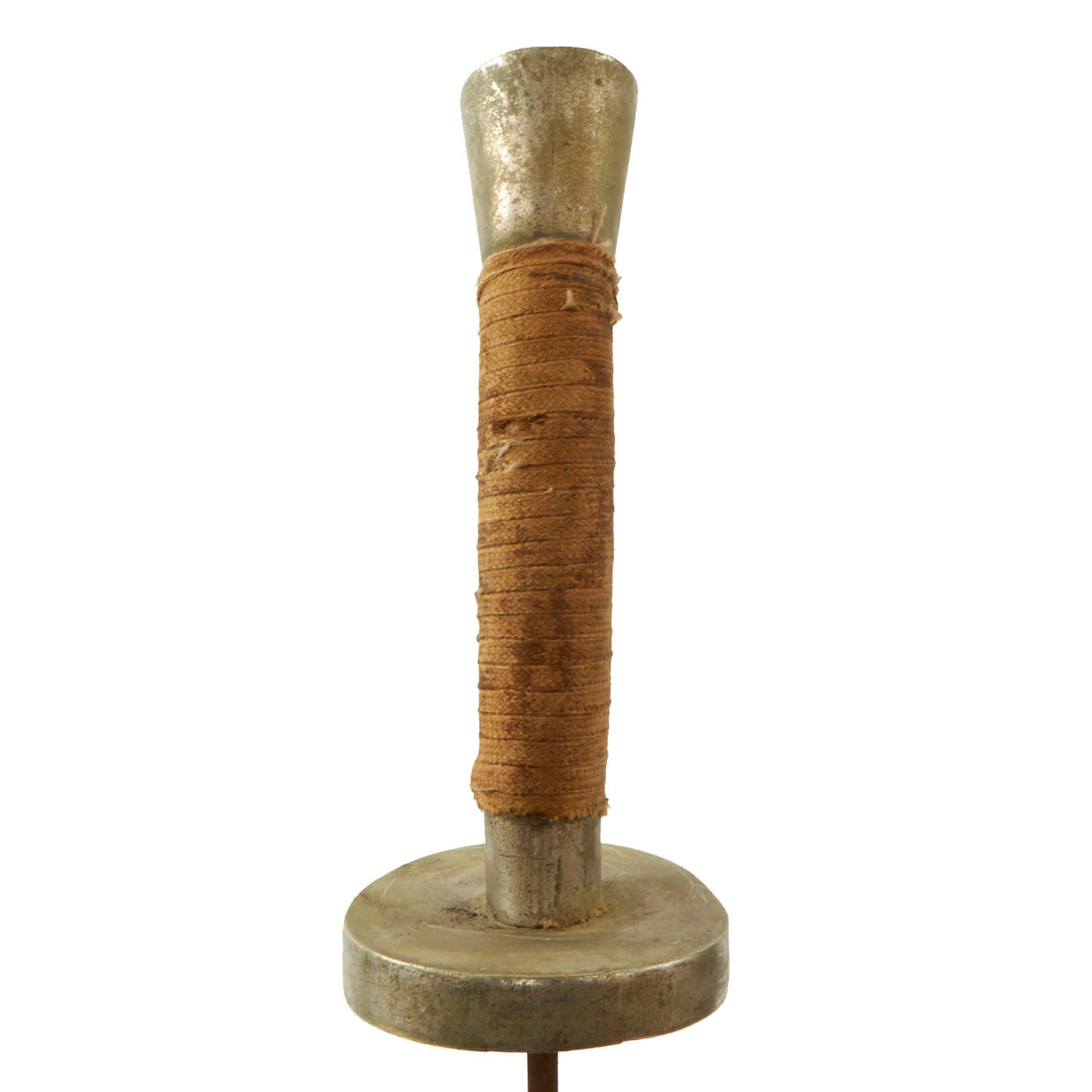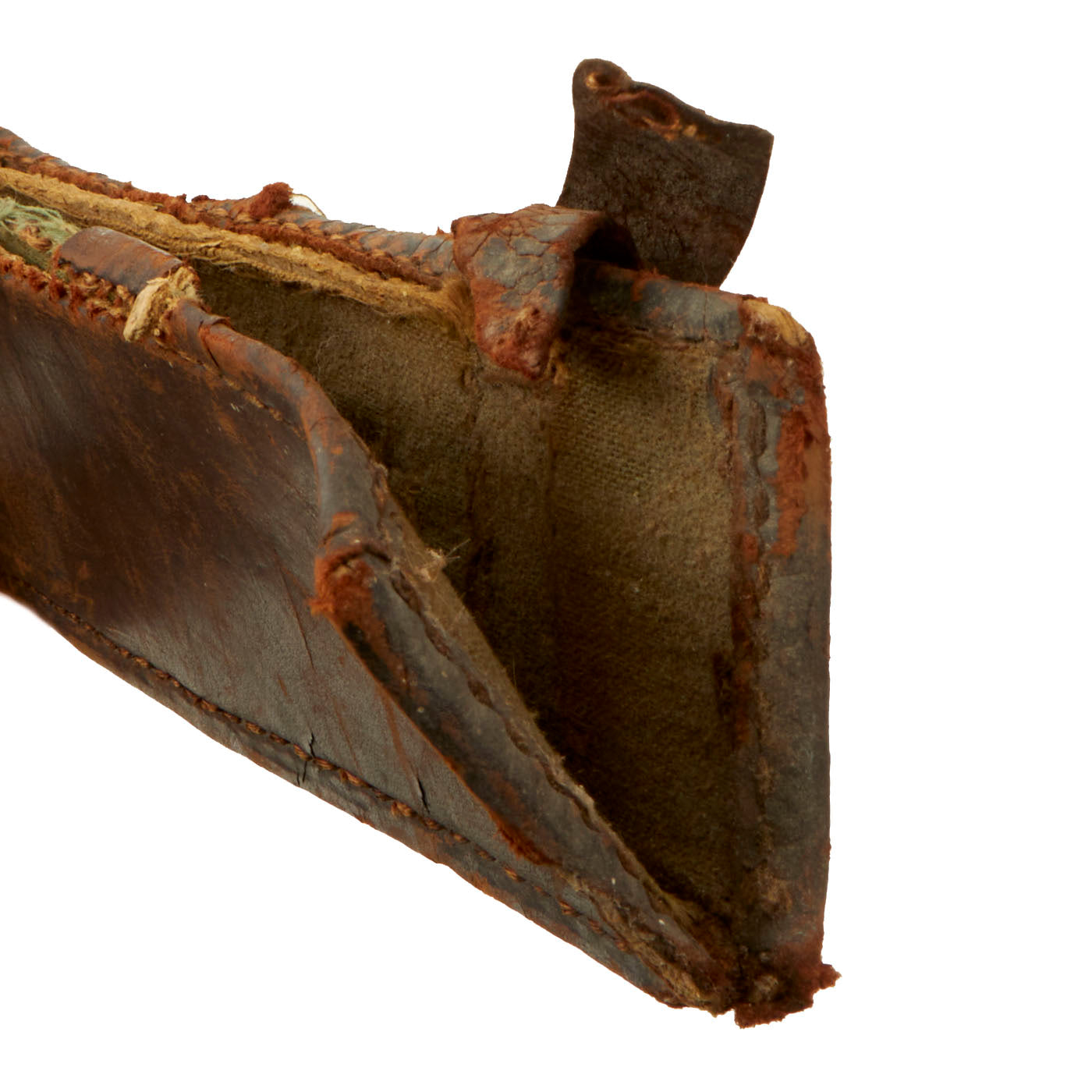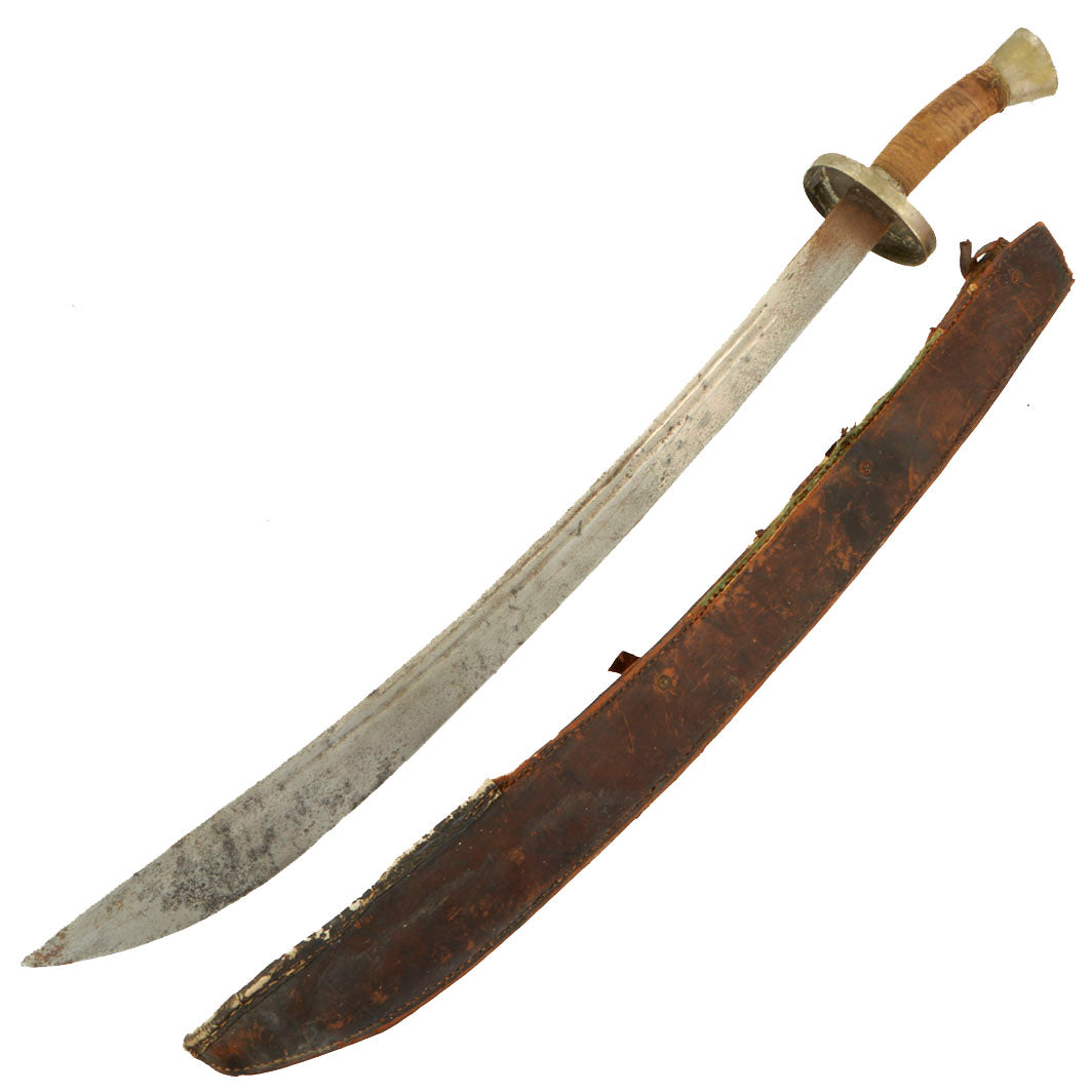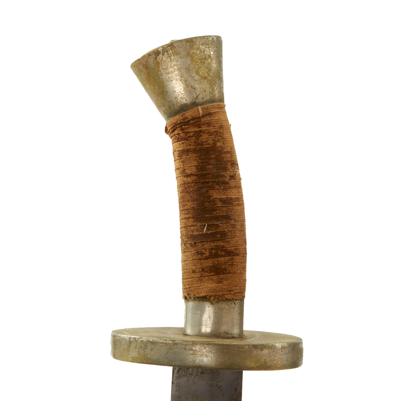 Although of similar design no two are exactly alike. This example measures 35 1/2" in overall length with a massive 29 1/2" blade bearing a double fuller down each side. The grip is metal with a fabric wrap. The sword, though clearly "country" made, is housed in leather scabbard that is fitted with a shoulder strap allowing the sword to be worn on the back of the soldier carrying it. Originally, the scabbard had two straps on the top of the scabbard that secured to snaps which allowed the sword to “break away” when the user retracted it from the scabbard.