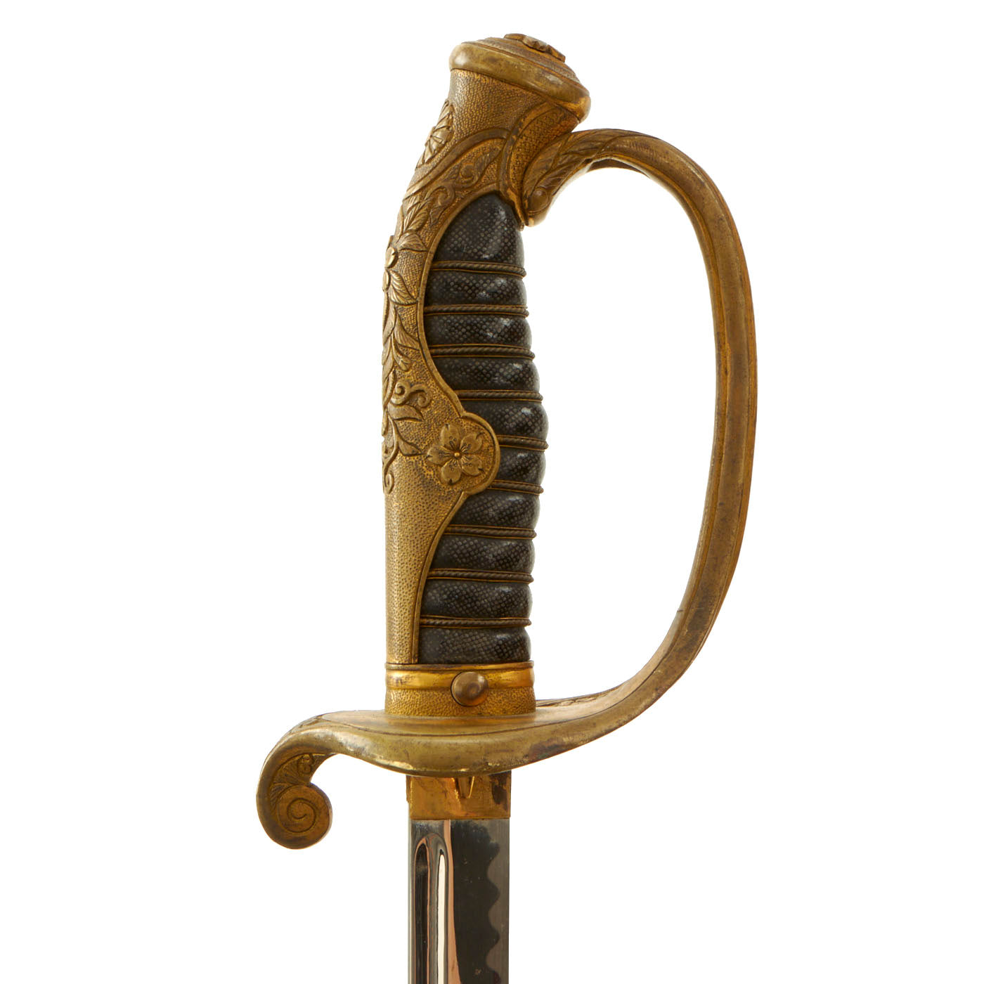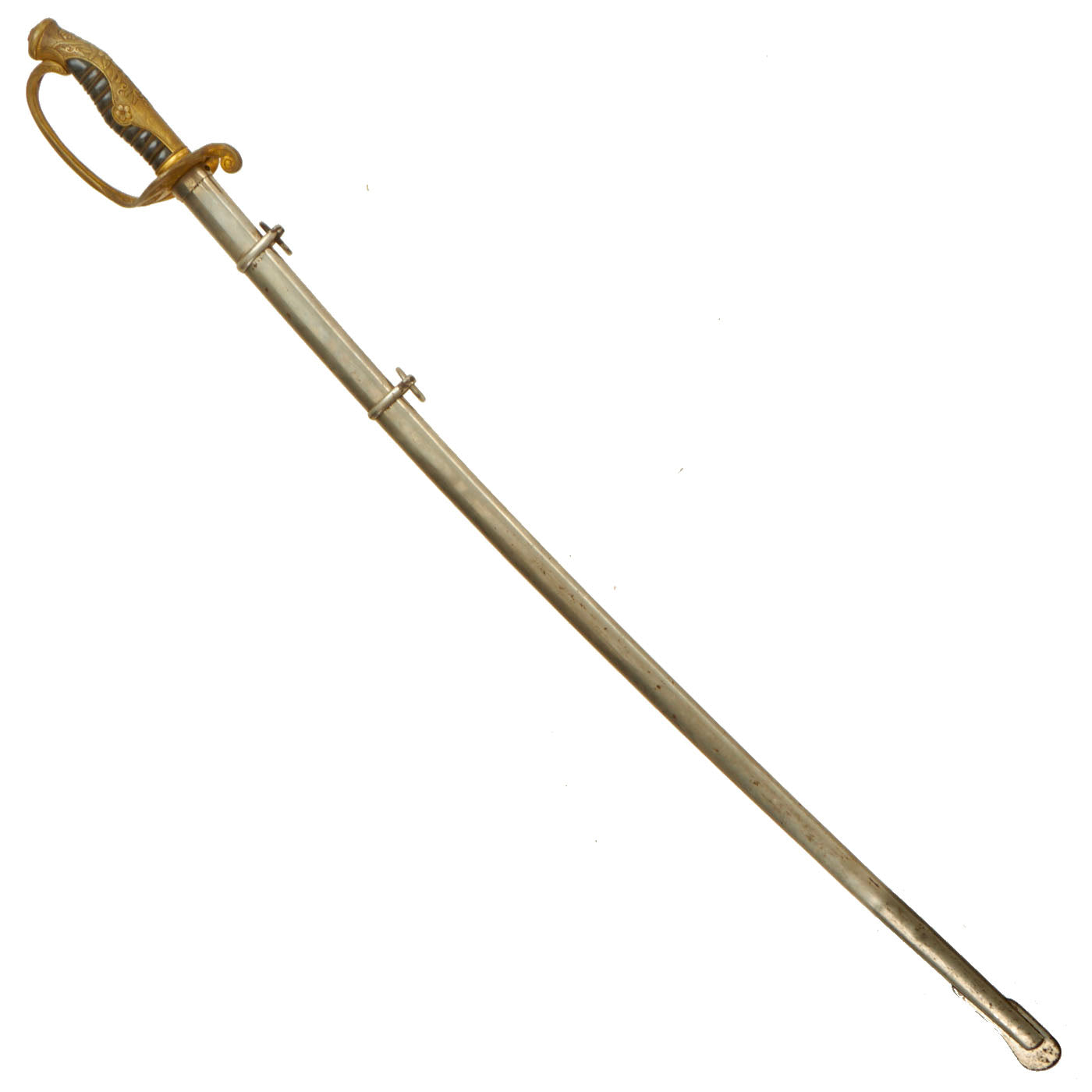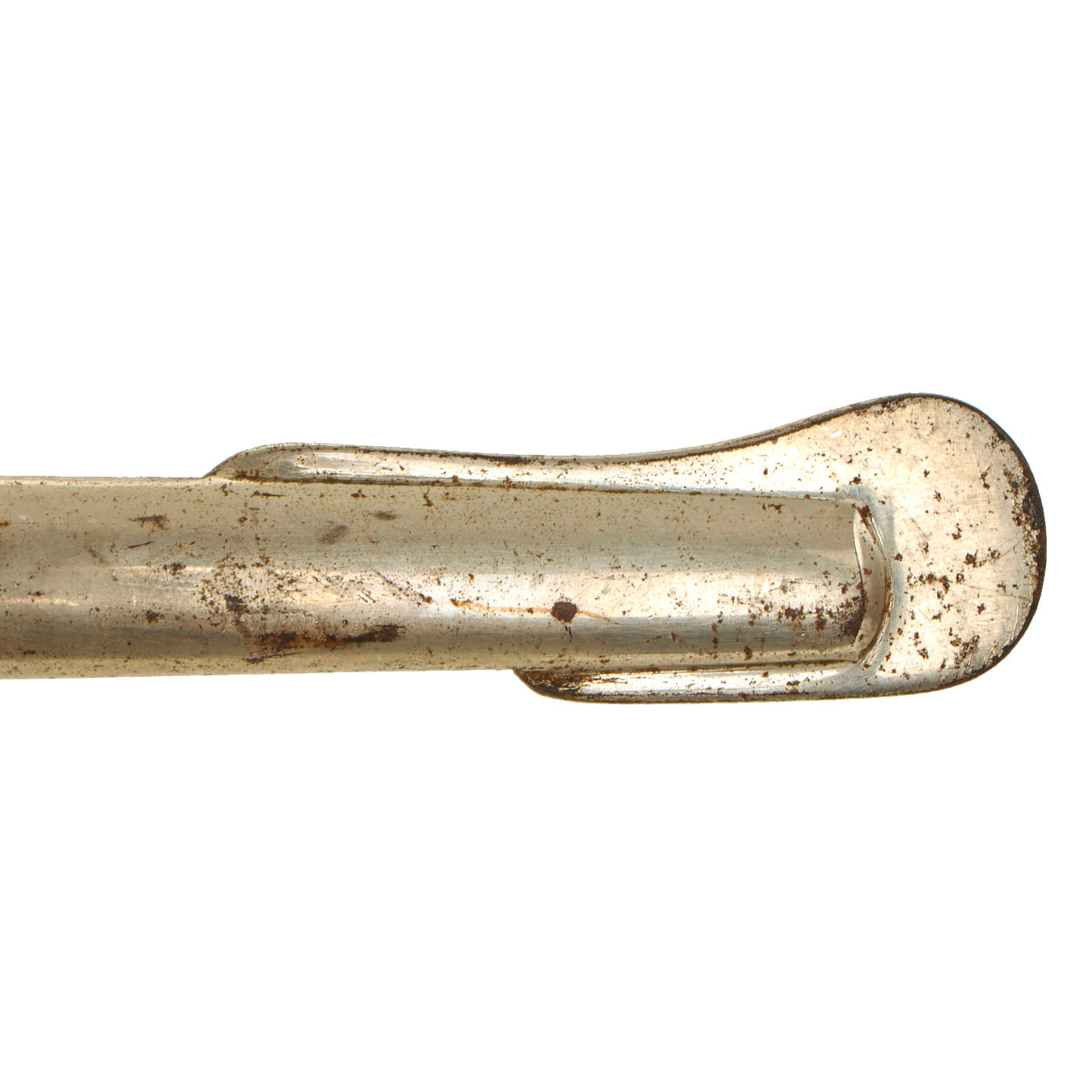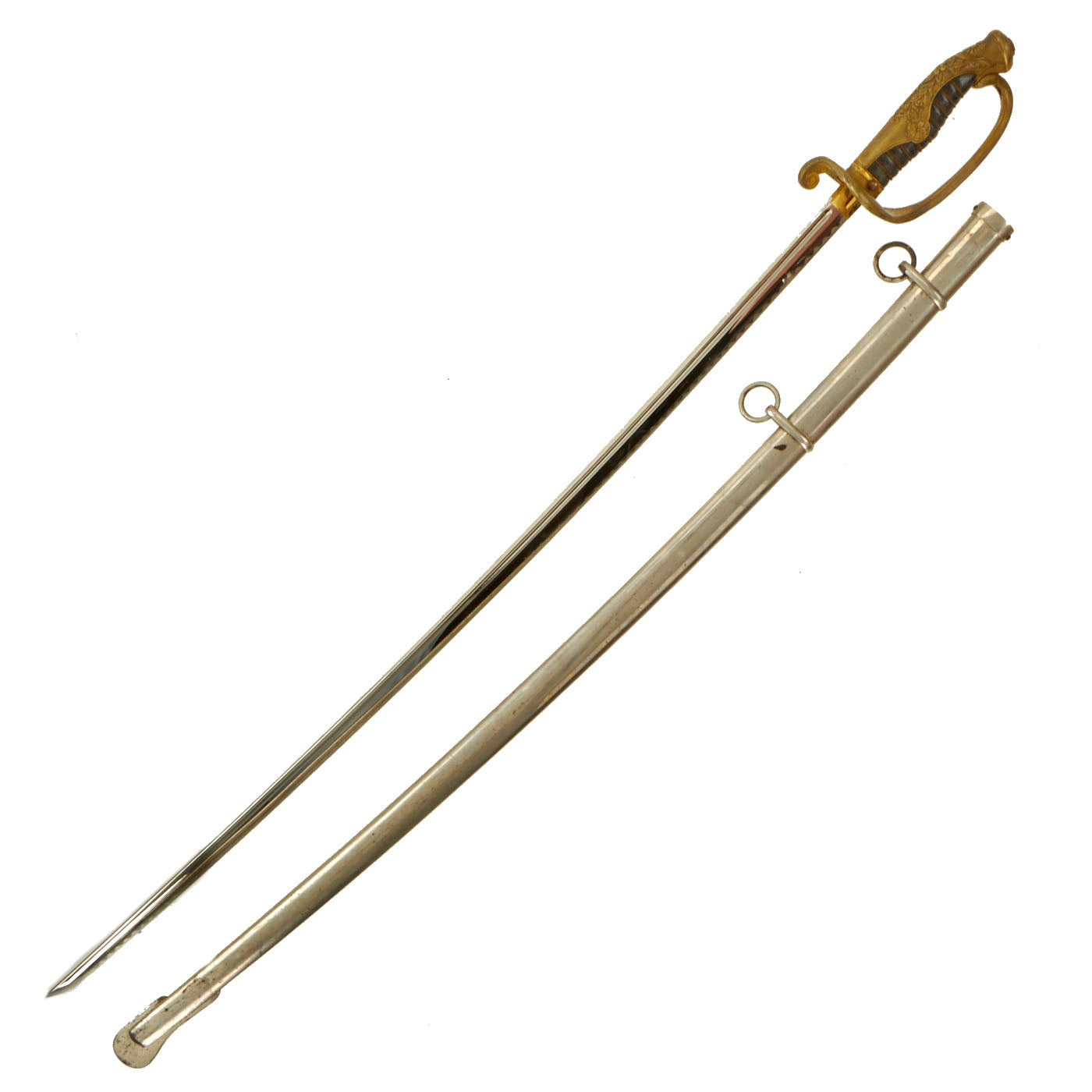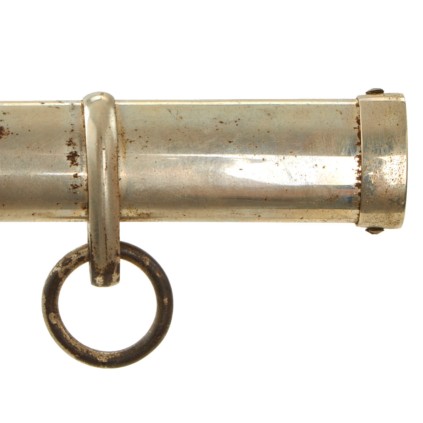 This is a very fine example in untouched condition. The brass guard has a rich mellow patina, the nickel on the scabbard is mostly 90% intact. Brass wire wrap on the handle is complete, and the polished sharkskin is in great condition. The blade is absolutely exceptional, with a wonderful polished chrome finish and faux temper line pattern. Overall length in the scabbard is approximately 35”, with a blade length of 27.5”.