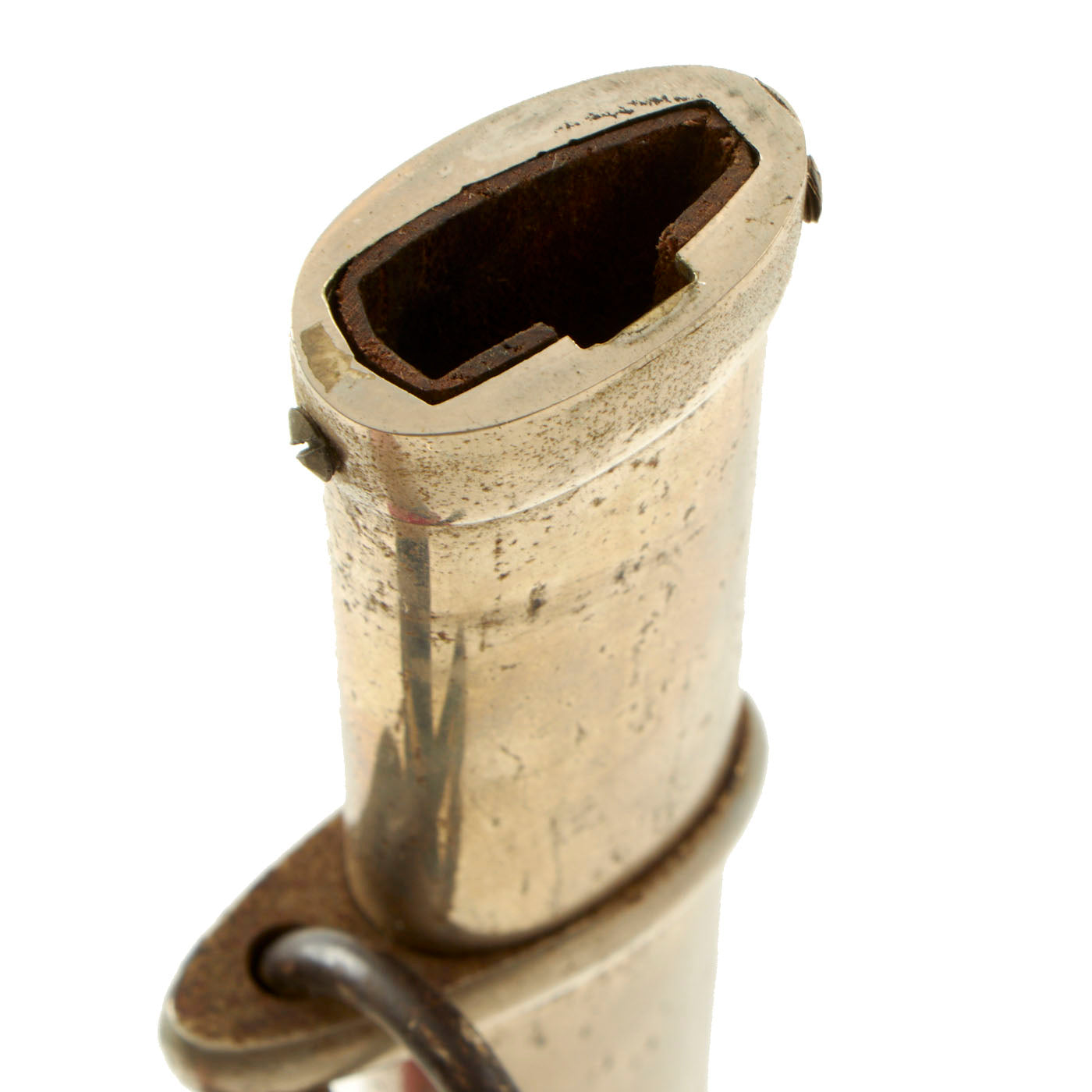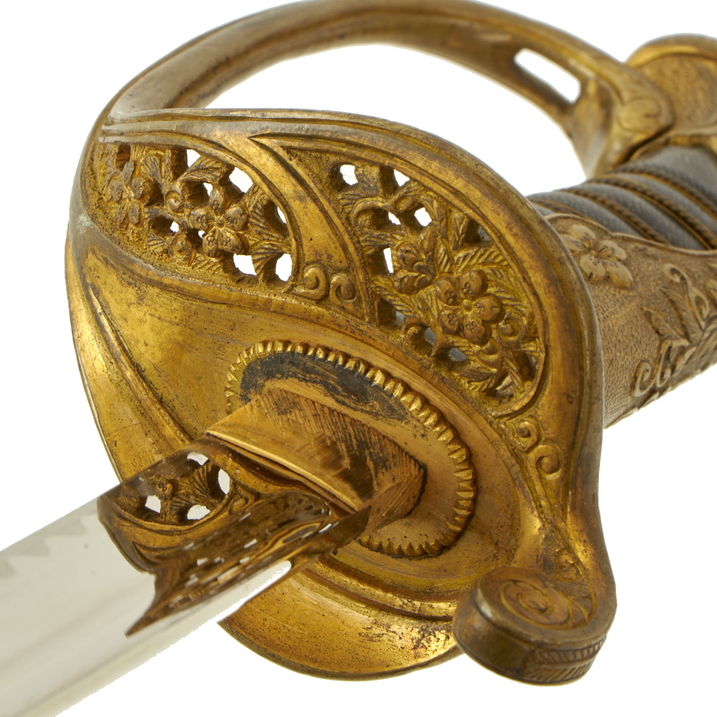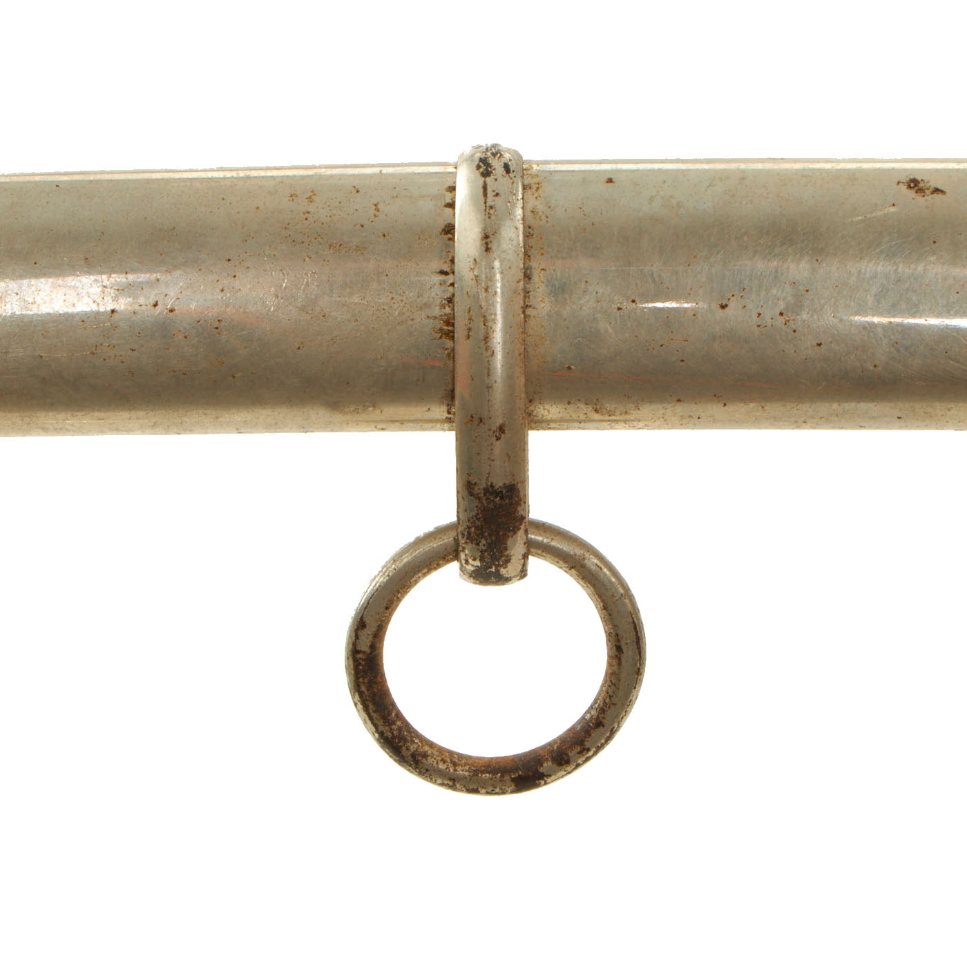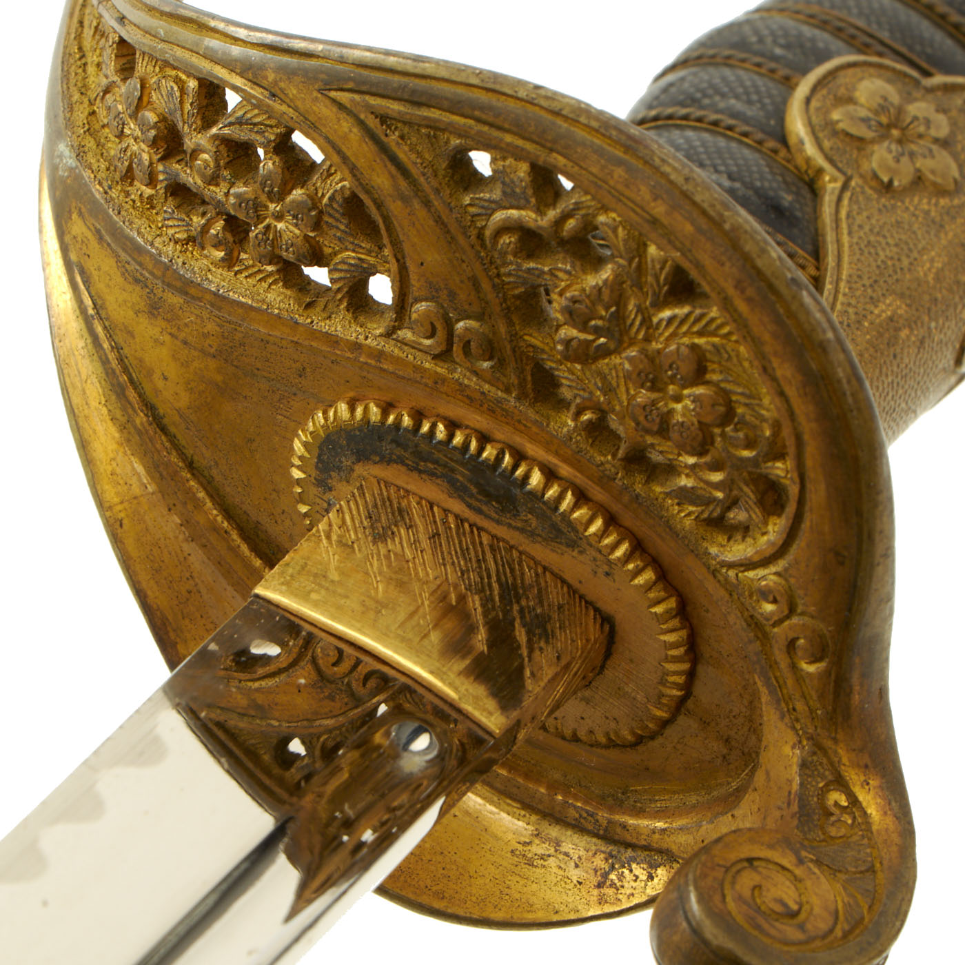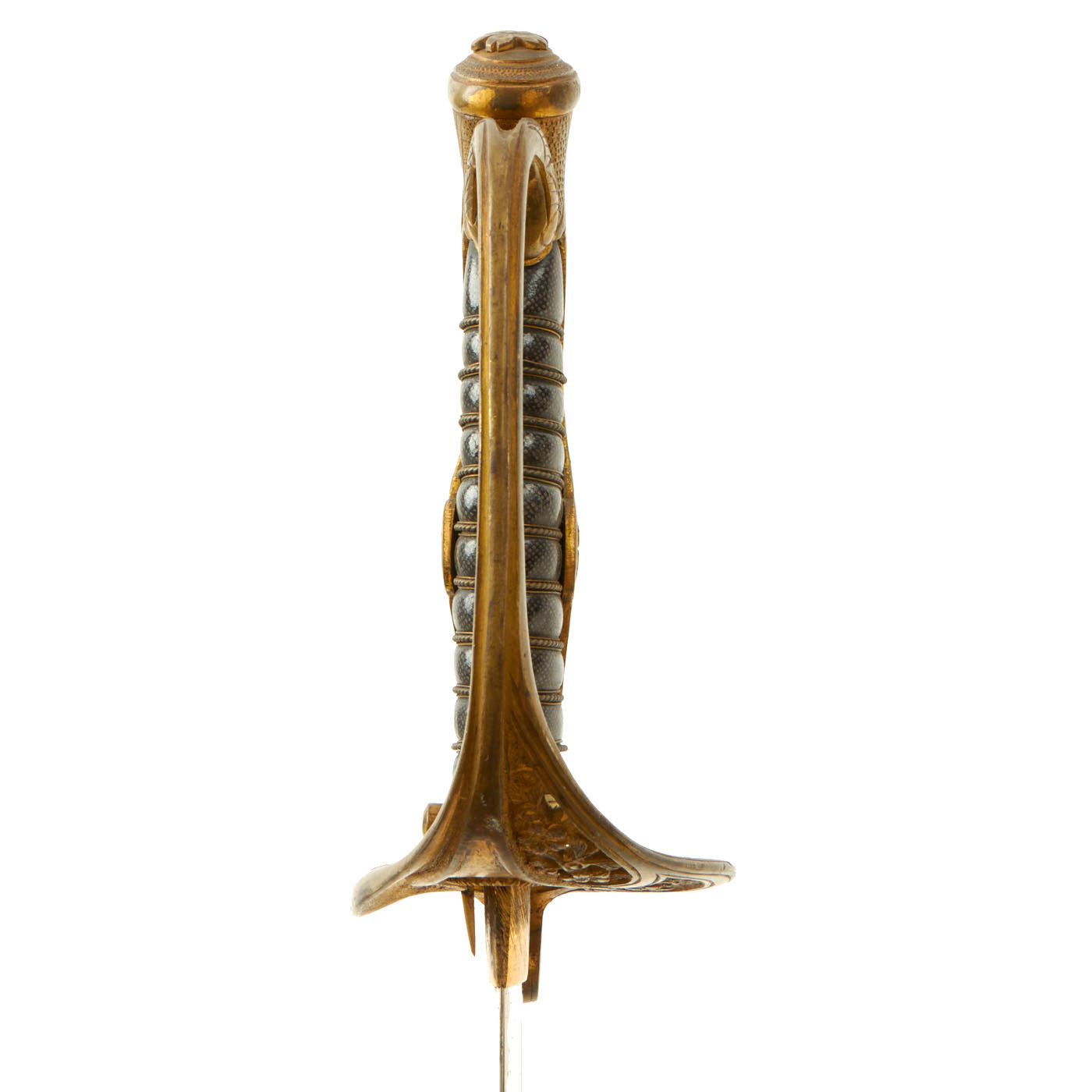 This is a very fine example in untouched condition. The brass guard has a rich mellow patina, the nickel on the scabbard is mostly 90% intact. Brass wire wrap on the handle is complete, and the polished sharkskin is in great condition. The blade is absolutely exceptional, with a wonderful polished chrome finish and faux temper line pattern. Overall length in the scabbard is approximately 35”, with a blade length of 27.5”.
