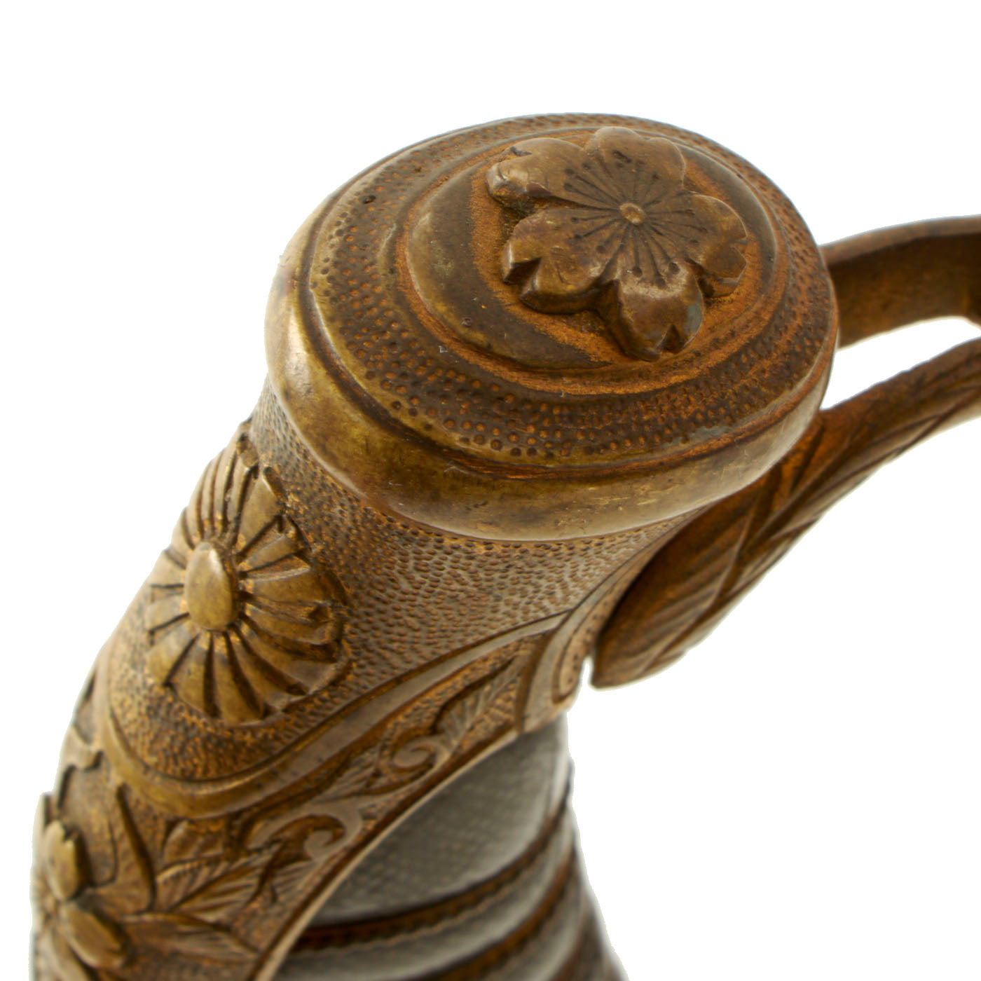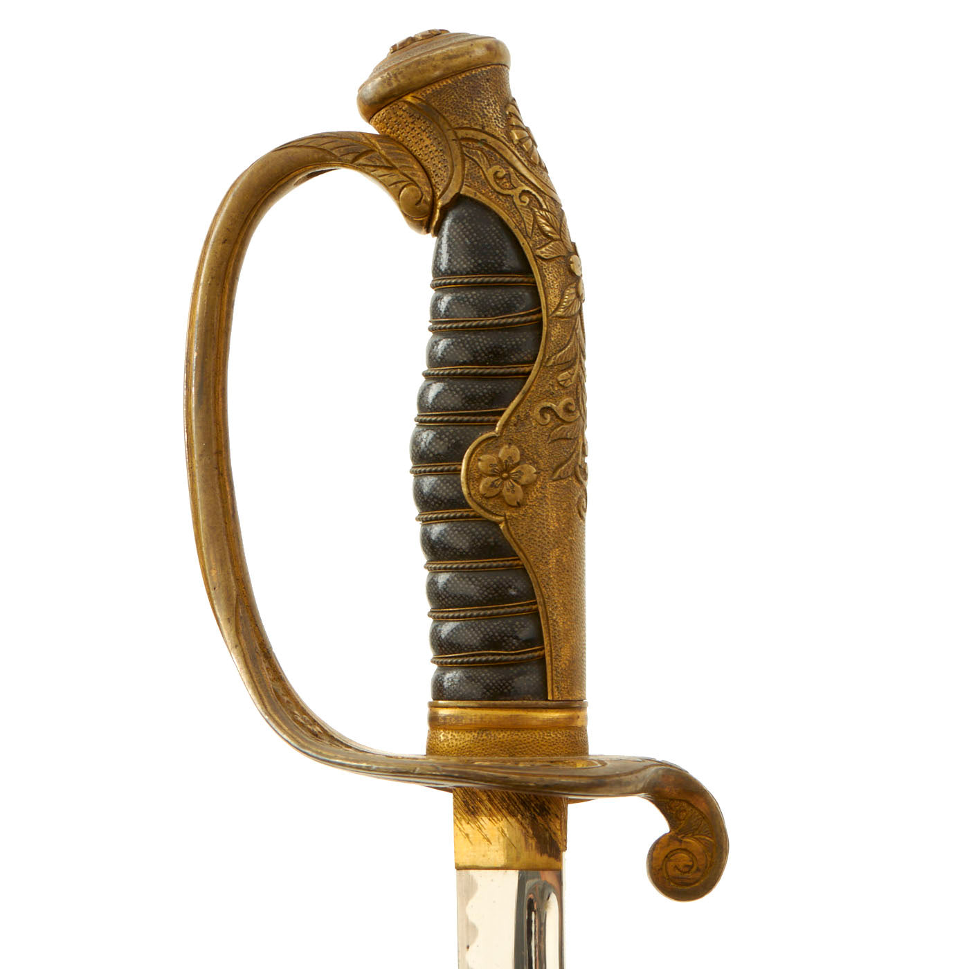 This is an exceptional example of a WWII Era Japanese Police Officer’s (aka Lieutenant’s) Sword with Polished Sharkskin Grip and Japanese National Police Emblem on the Handle. These are often confused with the Imperial Japanese Army Type 19 Dress Swords, which are much more common.