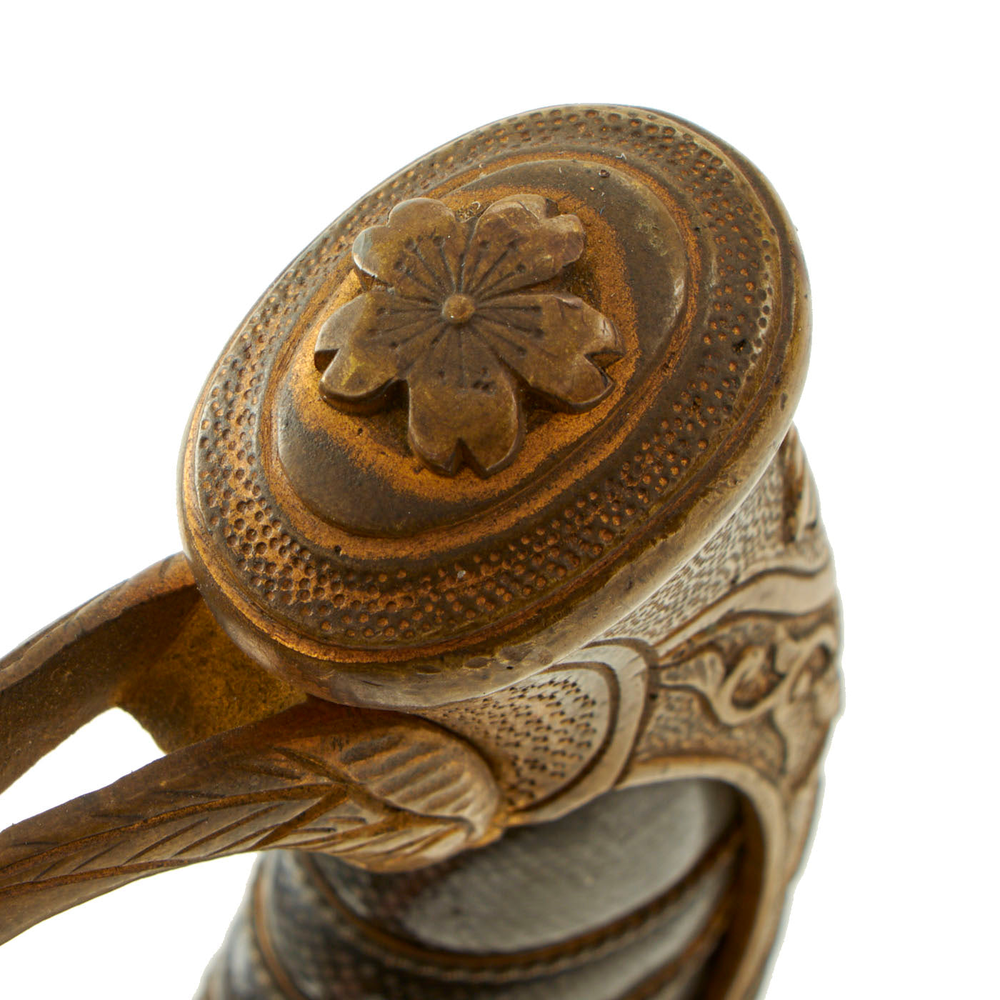 The quick way to determine the difference between Army and Police swords of this type is to note the backstrap decoration. Army swords will normally have a ten petal cherry blossom on the back of the pommel and on the "ears" of the backstrap. Nearly identical Police swords will have a Police badge on the back of the pommel and a five petal cherry blossom on the "ears" of the backstrap. The same applies to ten- and five-petal cherry blossoms found in the guard design.