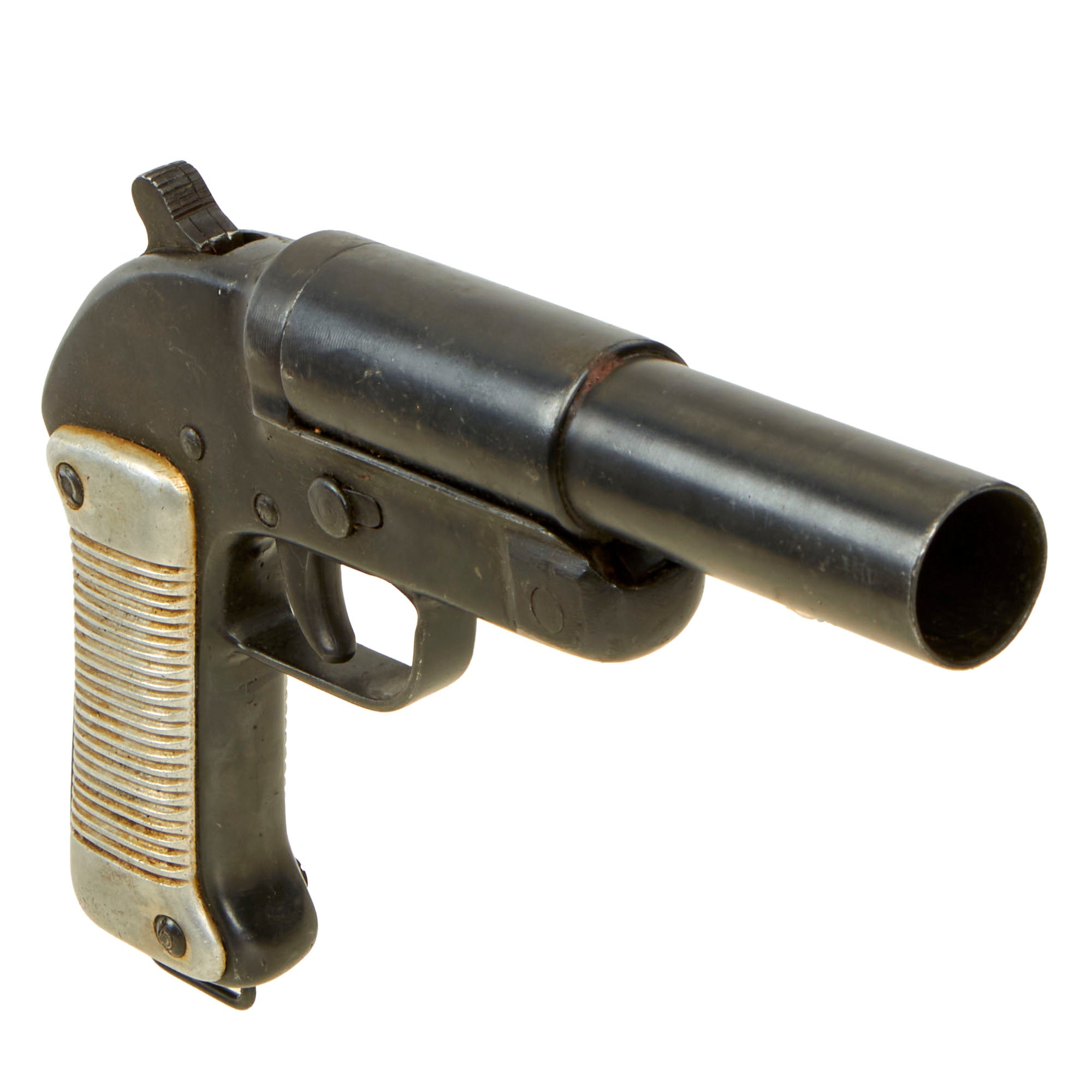 We assume however that this pistol was made after the liberation from NSDAP Germany, with whom they had been allied and then occupied by the Soviet Union. So we conclude this is a Soviet authorized Signal Pistol. It is constructed of blued steel, with aluminum grip panels. Design is quite similar to the German LP42, which it was no doubt modeled after.