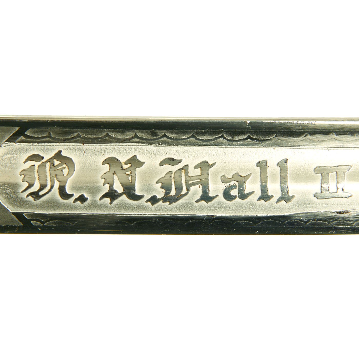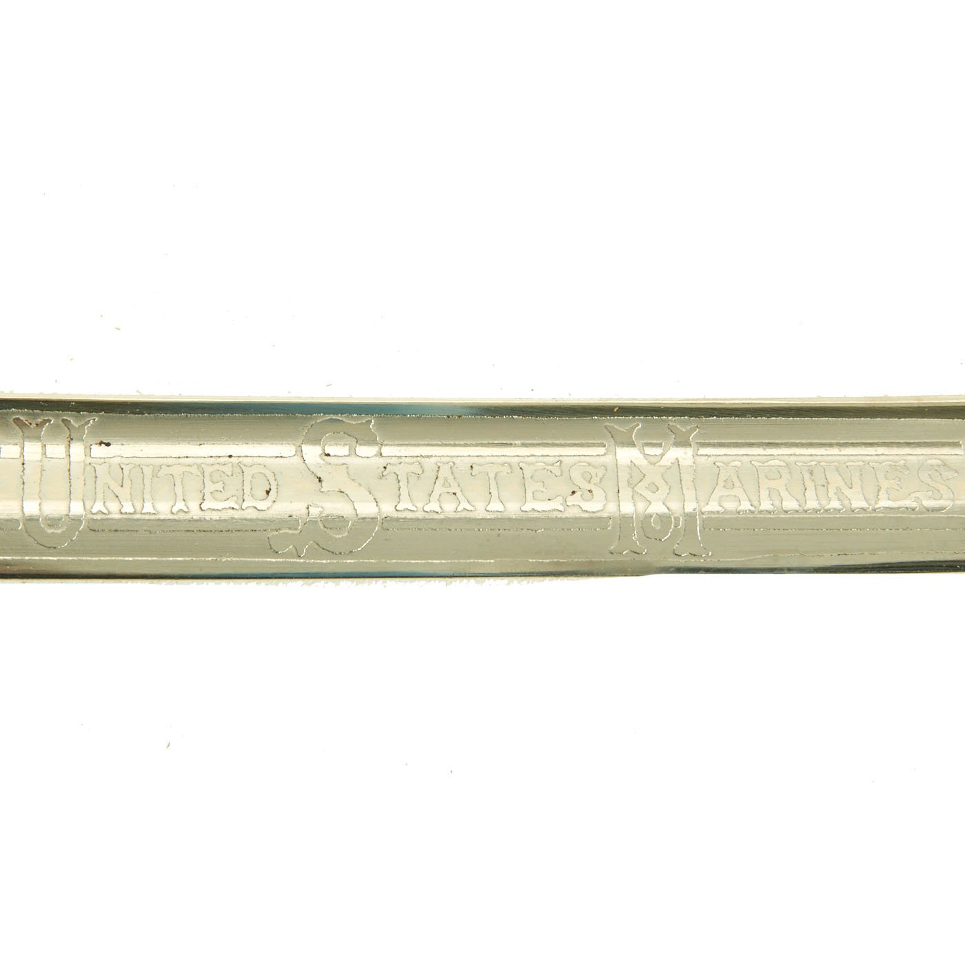 Blade is nickel-plated and has been etched on both sides with UNITED STATES MARINES and various other military motifs. The blade is also etched with the name R. N. Hall II in Black Letter typeface on one side. There is no maker marked on the blade, however examples such as this were bespoke, so that is not uncommon. Scabbard is is in great shape, with both of the original hanger rings, as well as the brass throat.