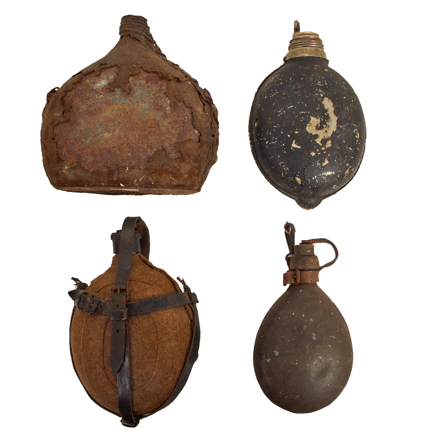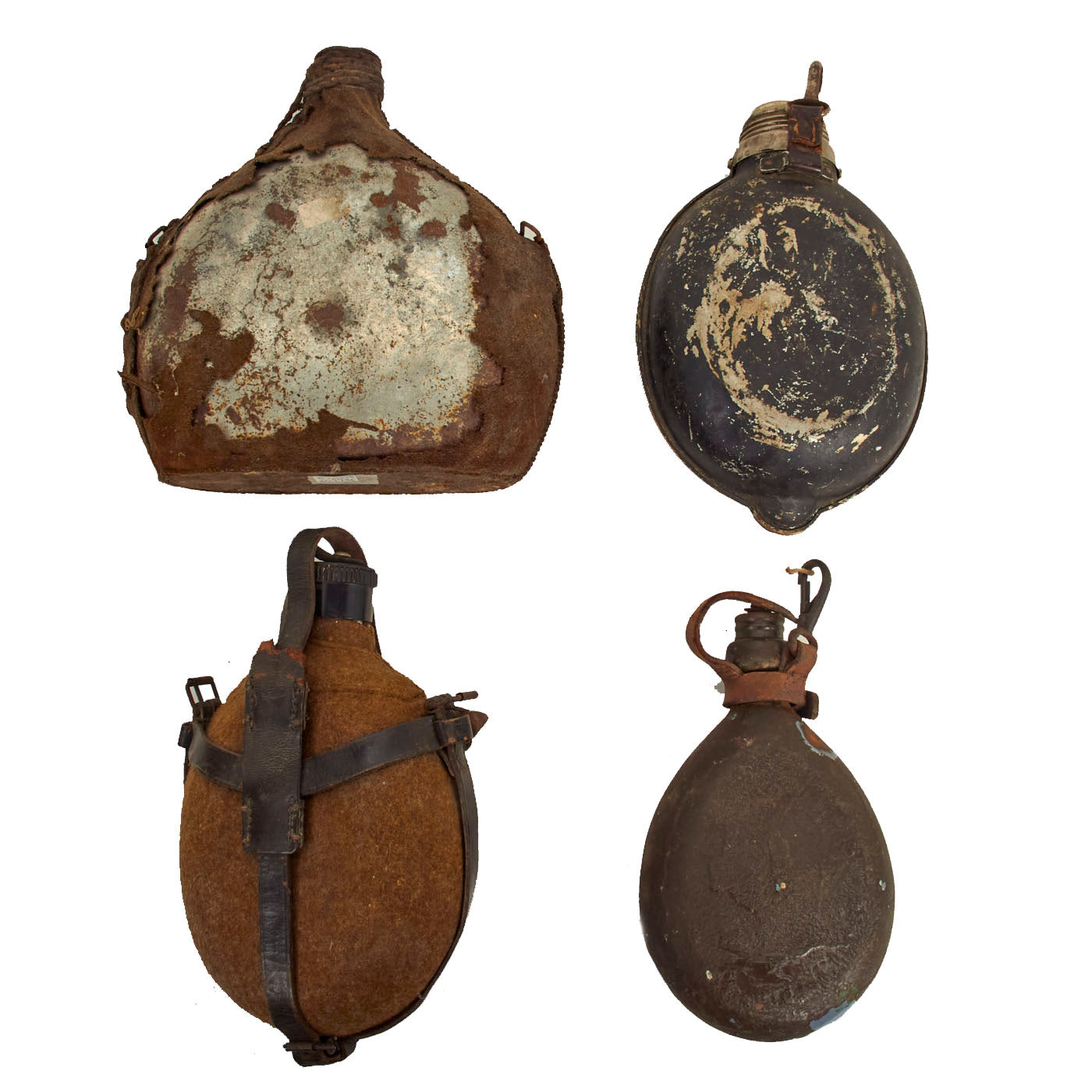 - WWI German East Africa Campaign M1915 Feldflasche: The M1915 Feldflasche is actually a variation of the M1893 Feldflasche, although due to the shortage of aluminum, the M1915 was first constructed of tinned steel, but the tin wore away quickly and rust in the water was a problem, so construction moved to enameled steel. The basic canteen shape remained the same as the M1893, but the cork design changed to stamped steel caps instead of the aluminum pull. These canteens would have covers made from Steingrau or Feldgrau wool, brown corduroy or even ersatz papercloth, with full or simplified leather harnesses.