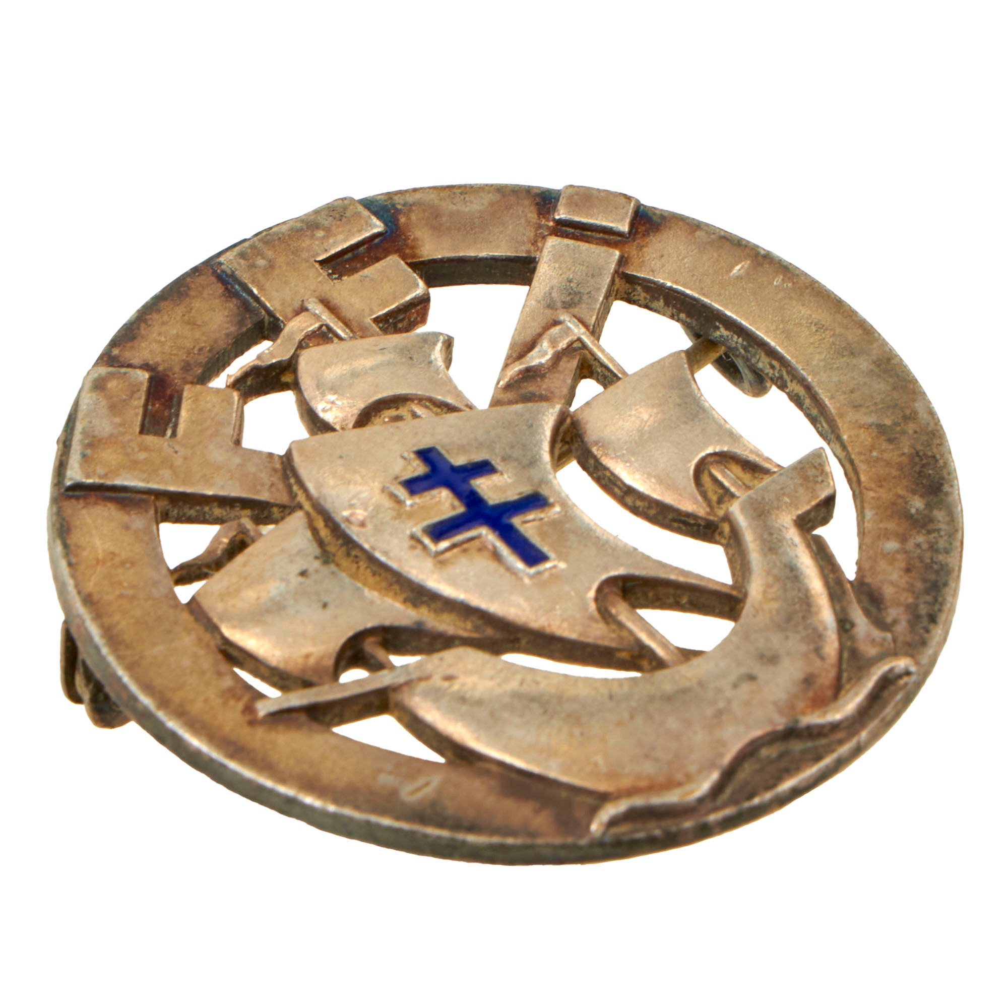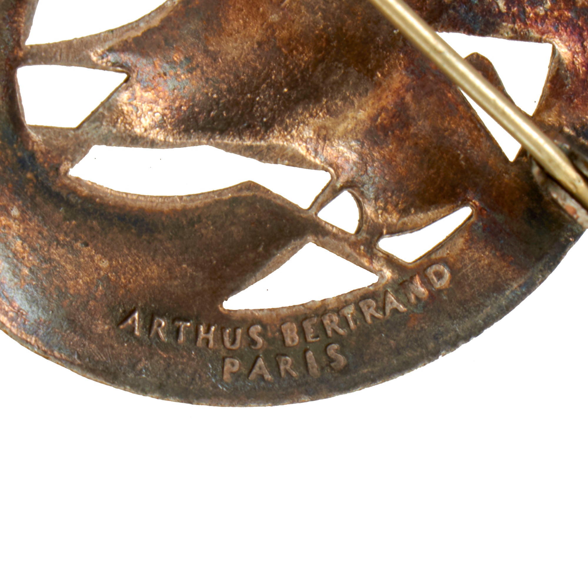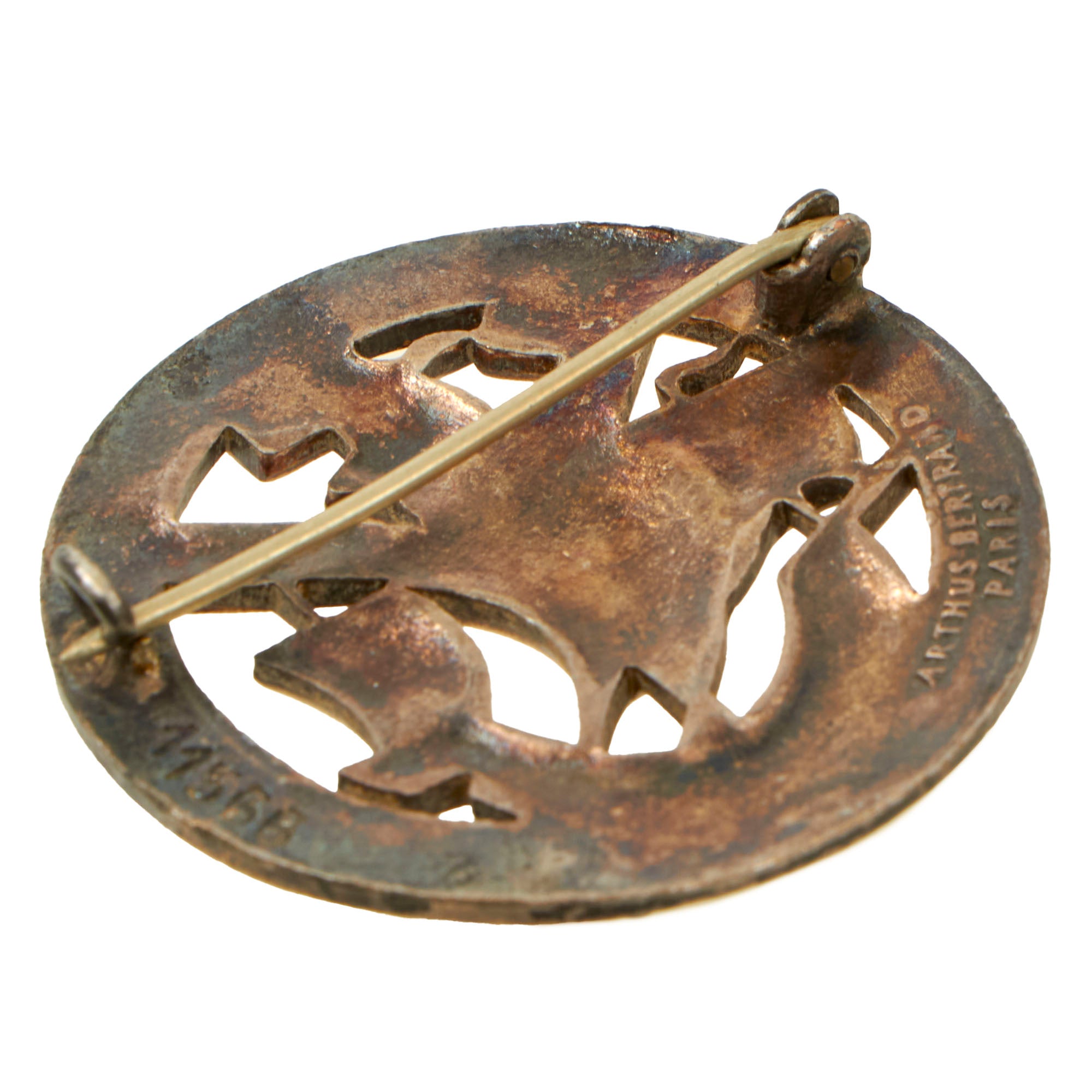 This is a fantastic FFI marked Free French 10th Infantry Division Badge, maker marked on the back by ARTHUS BERTRAND / PARIS, which was made after after the liberation of Paris in August 1944. It is marked with serial number 11566 on the reverse along with a functional pinback, and is in great condition. It measures 1 ½" in diameter, and shows a sailing ship on the front, with a blue enamel Croix de Lorraine (Cross of Lorraine) on the central sail.