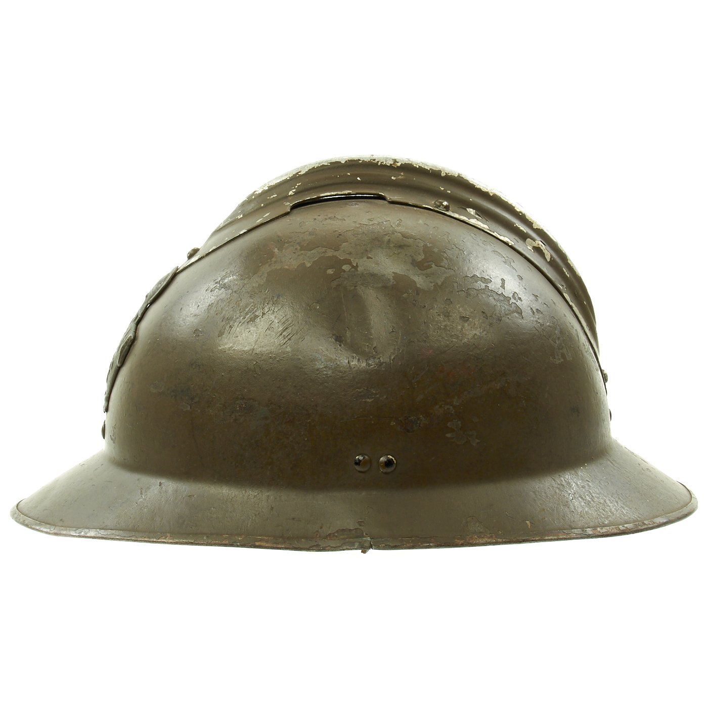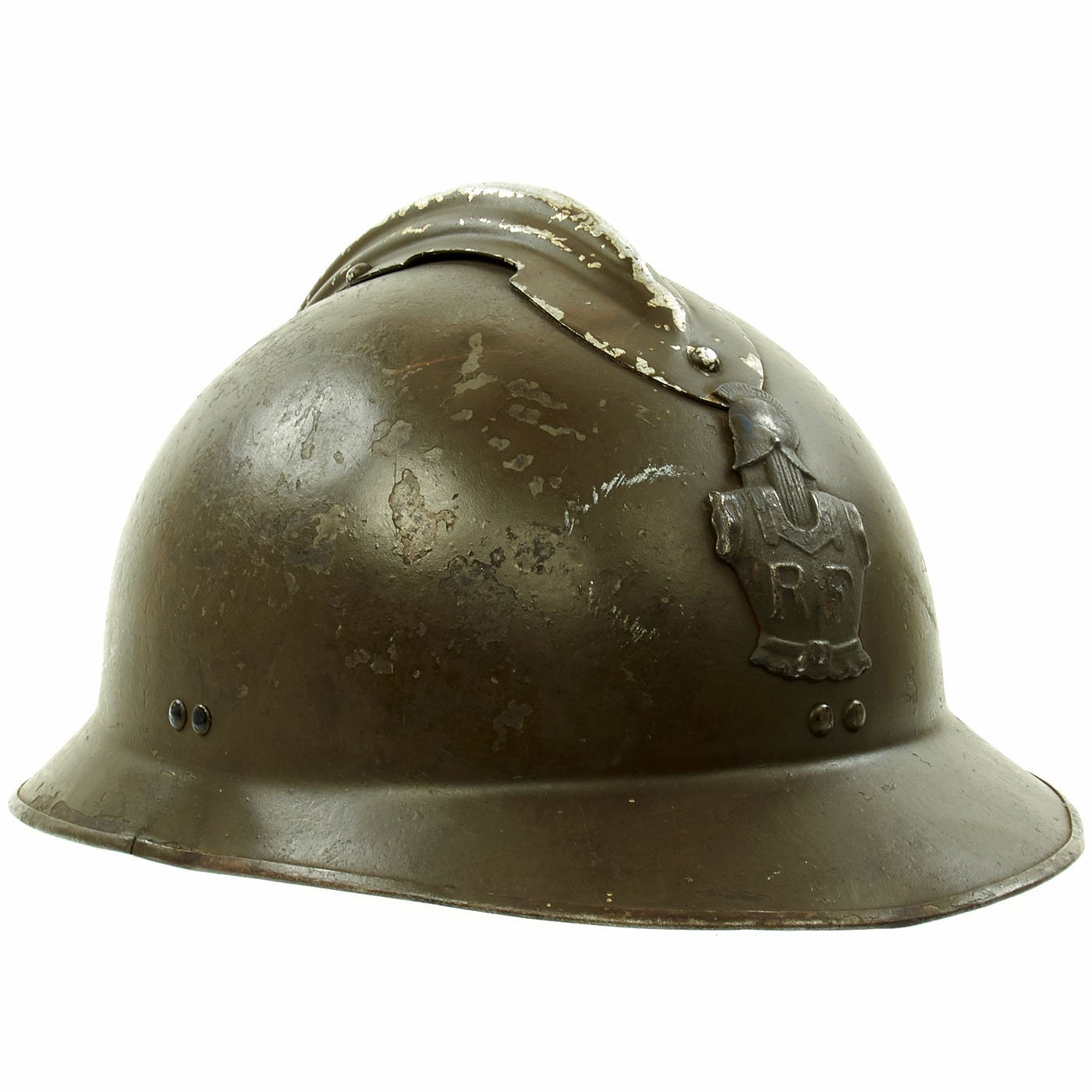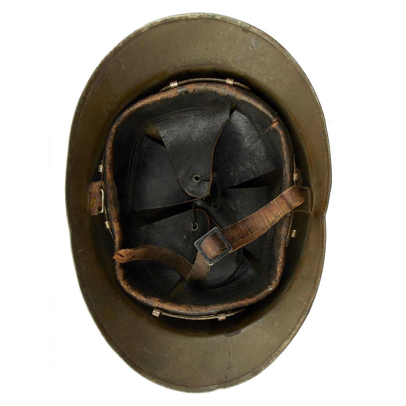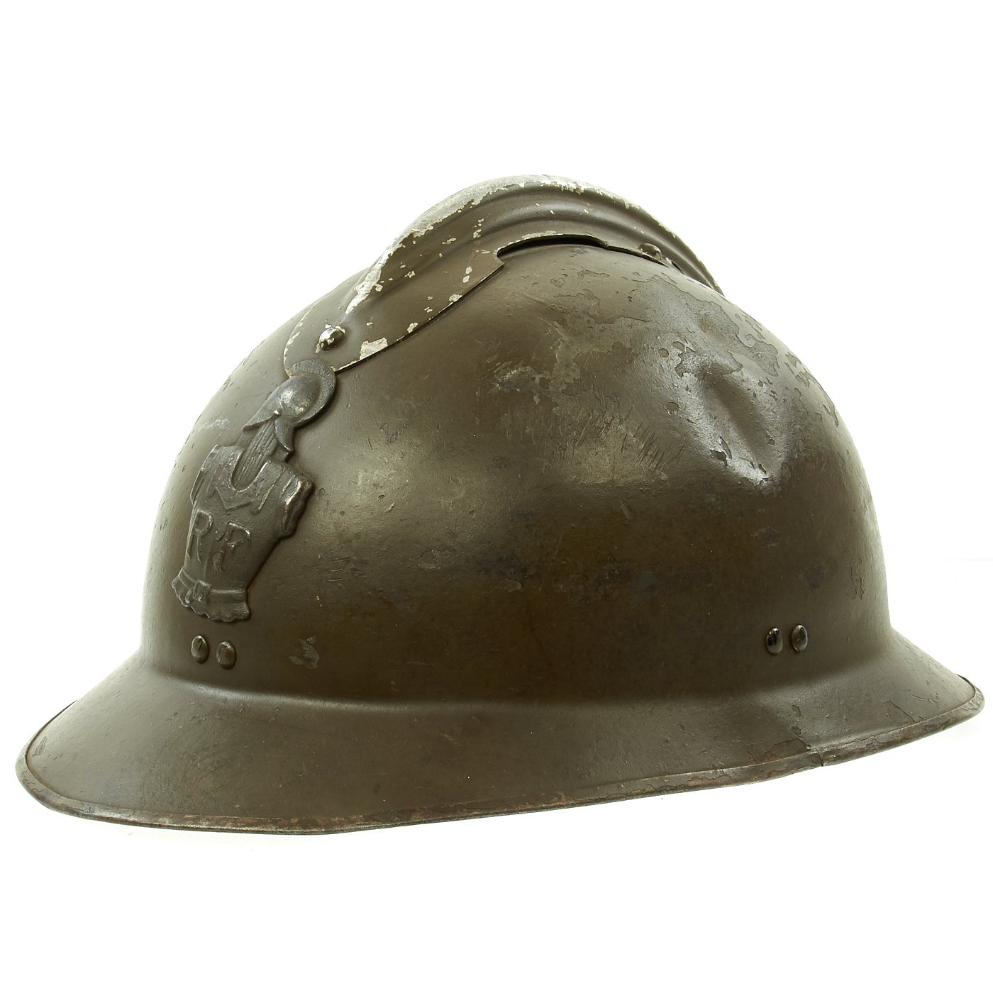 Original Item: Only One Available. Excellent genuine World War II M1926 French Army Combate Engineer "Adrian" helmet. The helmet retains the original olive green paint and has the original RF (République Française) marked Engineer's badge attached to the front. The Engineer or Pioneer units were responsible for clearing battlefield obstacles and making other preparations in the field. Size is approximately US 7-71/4 (56-58cm). Features a wonderful complete original leather liner in excellent condition, still correctly attached to the mounting springs in the shell. The chin strap unfortunately has deteriorated somewhat, becoming brittle, and broke at the rivet that attaches it to the bale on that side.