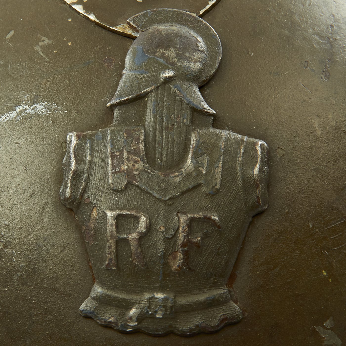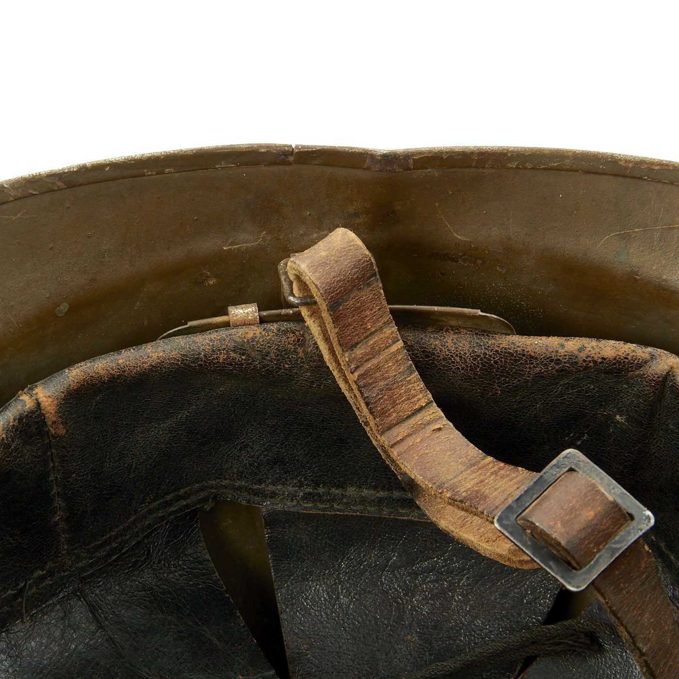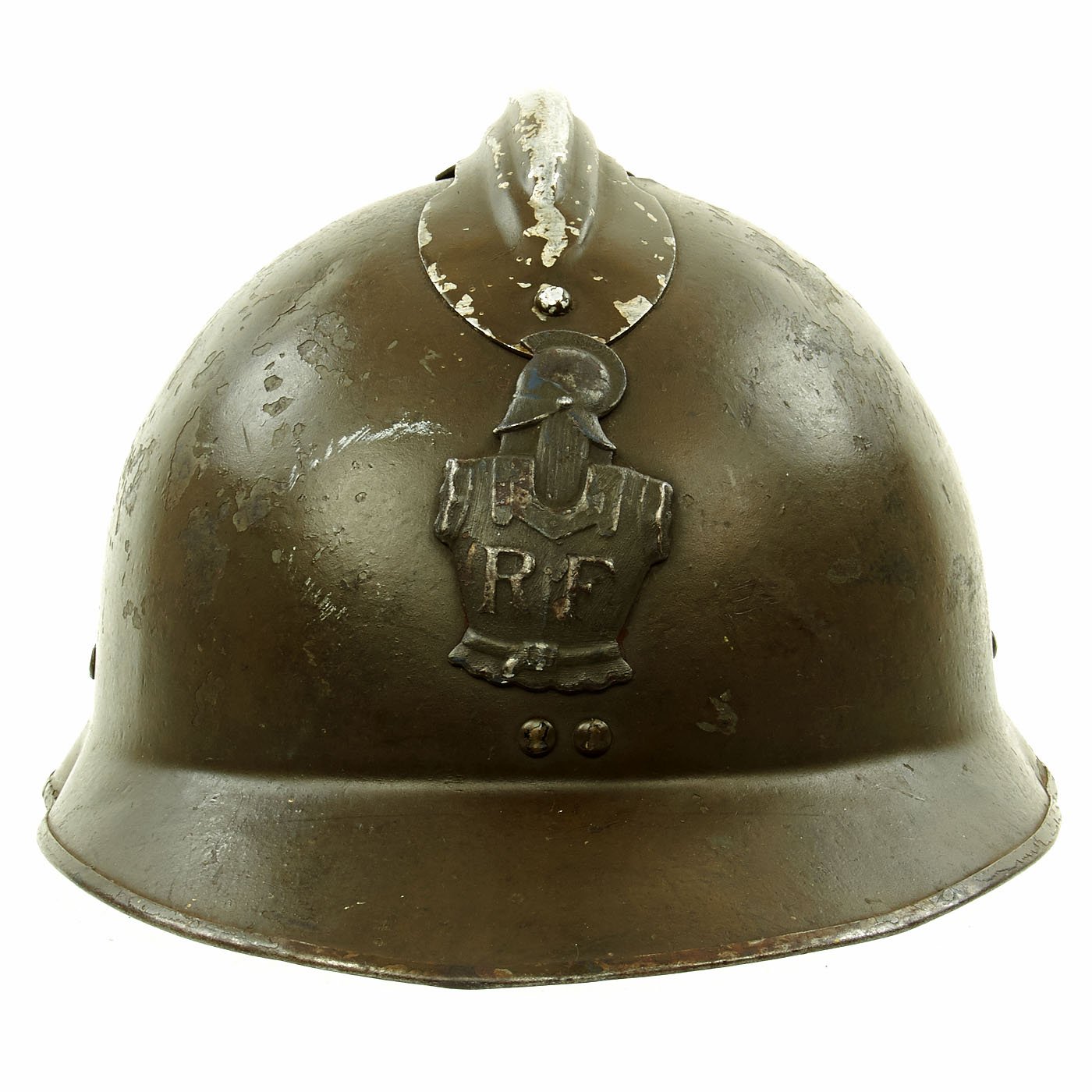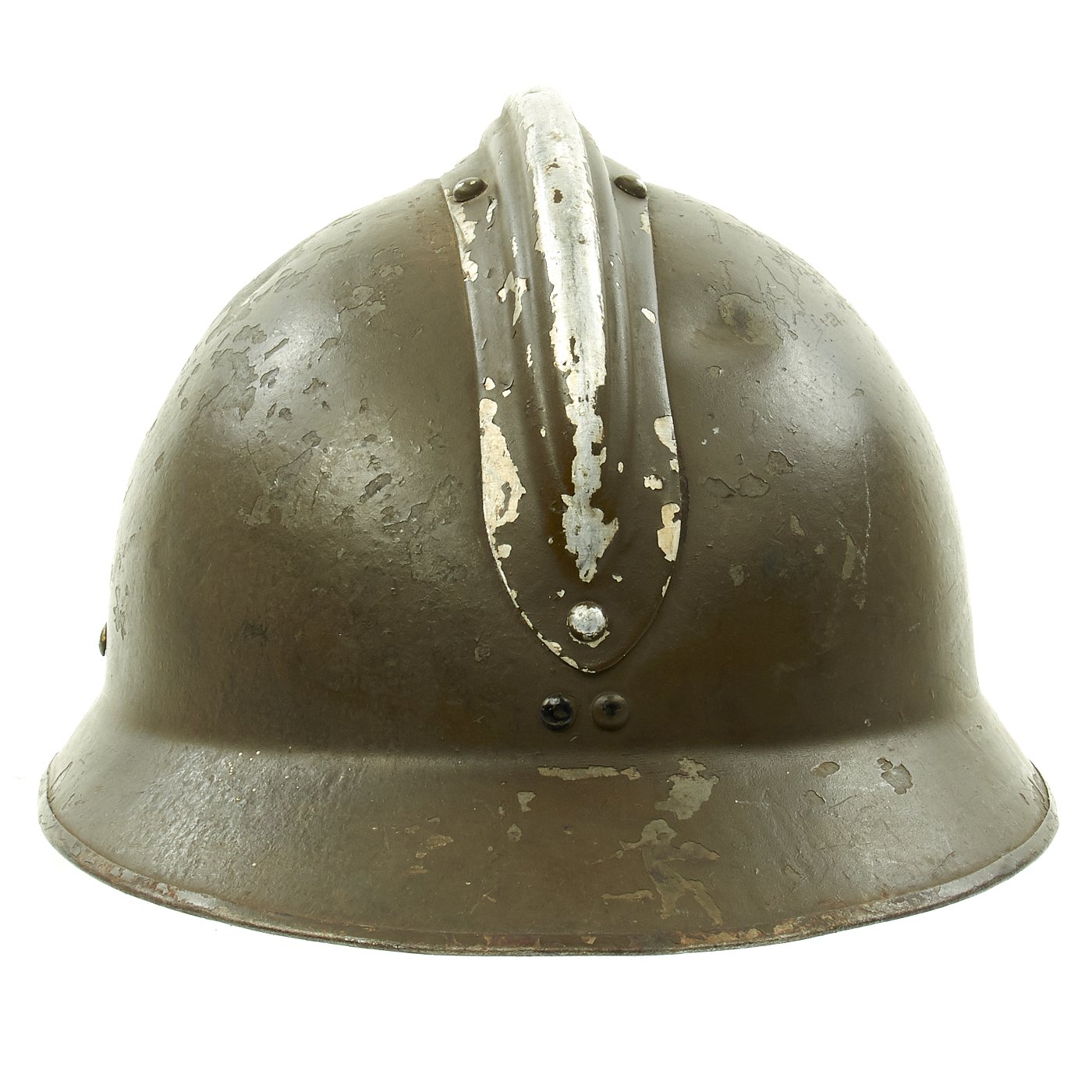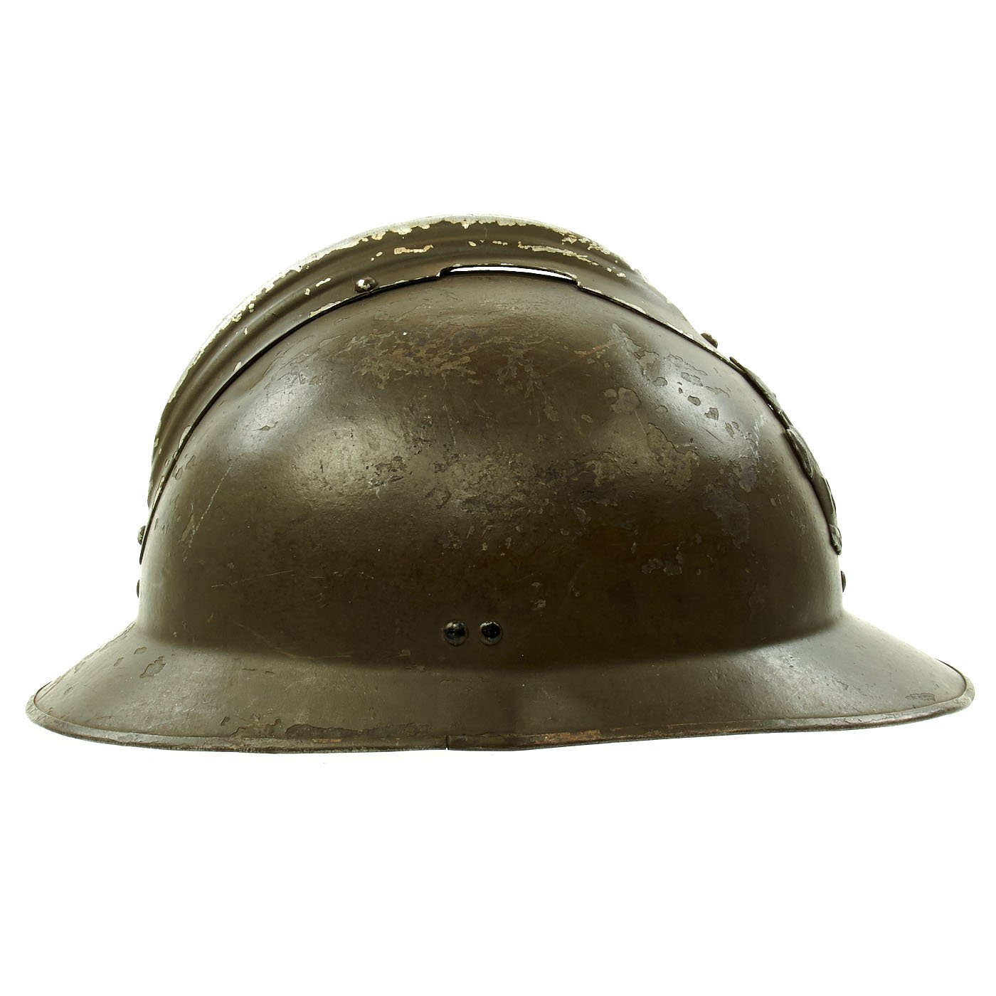 Original Item: Only One Available. Excellent genuine World War II M1926 French Army Combate Engineer "Adrian" helmet. The helmet retains the original olive green paint and has the original RF (République Française) marked Engineer's badge attached to the front. The Engineer or Pioneer units were responsible for clearing battlefield obstacles and making other preparations in the field. Size is approximately US 7-71/4 (56-58cm). Features a wonderful complete original leather liner in excellent condition, still correctly attached to the mounting springs in the shell. The chin strap unfortunately has deteriorated somewhat, becoming brittle, and broke at the rivet that attaches it to the bale on that side.