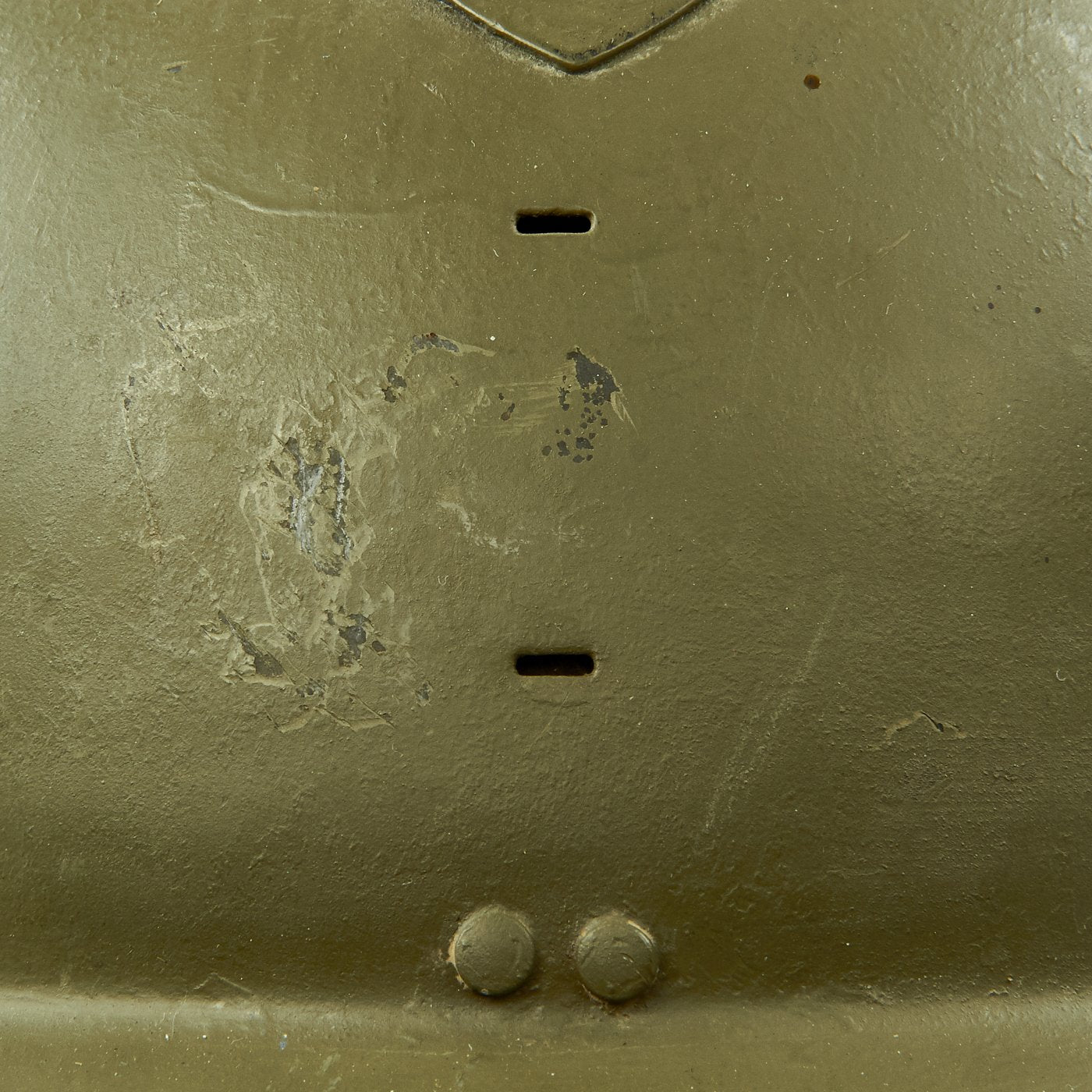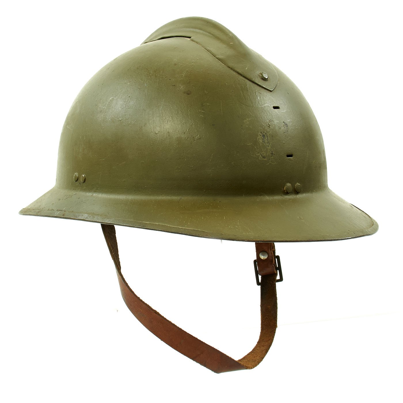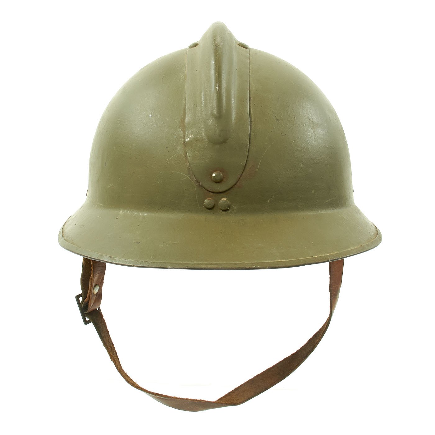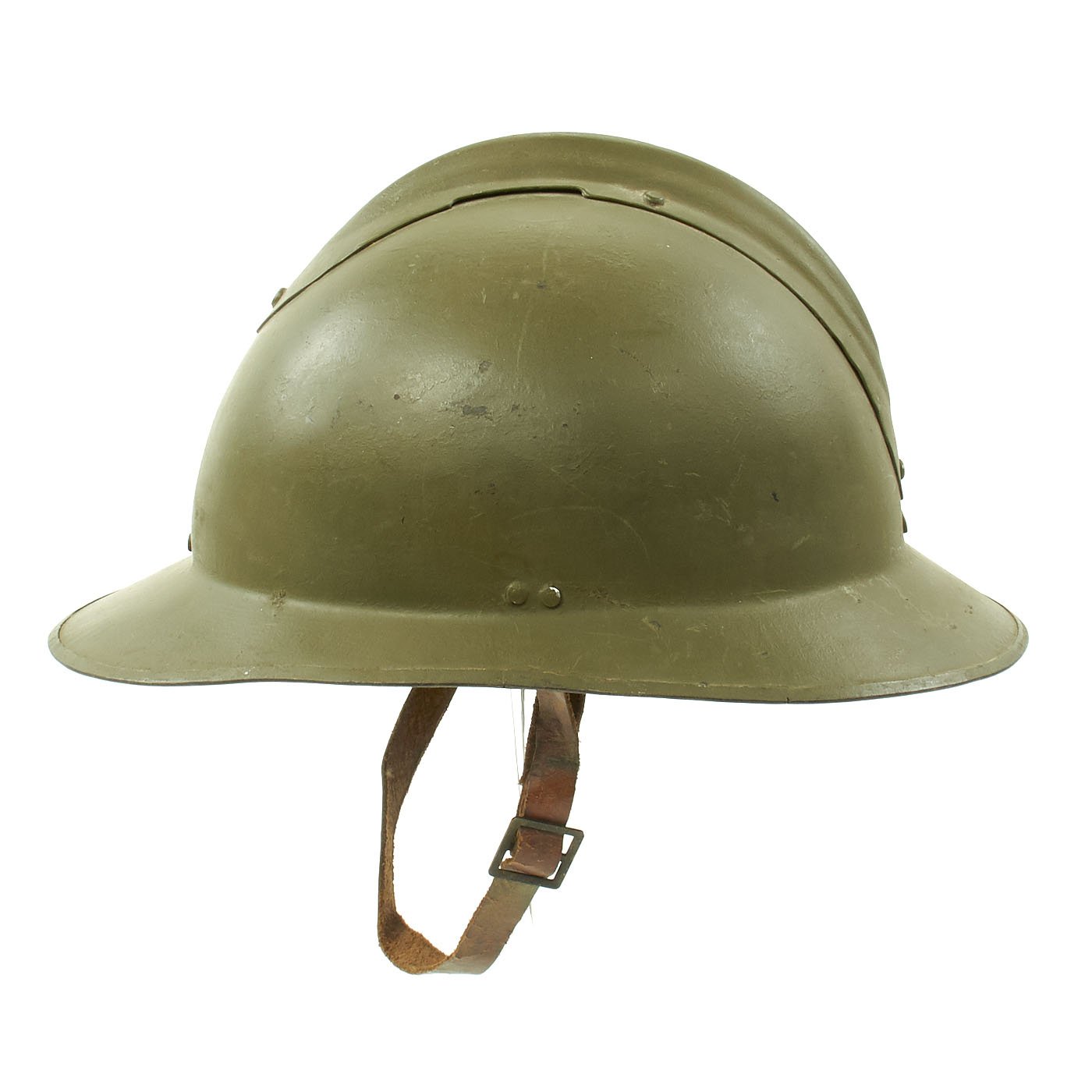 Original Item: Only One Available. This is a very nice genuine World War II M1926 French Army Artilleryman's "Adrian" helmet. The helmet retains the original olive green paint, and has the correct double slot front attachment points for a Badge. This helmet would be the perfect place to put an original French Helmet badge that needs a home!