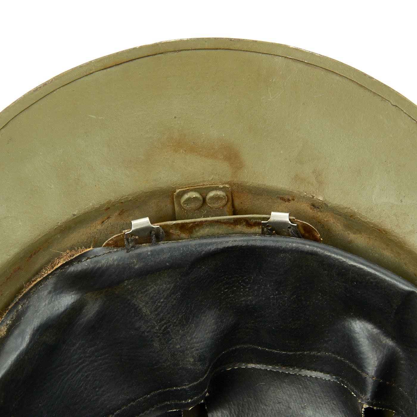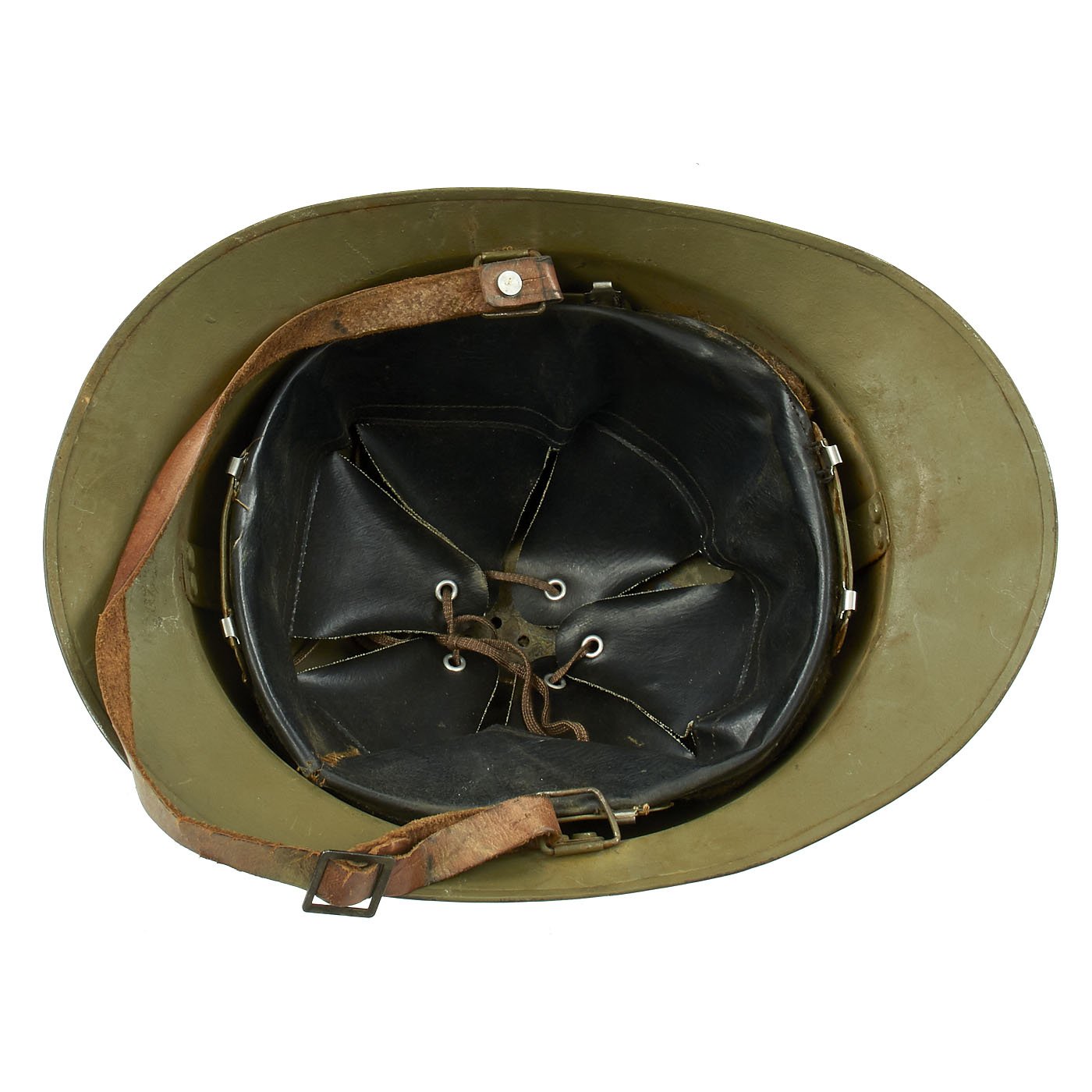 Size is approximately US 7-71/4 (56-58cm). Features the original liner suspension springs inside, with what is possibly a post war oil cloth / vinyl liner with felt padding. The liner is overall very good, with some steam splitting. The chin strap is present and in good condition, showing some wear, but overall it is solid.