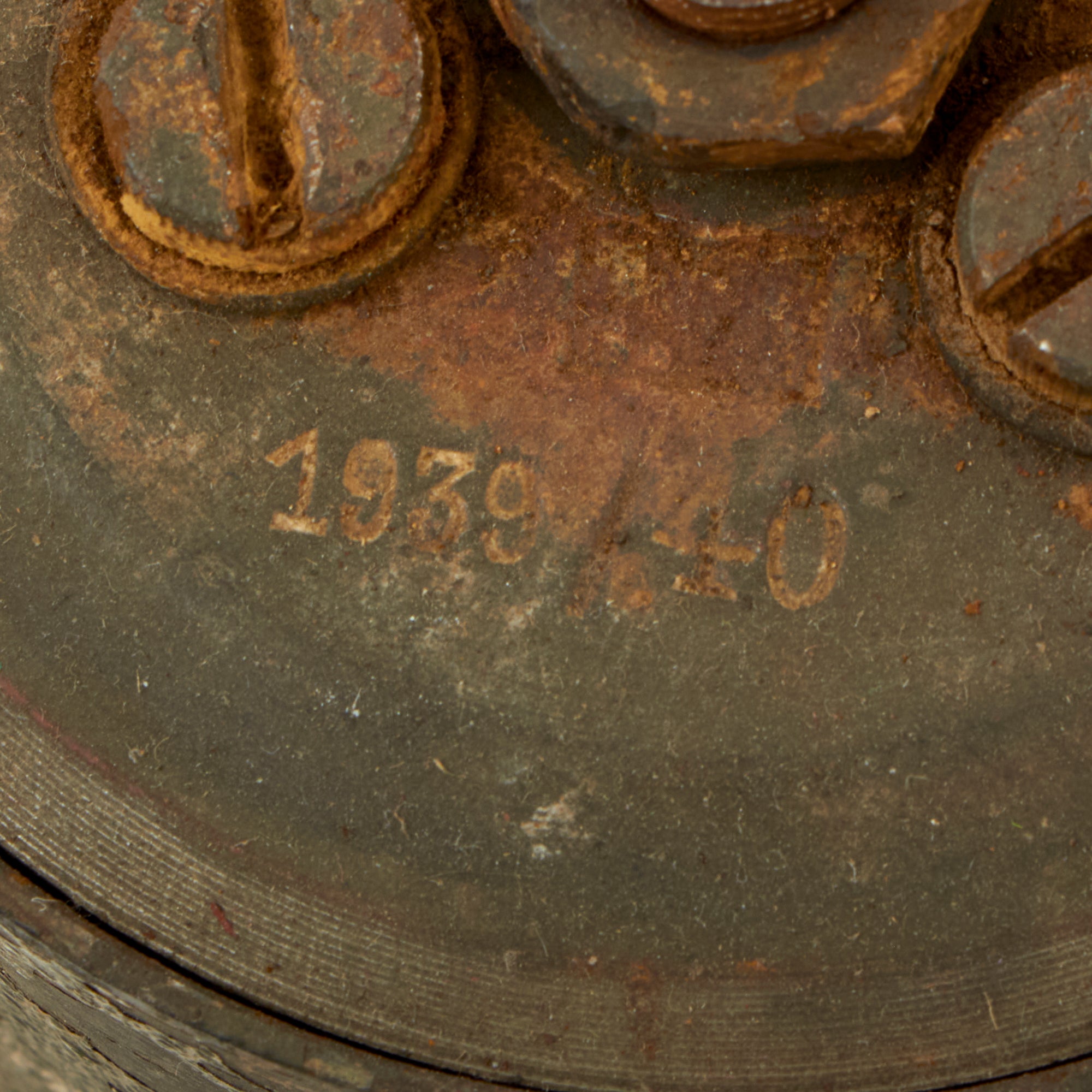 The mine looks to have not been repainted and is very well retained. It is marked on the top with 1939. Unfortunately the top has no legible maker marks. Another unfortunate aspect of this mine is that the top nut is frozen, not allowing you to remove it to inspect the interior. One would be able to loosen the nut though we left it in place as is.