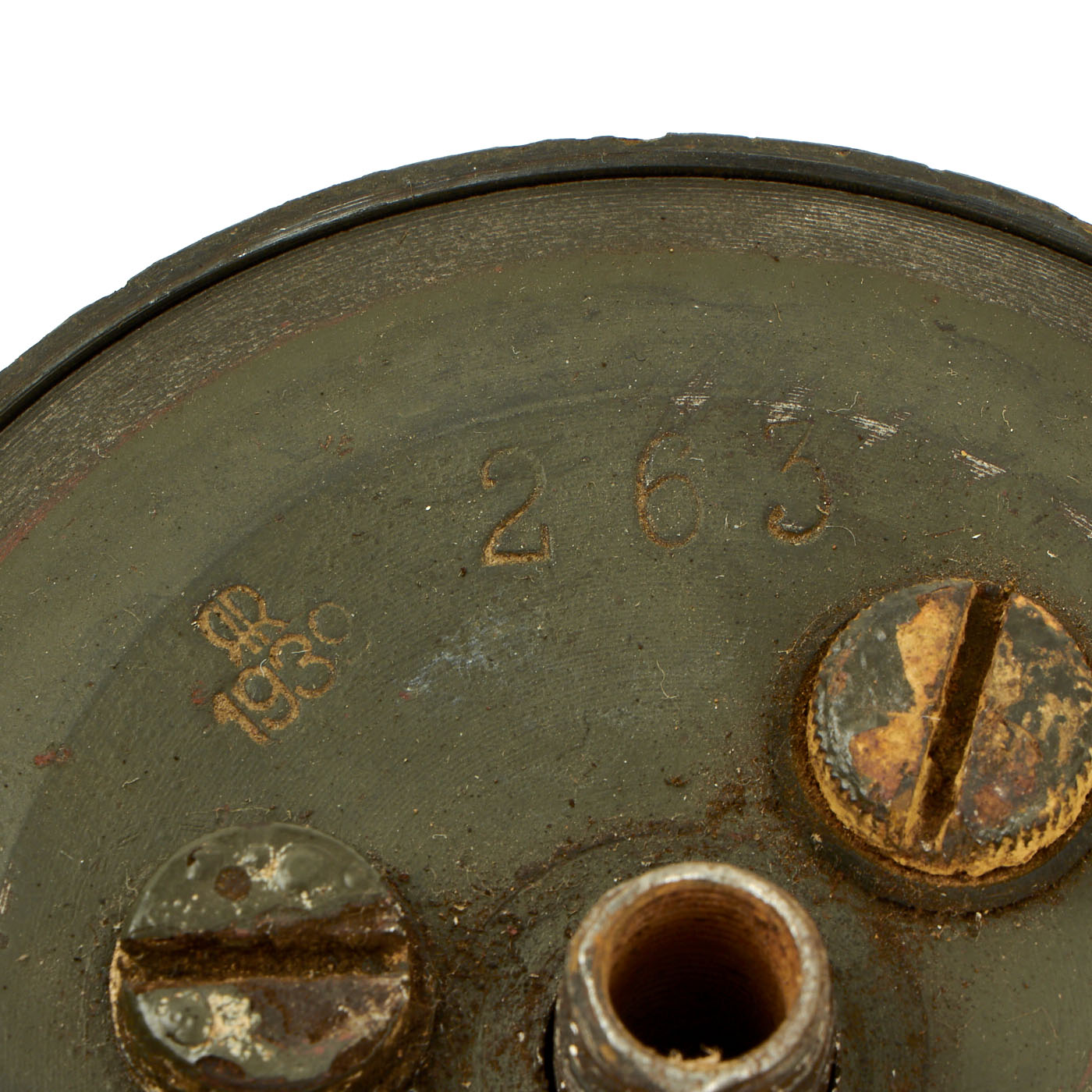 The mine bears original green on the body and on the top, which also shows some red primer. It is marked with ЯR / 1939 next to lot number 263 on the top, though there are no other inspection marks visible. The pressure fuze is also maker marked and dated ЯR 552 1939. These are the markings of manufacturer Richard Rinker G.m.b.H. in Menden/Iserlohn, and both have the early war "Reverse R" marking. This company was the original designer of the M24 stick grenade. Rinker also had many factories and subcontractors, which is what the number 552 may correspond to. Unfortunately this maker has as of yet not been identified.